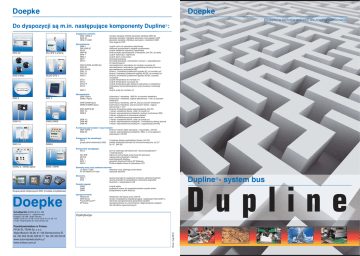 Doepke Doepke Eksperci w technice ochrony dla prądów różnicowych Do dyspozycji są m.in. następujące komponenty Dupline®: Urządzenia centralne: DKG 1/DKG 2 DKG 20 DKG 21-GSM DKG 20 DSS 2/4/8U DCI 3FB z anteną DLUX/ DTS 1 Wprowadzenia: DBM 1 DIR 2/DIR 2T DLUX DNP 8E DPM 1 DRD 3 DRT 1 DRT 2 DSS 2U/DSS 4U/DSS 8U DSS 4R DSS 4R-EIB DSU 1U DSU 2U DSU 8 DTS 1 DTS 2 DTS 2-P DTZ 4 DWS 1 DRD 3 DRT 2 Wprowadzenia: DDM 1Rplus DDMU 1Rplus DDM 2/DDM 2plus DDMU 2/DDMU 2plus DNP 8A/DPN 8A DRO 1U DRM 8 DSM 1U DSM 2/4M/8 DSM 1U DSM 4M DSM 4R enerator kanałów 24V DC/ generator kanałów 230V AC generator kanałów z Modbus sieciowym oraz zegarem DCF generator kanałów z Modbus sieciowym, modemem GSM oraz zegarem DCF czujnik ruchu do zabudowy natynkowej odbiornik podczerwieni/ nadajnik podczerwieni czujnik światła do zabudowy natynkowej binarna płytka wprowadzenia, 8-kanałowa, 24V DC, do tablic czujnik obecności, natynkowy czujnik dymu oraz pożaru termostat pokojowy termostat pokojowy z obniżeniem nocnym, z wyświetlaczem LC (dwuliniowym) wprowadzenia z przycisków do montażu w puszce p/t wprowadzenia z przycisków z sygnalizacją zwrotną oraz bus wprowadzenia z przycisków EIB binarny, 1-kanałowy przetwornik sygnału AC, do montażu p/t binarny, 2-kanałowy przetwornik sygnału AC/DC, do montażu p/t binarny, 8-kanałowy przetwornik sygnału AC/DC, budowa modułowa czujnik temperatury do montażu n/t czujnik temperatury na puszce p/t czujnik temperatury jako płytka do zabudowy w rozdzielnicy 4-kanałowy licznik taktów/godzin pracy budowy modułowej REG czujnik wody do montażu n/t ściemniacz 1-kanałowy , 600 VA, ze scenami świetlnymi ściemniacz 1-kanałowy, wyjście sterownicze 1-10V, ze scenami świetlnymi ściemniacz 2-kanałowy, 200 VA, bez/ze scenami świetlnymi ściemniacz 2-kanałowy, bez/ze scenami świetl., wyjścia sterownicze 1-10 V binarna, 8-kanałowa płytka wyprowadzenia, 24V DC 1-kanał. urządzenie sterow. uolet, do puszki p/t 8-kanał. wyprowadzenie przekaźnik. budowy modułowej, REG 4-kanał. urządzenie do sterowania roletami. bez/ z możliwością pozycjonowania lamel 1-kanał. urządzenie sterow. uolet, do puszki p/t 4-kanał. wyprowadzenie przekaźnik. z możliwością obsługi ręcznej 4-kanał. wyprowadzenie przekaźnik. z sygnalizacją zwrotną Kombinacja wprowadzeń i wyprowadzeń: DNP 4/DPN 4 binarne 4-kanał. płytki wprowadz. i wyprowadz., 24V DC DSM 4E 4-kanał. wyprowadzenie przekaźnik. 230V, z 4-ma wyjściami półprzewod. 24V DC DRO 1U DRM 8 Komponenty do wizualizacji: DDI 2 grupa paneli dotykowych DSC Komponenty sprzęgające: DCI 2 DCI 3FB DFA-DI DSI 1 DPG 1 DPK 2 DDMU 2 / DDMU 2plus SIWS / SIRW Doepke port do zdalnego sterowania wył. różnicowoprądowymi i nadmiarowymi złącze do komunikacji za pomocą fal radiowych napęd zdalny Dupline®, interface karta Dupline®-Modbus generator Dupline-Profibus-DP Gateway Profibus-Master-Karta do zabudowy w PC Elementy mocy oraz zasilacze sieciowe: LT 500/LT 1200 elementy mocy zdalnego ściemniania NT 24-250/NT 24-1300 zasilacze sieciowe Akcesoria: DHK 1 DTG Grupa paneli dotykowych DSC (modele przykładowe) 2-rzędowy display (wyświetlacz) tekstu, 24V DC panele dotykowe kolorowe lub monochromatyczne, od 3,7” do 15”, 24V DC Czujniki pogody: SIWS SIWR SIRW Oprogramowanie: Webserver DDE-Server ProLine/ProLineNG DP Camp Dupline®- system bus ręczny przyrząd do nadawania modułom adresów Dupline® ręczny przyrząd do sprawdzania i testowania sygnałów Dupline®, z wskaźnikiem LCD czujnik wiatru przekaźnik wiatru do wywartościowania czujnika wiatru podgrzewany czujnik deszczu Dupline Webserwer sterowany przez internet serwer kompatybilny (współpracujący) z aplikacjami Microsoft®-u darmowe oprogramowanie generatora kanałów oprogramowanie do uruchomienia i diagnozowania urządzeń dla ośrodków wypoczynkowych Schaltgeräte GmbH & Co. KG Przedstawicielstwo w Polsce: PPUH EL-TEAM Sp. z o.o. Aleja Młodych 26-28, 41-106 Siemianowice Śl. tel. /32/ 204 36 28, 229 03 71; fax /32/ 220 00 05 www.automatykabudynku.pl www.el-team.com.pl Dystrybucja: Druk: maj 2010 Stellmacherstraße 11 · 26506 Norden Postfach 100 168 · 26491 Norden Telefon (0 49 31) 18 06 - 0; Fax (0 49 31) 18 06 - 101 e-mail: [email protected]; www.doepke.de Doepke Doepke Dupline® - wypróbowany, innowacyjny system instalacyjny Dupline®-proste projektowanie i realizacja zastosowań Dlaczego Dupline®? Nadawanie adresów Jako wykonawca instalacji elektrycznej w sposób konwencjo- Przyporządkowanie sygnałów bus generatora kanałom wprowadzeń i wyprowadzeń następuje poprzez nadanie adresów (kodowanie) poszczególnym komponentom. Już przez kodowanie ustalone zostaje, które wejście łączy, które wyjście. Będące do dyspozycji 128 adresów (w 16 grupach od A do P, numerowane od 1 do 8) przyporządkowane zostają łatwym w obsłudze ręcznym przyrządem do kodowania DHK1. Kodowanie nie wymaga źródła napięcia ani sygnału bus a więc nastąpić może już w warsztacie. nalny nie można już dzisiaj wyróżnić się spośród instalatorów działających na rynku. Pracochłonne okablowanie, ograniczony zakres funkcjonalności i niedostateczna elastyczność w przypadku konieczności przeprowadzenia zmian – to tylko niektóre z niedogodności tradycyjnej instalacji. Klienci końcowi, którzy oczekują od swojego budynku funkcjonalności, dużej elastyczności w możliwościach dostosowania go do zmieniających się potrzeb oraz większego komfortu w jego użytkowaniu – nade wszystko oczekują jednak instalacji na miarę dzisiejszego stanu techniki. Z systemem Dupline® te oczekiwania zrealizujecie Państwo bez większego wysiłku. Filozofia Od czasu kiedy firma Carlo Gavazzi w 1985 roku stworzyła system Dupline®, łatwość jego stosowania była zawsze na pierwszym planie. Niepotrzebne miały być żadne mozolne szkolenia czy nawet dyplomy, aby można było zaprojektować, zrealizować i serwisować ten wygodny 