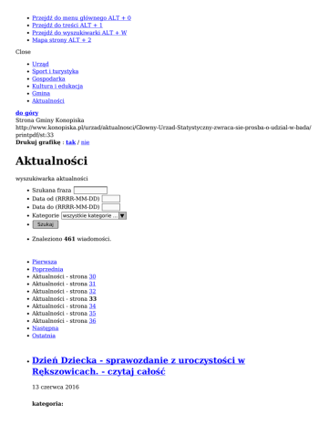 Przejdź do menu głównego ALT + 0 Przejdź do treści ALT + 1 Przejdź do wyszukiwarki ALT + W Mapa strony ALT + 2 Close Urząd Sport i turystyka Gospodarka Kultura i edukacja Gmina Aktualności do góry Strona Gminy Konopiska http://www.konopiska.pl/urzad/aktualnosci/Glowny-Urzad-Statystyczny-zwraca-sie-prosba-o-udzial-w-bada/ printpdf/st:33 Drukuj grafikę : tak / nie Aktualności wyszukiwarka aktualności Szukana fraza Data od (RRRR-MM-DD) Data do (RRRR-MM-DD) Kategorie wszystkie kategorie ... ▼ Szukaj Znaleziono 461 wiadomości. Pierwsza Poprzednia Aktualności - strona 30 Aktualności - strona 31 Aktualności - strona 32 Aktualności - strona 33 Aktualności - strona 34 Aktualności - strona 35 Aktualności - strona 36 Następna Ostatnia Dzień Dziecka - sprawozdanie z uroczystości w Rększowicach. - czytaj całość 13 czerwca 2016 kategoria: Kultura i Edukacja Jest taki dzień w roku, w którym każde dziecięce marzenie ma szansę się spełnić. Trzeba tylko mocno chcieć i każda fantazja się ziści. Dzień Dziecka to wyjątkowa okazja dla rodziców by spędzili dodatkowy czas ze swoimi dziećmi, składali im życzenia oraz obdarowywali swe pociechy licznymi prezentami. Dzień Dziecka - sprawozdanie z uroczystości w R Dzień Dziecka - sprawozdanie z uroczystości w Rększowicach. - czytaj całość Międzyszkolny konkurs satyryczny - rysunek humorystyczny edycja 2016 rozstrzygnięty. - czytaj całość 13 czerwca 2016 kategoria: Kultura i Edukacja W czerwcu 2016 r. rozstrzygnięto konkurs satyryczny na najciekawszy rysunek humorystyczny. Organizatorem konkursu po raz trzeci była Szkoła Podstawowa im. Marii Konopnickiej w JamkachKorzonku. Międzyszkolny konkurs satyryczny - rysunek humory Międzyszkolny konkurs satyryczny - rysunek humorystyczny edycja 2016 rozstrzygnięty. - czytaj całość Finał XXIII Regionalnego Przeglądu Pieśni im. prof. Adolfa Dygacza „Śląskie Śpiewanie” - czytaj całość 13 czerwca 2016 kategoria: Kultura i Edukacja Sukces zespołów ludowych z Gminy Konopiska! Po raz 23 odbył się Regionalny Przegląd Pieśni im. profesora Adolfa Dygacza „Śląskie Śpiewanie”. Eliminacje rejonowe odbywały się w 9 różnych miastach naszego regionu w kwietniu i maju. W tegorocznej edycji w sumie uczestniczyło 177 podmiotów wykonawczych, tj. ok. 1370 uczestników. Finał XXIII Regionalnego Przeglądu Pieśni im. p Finał XXIII Regionalnego Przeglądu Pieśni im. prof. Adolfa Dygacza „Śląskie Śpiewanie” - czytaj całość Dzień Europejski w szkole w Aleksandrii z wykorzystaniem... urządzeń mobilnych - czytaj całość 12 czerwca 2016 kategoria: Kultura i Edukacja 31 maja 2016r. w szkole obchodziliśmy Dzień Europejski. Tego dnia odbyła się sama uroczystość, natomiast obchody rocznicy powstania idei prowadzących później do powstania Unii Europejskiej rozpoczęliśmy wcześniej, 25 maja. Na uczniów, którzy przyszli tego dnia do szkoły czekał „zakodowany” konkurs. Dzień Europejski w szkole w Aleksandrii z wykorzy Dzień Europejski w szkole w Aleksandrii z wykorzystaniem... urządzeń mobilnych - czytaj całość „Urodziny przedszkolaków z Publicznego Przedszkola w Konopiskach” - czytaj całość 12 czerwca 2016 kategoria: Kultura i Edukacja Od kilku lat w czerwcu tradycją stały się wspólne urodziny wszystkich przedszkolaków z Publicznego Przedszkola w Konopiskach. Najbardziej odpowiednim miejscem na taką okazję jest z pewnością Fabryka Uśmiechu w Częstochowie. „Urodziny przedszkolaków z Publicznego Przedszk „Urodziny przedszkolaków z Publicznego Przedszkola w Konopiskach” - czytaj całość RODZINNY FESTYN 2016 - czytaj całość 11 czerwca 2016 kategoria: Kultura i Edukacja 4 czerwca 2016 r. zorganizowaliśmy rodzinny festyn, do którego przygotowania rozpoczęliśmy w miesiącu styczniu. Wspólnie z rodzicami naszych uczniów ustaliliśmy, iż w czerwcu zorganizujemy na sportowo festyn rodzinny. Nauczyciel w-f wspólnie z uczniami ustalił, jakie konkurencje sportowe będą przeprowadzone w ramach festynu. RODZINNY FESTYN 2016 RODZINNY FESTYN 2016 - czytaj całość Obwieszczenie - czytaj całość 10 czerwca 2016 kategoria: Urząd Obwieszczenie Starosty Powiatu w Gliwicach, znak WOŚ.6540.00004.2016 z dnia 06.06.2016r. Obwieszczenie Obwieszczenie - czytaj całość Obwieszczenie - czytaj całość 10 czerwca 2016 kategoria: Urząd Obwieszczenie Starosty Powiatu w Gliwicach, znak WOŚ.6540.00004.2016 z dnia 03.06.2016r Obwieszczenie Obwieszczenie - czytaj całość Stowarzyszenia po nowemu - czytaj całość 10 czerwca 2016 kategoria: Urząd Sejm Rzeczypospolitej Polskiej w dniu 25 września 2015 r. uchwalił ustawę o zmianie ustawy – Prawo o stowarzyszeniach oraz niektórych innych ustaw. Prezydent RP nowelizację ustawy o stowarzyszeniach podpisał 26 października 2015r. Od wejścia w życie nowych przepisów (20.05.2016 r.) rejestracja i funkcjonowanie stowarzyszeń są znacznie uproszczone. Stowarzyszenia po nowemu Stowarzyszenia po nowemu - czytaj całość SPARTAKIADA GMIN POWIATU CZĘSTOCHOWSKIEGO czytaj całość 10 czerwca 2016 kategoria: Sport i Turystyka SPARTAKIADA GMIN POWIATU CZĘSTOCHOWSKIEGO połączona z WOJEWÓDZKIMI UROCZYSTOŚCIAMI 70-lecia LZS - 11.06.2016r Kompleks Rekreacyjno – Sportowy PAJĄK w Konopiskach ul. Sportowa 60 SPARTAKIADA GMIN POWIATU CZĘSTOCHOWSKIEGO SPARTAKIADA GMIN POWIATU CZĘSTOCHOWSKIEGO - czytaj całość Pierwsza Poprzednia Aktualności - strona 30 Aktualności - strona 31 Aktualności - strona 32 Aktualności - strona 33 Aktualności - strona 34 Aktualności - strona 35 Aktualności - strona 36 Następna Ostatnia