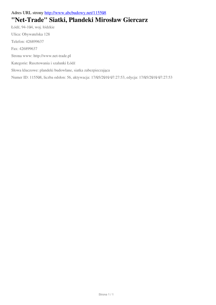 "Net-Trade" Siatki, Plandeki Miroslaw Giercarz, Lodz, Obywatelska
