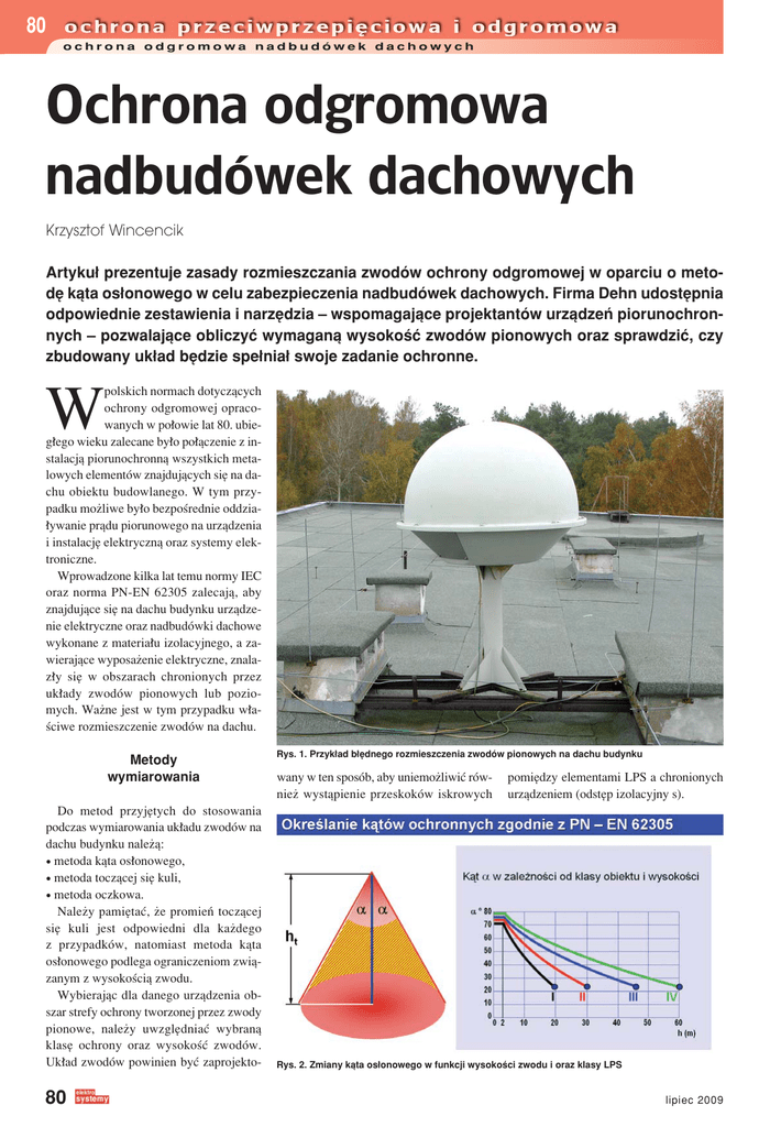 80 ochrona odgromowa nadbudÛwek dachowych Ochrona odgromowa nadbudówek dachowych Krzysztof Wincencik Artyku≥ prezentuje zasady rozmieszczania zwodÛw ochrony odgromowej w oparciu o metodÍ kπta os≥onowego w celu zabezpieczenia nadbudÛwek dachowych. Firma Dehn udostÍpnia odpowiednie zestawienia i narzÍdzia ñ wspomagajπce projektantÛw urzπdzeÒ piorunochronnych ñ pozwalajπce obliczyÊ wymaganπ wysokoúÊ zwodÛw pionowych oraz sprawdziÊ, czy zbudowany uk≥ad bÍdzie spe≥nia≥ swoje zadanie ochronne. W polskich normach dotyczπcych ochrony odgromowej opracowanych w po≥owie lat 80. ubieg≥ego wieku zalecane by≥o po≥πczenie z instalacjπ piorunochronnπ wszystkich metalowych elementÛw znajdujπcych siÍ na dachu obiektu budowlanego. W tym przypadku moøliwe by≥o bezpoúrednie oddzia≥ywanie prπdu piorunowego na urzπdzenia i instalacjÍ elektrycznπ oraz systemy elektroniczne. Wprowadzone kilka lat temu normy IEC oraz norma PN-EN 62305 zalecajπ, aby znajdujπce siÍ na dachu budynku urzπdzenie elektryczne oraz nadbudÛwki dachowe wykonane z materia≥u izolacyjnego, a zawierajπce wyposaøenie elektryczne, znalaz≥y siÍ w obszarach chronionych przez uk≥ady zwodÛw pionowych lub poziomych. Waøne jest w tym przypadku w≥aúciwe rozmieszczenie zwodÛw na dachu. Metody wymiarowania Do metod przyjÍtych do stosowania podczas wymiarowania uk≥adu zwodÛw na dachu budynku naleøπ: ï metoda kπta os≥onowego, ï metoda toczπcej siÍ kuli, ï metoda oczkowa. Naleøy pamiÍtaÊ, øe promieÒ toczπcej siÍ kuli jest odpowiedni dla kaødego z przypadkÛw, natomiast metoda kπta os≥onowego podlega ograniczeniom zwiπzanym z wysokoúciπ zwodu. Wybierajπc dla danego urzπdzenia obszar strefy ochrony tworzonej przez zwody pionowe, naleøy uwzglÍdniaÊ wybranπ klasÍ ochrony oraz wysokoúÊ zwodÛw. Uk≥ad zwodÛw powinien byÊ zaprojekto- 80 Rys. 1. Przyk≥ad b≥Ídnego rozmieszczenia zwodÛw pionowych na dachu budynku wany w ten sposÛb, aby uniemoøliwiÊ rÛwnieø wystπpienie przeskokÛw iskrowych pomiÍdzy elementami LPS a chronionych urzπdzeniem (odstÍp izolacyjny s). Rys. 2. Zmiany kπta os≥onowego w funkcji wysokoúci zwodu i oraz klasy LPS lipiec 2009 81 ochrona odgromowa nadbudÛwek dachowych Metoda kπta os≥onowego Rys. 3. Strefy os≥onowe dla chronionych urzπdzeÒ Przy stosowaniu metody kπta os≥onowego norma PN-EN62305 w za≥πczniku A (normatywnym) podaje dwa waøne z punktu widzenia projektanta zapisy: ï rozmieszczenie zwodÛw jest uznane za odpowiednie, jeøeli obiekt poddawany ochronie jest usytuowany ca≥kowicie w przestrzeni chronionej utworzonej przez uk≥ad zwodÛw, ï do okreúlenia chronionej przestrzeni powinny byÊ brane pod uwagÍ jedynie rzeczywiste fizyczne wymiary uk≥adu metalowych zwodÛw. Norma nie przewiduje wiÍc Ñcudownychî parasoli os≥onowych, a jedynie wykorzystanie rzeczywistej wysokoúci zwodu do okreúlenia strefy os≥onowej. W przypadku stosowania uk≥adu dwu lub wiÍcej zwodÛw naleøy rÛwnieø uwzglÍdniÊ g≥ÍbokoúÊ wnikania kuli w strefÍ os≥onowπ. NarzÍdzia wspomagajπce Rys. 4. Tworzenie stref os≥onowych przez uk≥ad dwÛch zwodÛw pionowych Aby wspomÛc projektantÛw urzπdzeÒ piorunochronnych opublikowano zestawienia dotyczπce kπtÛw os≥onowych i g≥Íbokoúci wnikania kuli piorunowej (w zaleønoúci od wysokoúci zwodu i klasy LPS). Tabele te moøna znaleüÊ w druku DS151 prezentujπcym kompleksowπ ofertÍ firmy Dehn w zakresie ochrony odgromowej z wykorzystaniem systemu DEHN-ISO-Combi oraz przewodÛw HVI-L. DostÍpne sπ rÛwnieø proste szablony (arkusz Excel) wspomagajπce projektanta w zakresie doboru wysokoúci i rozmieszczenia zwodÛw pionowych dla metody kπta os≥onowego i toczπcej siÍ kuli. Podajπc klasÍ ochrony, wysokoúÊ zwodu oraz wymiary geometryczne chronionego urzπdzenia projektant otrzymuje informacjÍ, czy zastosowany zwÛd pionowy zapewni, øe urzπdzenie znajdzie siÍ w strefie os≥onowej. Krzysztof Wincencik Autor jest dyrektorem technicznym firmy Dehn Polska DEHN Polska Sp. z o.o. ul. Poleczki 23 02-822 Warszawa tel./fax (22) 335 24 66 do 69 Rys. 5. PrzestrzeÒ chroniona przez uk≥ad zwodÛw pionowych z uwzglÍdnieniem g≥Íbokoúci wnikania kuli piorunowej www.dehn.pl 81