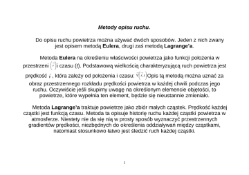 Metody opisu ruchu. Do opisu ruchu powietrza można używać dwóch sposobów. Jeden z nich zwany jest opisem metodą Eulera, drugi zaś metodą Lagrange’a. Metoda Eulera na określeniu właściwości powietrza jako funkcji położenia w przestrzeni r i czasu (t). Podstawową wielkością charakteryzującą ruch powietrza jest → prędkość V , która zależy od położenia i czasu: → → → V r , t Opis tą metodą można uznać za obraz przestrzennego rozkładu prędkości powietrza w każdej chwili podczas jego ruchu. Oczywiście jeśli skupimy uwagę na określonym elemencie objętości, to powietrze, które wypełnia ten element, będzie się nieustannie zmieniało. Metoda Lagrange’a traktuje powietrze jako zbiór małych cząstek. Prędkość każdej cząstki jest funkcją czasu. Metoda ta opisuje historię ruchu każdej cząstki powietrza w atmosferze. Niestety nie da się nią w prosty sposób wyznaczyć przestrzennych gradientów prędkości, niezbędnych do określenia oddziaływań między cząstkami, natomiast stosunkowo łatwo jest śledzić ruch każdej cząstki. 1 Analiza skali. Analiza skali, lub skalowanie, jest wygodną techniką szacowania wielkości wyrażeń w równaniach opisujących określone typy ruchu. W skalowaniu określone są charakterystyczna długość, głębokość i skale czasu, w których zachodzą przepływy które chcemy opisać oraz charakterystyczne zakresy zmienności pól (temperatury, ciśnienia, prędkości i.t.p.) obserwowane w tych skalach. Te typowe wartości są następnie użyte do porównania wielkości różnych wyrażeń w równaniach ruchu . Charakter przepływów atmosferycznych silnie zależy od skali poziomej, skala ta stanowi wygodne narzędzie klasyfikacji układów. Typy przepływów Skala pozioma (m) Średnia droga swobodna.....................................................10-7 Przepływy bezwirowe (laminarne).......................................10-3 Najmniejsze wiry..............................................................10-2-10-1 Małe wiry..........................................................................10-1-1 Zawirowania unoszące kurz czy piasek.............................1-10 Podmuchy wiatru..............................................................10-102 Tornada...............................................................................102 Chmury cumulonimbus........................................................103 Fronty, linie szkwałowe........................................................104 Huragany..........................................................................105-106 Niże i wyże...........................................................................106 Cyrkulacja globalna..............................................................107 2 Siła gradientu ciśnienia. Ciśnienie wywierane na powierzchnię cząstki powietrza zdefiniowane jest jako składowa normalna siły wywieranej przez jej otoczenie, przypadająca na jednostkę pola powierzchni. Ta siła skierowana jest zawsze do wnętrza cząstki, co ilustruje poniższy rysunek: 3 Cząstka dozna oddziaływania siły wypadkowej tylko wówczas, gdy ciśnienia na jej przeciwległych powierzchniach nie będą równe. Tę siłę nazywa się siłą gradientu ciśnienia. Całkowity gradient ciśnienia na jednostkę masy wyraża się wzorem: → F = m 1→ ∇ p, ρ gdzie: ρ - gęstość powietrza, p – pole ciśnienia w atmosferze. Siła ta jest proporcjonalna do gradientu ciśnienia, a nie samego ciśnienia. 4 Siła grawitacji Jeżeli masę Ziemi oznaczymy przez M, a m będzie elementem masy atmosfery, wtedy siła wywierana na jednostkę masy atmosfery przez przyciąganie grawitacyjne Ziemi będzie: → Fg m → GM r . 2 r r → ∗ ≡g = W meteorologii dynamicznej zwykło się używać jako współrzędnej pionowej wysokości nad poziomem morza. Średni promień Ziemi jest oznaczony przez a, a odległość nad średnim poziomem morza przez z, wtedy zaniedbując niewielkie odchylenie kształtu Ziemi od kulistości, r = a + z. Zatem dany wzór możemy zapisać jako: → ∗ 0 → ∗ g , g = 2 (1 + z a ) gdzie → ∗ 0 g = ( → r GM a 2 r ) jest wartością siły grawitacyjnej na średnim poziomie morza. Dla zastosowań meteorologicznych z << a , więc z pomijalnym błędem można założyć → ∗ → ∗ 0 g = g i traktować siłę grawitacyjną jako stałą. 5 Siła tarcia. Między atmosferą i powierzchnia Ziemi występuje znaczna siła tarcia. Wiadomym jest, że na przykład podłoże wywiera hamujący wpływ na najniższe warstwy poruszającego się nad nim powietrza. Nieregularności powierzchni Ziemi czasami uwydatniają to wyraźniej: wiemy, że szeregi wysokich drzew sadzi się po to, aby osłabić niepożądane wiatry i zmniejszyć ich niszczycielski wpływ na uprawy. Siła tarcia może występować również między cząsteczką powietrza i jej otoczeniem. Każda rzeczywista ciecz podlega wewnętrznemu tarciu (lepkości), które przeciwstawia się skłonności do przepływu. płynu przeciwnie do gradientu jej koncentracji. W tych przypadkach transport nazywa się dyfuzją molekularną. Dyfuzja molekularna działa zawsze by zredukować nieregularności w polu ulegającemu dyfuzji. Siłę tarcia możemy obliczać rozpatrując różniczkę elementu objętości płynu o bokach δxδyδz , co przedstawia poniższy rysunek. 6 Jeśli naprężenie styczne działające w kierunku x bezpośrednio w centrum tego elementu oznaczymy przez τ , wtedy naprężenie działające wzdłuż górnej granicy na poniższą ciecz może być w przybliżeniu zapisane jako: zx τ zx + ∂τ zx δz , ∂z 2 podczas gdy naprężenie działające wzdłuż dolnej granicy na powyższą ciecz wynosi: τ zx ∂τ zx δz . ∂z 2 Wypadkowa siła tarcia działająca w kierunku x na element objętości jest sumą tych dwóch naprężeń, czyli równa się: ∂τ δz τ zx + zx δyδx ∂z 2 τ zx ∂τ zx δz δyδx . ∂z 2 Stąd możemy 