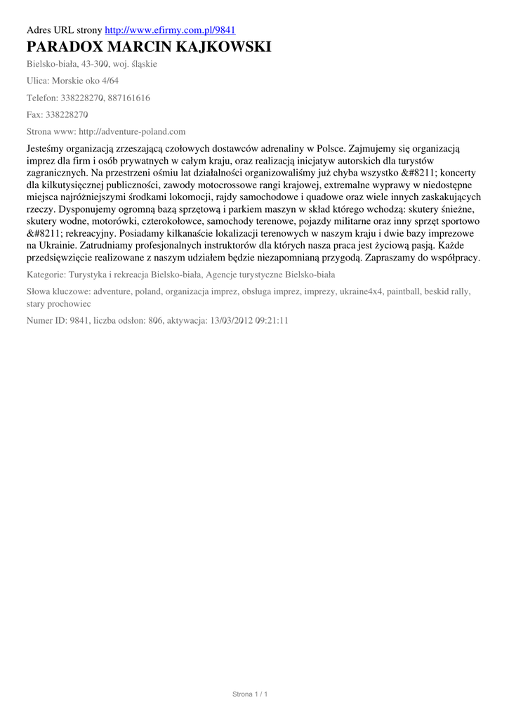 Adres URL strony http://www.efirmy.com.pl/9841 PARADOX MARCIN KAJKOWSKI Bielsko-biała, 43-300, woj. śląskie Ulica: Morskie oko 4/64 Telefon: 338228270, 887161616 Fax: 338228270 Strona www: http://adventure-poland.com Jesteśmy organizacją zrzeszającą czołowych dostawców adrenaliny w Polsce. Zajmujemy się organizacją imprez dla firm i osób prywatnych w całym kraju, oraz realizacją inicjatyw autorskich dla turystów zagranicznych. Na przestrzeni ośmiu lat działalności organizowaliśmy już chyba wszystko – koncerty dla kilkutysięcznej publiczności, zawody motocrossowe rangi krajowej, extremalne wyprawy w niedostępne miejsca najróżniejszymi środkami lokomocji, rajdy samochodowe i quadowe oraz wiele innych zaskakujących rzeczy. Dysponujemy ogromną bazą sprzętową i parkiem maszyn w skład którego wchodzą: skutery śnieżne, skutery wodne, motorówki, czterokołowce, samochody terenowe, pojazdy militarne oraz inny sprzęt sportowo – rekreacyjny. Posiadamy kilkanaście lokalizacji terenowych w naszym kraju i dwie bazy imprezowe na Ukrainie. Zatrudniamy profesjonalnych instruktorów dla których nasza praca jest życiową pasją. Każde przedsięwzięcie realizowane z naszym udziałem będzie niezapomnianą przygodą. Zapraszamy do współpracy. Kategorie: Turystyka i rekreacja Bielsko-biała, Agencje turystyczne Bielsko-biała Słowa kluczowe: adventure, poland, organizacja imprez, obsługa imprez, imprezy, ukraine4x4, paintball, beskid rally, stary prochowiec Numer ID: 9841, liczba odsłon: 806, aktywacja: 13/03/2012 09:21:11 Strona 1 / 1