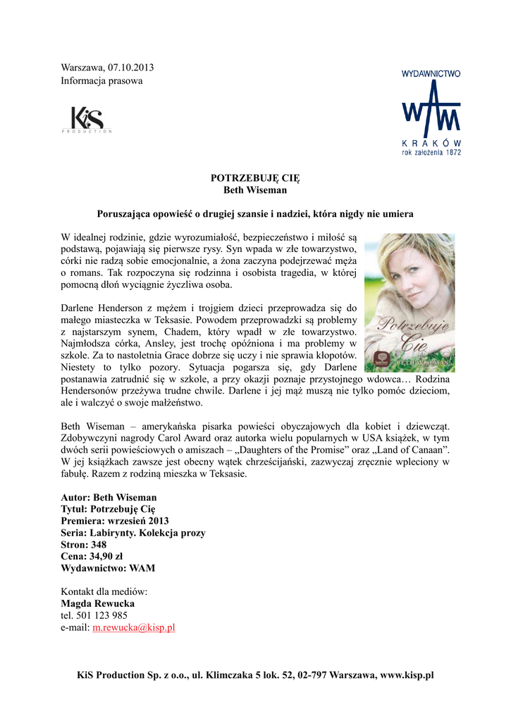 Warszawa, 07.10.2013 Informacja prasowa POTRZEBUJĘ CIĘ Beth Wiseman Poruszająca opowieść o drugiej szansie i nadziei, która nigdy nie umiera W idealnej rodzinie, gdzie wyrozumiałość, bezpieczeństwo i miłość są podstawą, pojawiają się pierwsze rysy. Syn wpada w złe towarzystwo, córki nie radzą sobie emocjonalnie, a żona zaczyna podejrzewać męża o romans. Tak rozpoczyna się rodzinna i osobista tragedia, w której pomocną dłoń wyciągnie życzliwa osoba. Darlene Henderson z mężem i trojgiem dzieci przeprowadza się do małego miasteczka w Teksasie. Powodem przeprowadzki są problemy z najstarszym synem, Chadem, który wpadł w złe towarzystwo. Najmłodsza córka, Ansley, jest trochę opóźniona i ma problemy w szkole. Za to nastoletnia Grace dobrze się uczy i nie sprawia kłopotów. Niestety to tylko pozory. Sytuacja pogarsza się, gdy Darlene postanawia zatrudnić się w szkole, a przy okazji poznaje przystojnego wdowca… Rodzina Hendersonów przeżywa trudne chwile. Darlene i jej mąż muszą nie tylko pomóc dzieciom, ale i walczyć o swoje małżeństwo. Beth Wiseman – amerykańska pisarka powieści obyczajowych dla kobiet i dziewcząt. Zdobywczyni nagrody Carol Award oraz autorka wielu popularnych w USA książek, w tym dwóch serii powieściowych o amiszach – „Daughters of the Promise” oraz „Land of Canaan”. W jej książkach zawsze jest obecny wątek chrześcijański, zazwyczaj zręcznie wpleciony w fabułę. Razem z rodziną mieszka w Teksasie. Autor: Beth Wiseman Tytuł: Potrzebuję Cię Premiera: wrzesień 2013 Seria: Labirynty. Kolekcja prozy Stron: 348 Cena: 34,90 zł Wydawnictwo: WAM Kontakt dla mediów: Magda Rewucka tel. 501 123 985 e-mail: [email protected] KiS Production Sp. z o.o., ul. Klimczaka 5 lok. 52, 02-797 Warszawa, www.kisp.pl