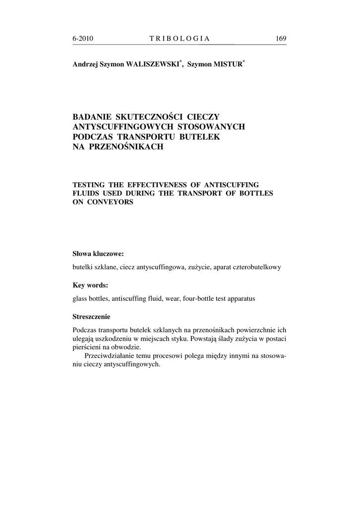 6-2010 TRIBOLOGIA 169 Andrzej Szymon WALISZEWSKI*, Szymon MISTUR* BADANIE SKUTECZNOŚCI CIECZY ANTYSCUFFINGOWYCH STOSOWANYCH PODCZAS TRANSPORTU BUTELEK NA PRZENOŚNIKACH TESTING THE EFFECTIVENESS OF ANTISCUFFING FLUIDS USED DURING THE TRANSPORT OF BOTTLES ON CONVEYORS Słowa kluczowe: butelki szklane, ciecz antyscuffingowa, zużycie, aparat czterobutelkowy Key words: glass bottles, antiscuffing fluid, wear, four-bottle test apparatus Streszczenie Podczas transportu butelek szklanych na przenośnikach powierzchnie ich ulegają uszkodzeniu w miejscach styku. Powstają ślady zużycia w postaci pierścieni na obwodzie. Przeciwdziałanie temu procesowi polega między innymi na stosowaniu cieczy antyscuffingowych. 170 TRIBOLOGIA 6-2010 W artykule przedstawiono oryginalną metodę badania skuteczności działania takich cieczy oraz zamieszczono wyniki badań porównawczych dla kilku z nich. Wykazano przydatność zaprojektowanego stanowiska do badania zużycia. Stanowisko to nazwano „aparatem czterobutelkowym”. WPROWADZENIE Butelki szklane wykorzystywane w przemyśle piwowarskim podlegają procesowi mycia. Stosuje się do tego celu wodny roztwór wodorotlenku sodu, czyli ług sodowy. Ma on zarówno dobre właściwości myjące, jak i sterylizujące. Wykazuje jednak działanie żrące na powierzchniach butelek, czego efektem jest korozja alkaliczna szkła. Takie oddziaływania korozyjne wspomagane są ocieraniem się butelek podczas ich transportu na przenośnikach poprzez odsłanianie kolejnych warstewek szkła. W efekcie na walcowych powierzchniach butelek, w miejscach ich wzajemnego kontaktowania się, powstają ślady zużycia w postaci chropowatych pierścieni pogarszających wygląd estetyczny butelek. Butelki takie są eliminowane z dalszej ich eksploatacji. Taki rodzaj zużycia, wynikający z łącznych oddziaływań chemicznych i fizycznych, nazywany jest w tribologii szkła scuffingiem [L. 1] (w tribologii materiałów metalicznych pod terminem „scuffing” rozumie się zużycie, na które składają się elementy zużycia ściernego i adhezyjnego [L. 2]). Przeciwdziałanie korozji alkalicznej szkła polega między innymi na stosowaniu cieczy myjąco-dezynfekująco-smarujących o odpowiednim składzie [L. 3]. Intensywność korozji alkalicznej zależy od ilości alkaliów w mieszance szklanej. Stąd też butelki wykonane z różnych mieszanek mogą mieć różną odporność na scuffing. Do oceny efektywności omawianych cieczy, jak i odporności butelek na zużycie, zaproponowano szybki test wykonywany na specjalnie zaprojektowanym aparacie, nazwanym „aparatem czterobutelkowym”, dostosowanym do badania butelek. Celem prezentowanej pracy była ocena przydatności proponowanego testu do badania skuteczności cieczy antyscuffingowych. Wysunięto hipotezę, że ciecze o różnym składzie będą zapobiegały zużyciu po- 6-2010 TRIBOLOGIA 171 wierzchni butelek, zachodzącemu podczas prób na aparacie czterobutelkowym, w różnym stopniu. METODYKA BADAŃ Opis stanowiska badawczego i sposób pomiaru zużycia Schemat zaprojektowanego stanowiska pomiarowego przedstawiono na Rys. 1. Do metalowej podstawy przyspawano trzy tuleje osadcze 7 dla butelek dolnych, rozmieszczone wokół osi co 120°. Do tych butelek dociskana jest siłą G butelka górna 5, zamocowana do góry dnem w uchwycie 6 obracanym wraz z tą butelką przez silnik 1. Butelka ta może przemieszczać się swobodnie wzdłuż osi pionowej wraz z prętem 2. Całość umieszczona jest w zbiorniku z badaną cieczą. Butelki dolne mają punkty styku z butelką górną w płaszczyźnie A-A. W punktach tych, podczas obrotu butelki górnej, następuje zużycie powierzchni butelek. Na powierzchniach butelek nieruchomych powstają ślady zużycia w kształcie małych elips. Osie tych elips mierzy się lupą Brinella i na ich podstawie oblicza się pola powierzchni elips, które są miarą zużycia. Informacja o obiektach badań i warunki pomiaru Do prób tarcia używano znormalizowanych butelek typu „Gold 500" o ciężarze 320G±14G [L. 4] oraz butelek „Ufoludek 500” o ciężarze 380G±14G, [L. 5]. Badaniom podlegały następujące ciecze: – woda z sieci miejskiej, – ług sodowy 2%, – roztwór o składzie: 10 litrów wody, 200g sody kaustycznej, 20 ml preparatu zapobiegającego scuffingowi. Preparat antyscuffingowy jest skoncentrowany, płynny, wspomaga własności myjące ługu sodowego i zmniejsza jego agresywność w stosunku do szkła butelkowego. Zawiera środki kompleksujące, dyspergujące, powierzchniowo czynne i przeciwpienne [L. 6]. W jego skład wchodzą m.in.: – niejonowe środki powierzchniowo czynne 5–15%, – wersenian czterosodowy <5%, – fosfoniany 5–15%. 172 TRIBOLOGIA 6-2010 Rys. 1. Schemat stanowiska badawczego (aparat czterobutelkowy): 1 – silnik, 2 – pręt o swobodnym ruchu pionowym, 3 – podstawa, 4 – uchwyt mocujący, 5 – butelka ruchoma, 6 – butelki nieruchome, 7 – tuleje osadcze, 8 – pojemnik na ciecz, G – siła obciążająca, A-A – płaszczyzna występowania styków butelek Fig. 1. Measurement system (four-bottle test apparatus ) : 1 – electric motor, 2 – rod of free vertical movement, 3 – base, 4 – turning handle, 5 – turning bottle, 6 – fixed bottles, 7 – snap bushings, 8 – fluid container, G – applied force, A-A – plane of the bottles contacts W celach porównawczych przeprowadzano również próby zużycia na butelkach suchych, bez stosowania cieczy. Butelka górna była obracana z prędkością n = 60 obr./min, a siła przekazywana przez nią na butelki dolne wynosiła: 39,24 [N] – w przypadku butelki typu Ufoludek 500 i 38,45 [N] – w przypadku butelki typu Gold 500. Różnice wynikały z różnic ciężarów samych butelek. Czasy prowadzenia prób tarcia wynosiły: 2, 4, 8, 16 i 32 minuty. Początkowa temperatura badanych cieczy wynosiła 21°C. Aby po każdej wykonanej próbie nie wymieniać butelek na nowe, wykorzystano je, obracają