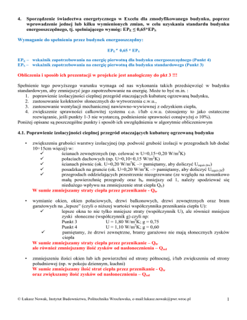 4. Sporządzenie świadectwa energetycznego w Excelu dla zmodyfikowanego budynku, poprzez wprowadzenie jednej lub kilku wymienionych zmian, w celu uzyskania standardu budynku energooszczędnego, tj. spełniającego wymóg: EPE ≤ 0,65*EPS Wymaganie do spełnienia przez budynek energooszczędny: EPE ≤ 0,65 * EPS EPE – wskaźnik zapotrzebowania na energię pierwotną dla budynku energooszczędnego (Punkt 4) EPS – wskaźnik zapotrzebowania na energię pierwotną dla budynku standardowego (Punkt 3) Obliczenia i sposób ich prezentacji w projekcie jest analogiczny do pkt 3 !!! Spełnienie tego powyŜszego warunku wymaga od nas wykonania takich przedsięwzięć w budynku standardowym, aby zmniejszyć jego zapotrzebowanie na energię. MoŜe to być m.in. : 1. poprawienie izolacyjności cieplnej przegród otaczających kubaturę ogrzewaną budynku, 2. zastosowanie kolektorów słonecznych do wytworzenia c.w.u., 3. zastosowanie wentylacji mechanicznej nawiewno-wywiewnej z odzyskiem ciepła, 4. zwiększenie sprawności całkowitej systemu c.o. i/lub c.w.u. (stosujemy to jako ostateczne rozwiązanie, jeśli punkty 1-3 nie wystarczą, podniesienie sprawności conajwyŜej o 10%). PoniŜej opisane są poszczególne punkty i sposób ich uwzględnienia w algorytmie obliczeniowym 4.1. Poprawienie izolacyjności cieplnej przegród otaczających kubaturę ogrzewaną budynku • zwiększeniu grubości warstwy izolacyjnej (np. podwoić grubość izolacji w przegrodach lub dodać 10÷15cm więcej) w: ścianach zewnętrznych (np. celować w U=0,15÷0,20 W/m2K) połaciach dachowych (np. U=0,10÷0,15 W/m2K) ścianach piwnic (ok. U=0,20 W/m2K –> pamiętamy, aby doliczyć Uequiv,bw) posadzkach na gruncie (ok. U=0,20 W/m2K –> pamiętamy, aby doliczyć Uequiv,bf) przegrodach oddzielających przestrzenie nieogrzewane (ze względu na stosunkowo małą powierzchnię przegrody oraz btr mniejszy od 1, naleŜy spodziewać się nieduŜego wpływu na zmniejszenie strat ciepła Qtr) W sumie zmniejszamy straty ciepła przez przenikanie - Qtr • wymianie okien, okien połaciowych, drzwi balkonowych, drzwi zewnętrznych oraz bram garaŜowych na „lepsze” (czyli o niŜszej wartości współczynnika przenikania ciepła U): lepsze okna to nie tylko mniejsze straty (współczynnik U), ale równieŜ mniejsze zyski słoneczne (współczynnik g) czyli np: Punkt 3 U = 1,80 W/m2K; g = 0,75 Punkt 4 U = 1,10 W/m2K; g = 0,60 pamiętamy, Ŝe drzwi zewnętrzne, bramy garaŜowe nie mają słonecznych zysków ciepła W sumie zmniejszamy straty ciepła przez przenikanie – Qtr ale równieŜ zmniejszamy ilość zysków od nasłonecznienia – Qsol • zmniejszeniu ilości okien lub ich powierzchni od strony północnej, i/lub zwiększeniu od strony południowej (np. w pokoju dziennym, kuchni) W sumie zmniejszamy ilość strat ciepła przez przenikanie - Qtr oraz zwiększamy ilość zysków od nasłonecznienia – Qsol © Łukasz Nowak, Instytut Budownictwa, Politechnika Wrocławska, e-mail:[email protected] 1 • obróceniu budynku względem stron świata (aby od południa było więcej okien, a od północy mniej) W sumie zwiększamy ilość zysków od nasłonecznienia - Qsol Przykład do pkt 1 Budynek standardowy (przegrody zaprojektowane na aktualne wymagania U wg WT): QH,nd= 12286 kWh/rok EK= 127,80 kWh/m2rok EP= 148,70 kWh/m2rok Wariant 1 – docieplenie wszystkich przegród (+15cm izolacji): QH,nd= 10060 kWh/rok EK= 110,53 kWh/m2rok EP= 129,71 kWh/m2rok obniŜenie EP o 12,8% Wariant 2 – wymiana okien (U=1,8 i g=0,75 → U=1,1 i g=0,60): QH,nd= 11886 kWh/rok EK= 124,70 kWh/m2rok EP= 145,29 kWh/m2rok obniŜenie EP o 2,3% 4.2. Zastosowanie kolektorów słonecznych do wytworzenia ciepłej wody uŜytkowej W polskich warunkach nasłonecznienia, kolektory słoneczne moŜna zastosować głównie do wytworzenia ciepłej wody (około 65 ÷ 80% rocznego zapotrzebowania). Zastosowanie ich do ogrzewania, jest mało opłacalne, gdyŜ w okresie zimowym, mamy zbyt mało dostępnej energii słonecznej. Stosując kolektor słoneczny zmniejszamy zapotrzebowanie na energię pierwotną na potrzeby c.w.u. QP,W 1. Zakładamy stopień wytwarzania c.w.u. z poszczególnych źródeł ciepła np.: • 70% ciepłej wody w ciągu roku wytwarza kolektor słoneczny • 30% ciepłej wody wytwarza kocioł (np. gazowy, dwufunkcyjny do CO + CWU) - kocioł pracuje, w czasie dni pochmurnych, kiedy kolektor słoneczny ma niską wydajność 2. Obliczamy roczne zapotrzebowanie energii pierwotnej na potrzeby c.w.u. QP,W (punkt 4.4) QP,W = udział kolektora * wkolektora * QK,W + udział kotła * wkotłą * QK,W + wel * Eel,pom,W czyli w naszym przypadku: QP,W = 0,7 * 0,0 * QK,W + 0,3 * 1,1 * QK,W + 3,0 * Eel,pom,W Przekreślone się wyzerowuje i pozostaje nam tylko część od kotła – ilość energii potrzebnej do ogrzania ciepłej wody nie zmienia się (czyli QK,W), natomiast oddziaływanie budynku na środowisko zmniejsza się (czyli QP,W). Przykład do pkt 2 Budynek standardowy: QH,nd= 12286 kWh/rok EK= 127,80 kWh/m2rok EP= 148,70 kWh/m2rok © Łukasz Nowak, Instytut Budownictwa, Politechnika Wrocławska, e-mail:[email protected] 2 Wariant 3 – kolektor słoneczny do c.w.u. - udział 70%: QH,nd= 12286 kWh/rok EK= 127,80 kWh/m2rok EP= 126,95 kWh/m2rok obniŜenie EP o 14,6% 4.3. Zastosowanie wentylacji mechanicznej nawiewno-wywiewnej z odzyskiem ciepła W pkt 3 mieliśmy przypadek z wentylacją naturalną, tutaj zastosujemy wentylację mechaniczną nawiewno-wywiewną z odzyskiem ciepła. Idea działania takiego systemu jest taka, Ŝe ciepło ze zuŜytego, wcześniej ogrzanego powietrza jest odzyskiwane w np. wymienniku krzyŜowym, a następnie tym ciepłem jest ogrzewane świeŜe, zimne powietrze dostarczane do budynku. W ten sposób część ciepła moŜna wykorzystać ponownie i zmniejszyć straty ciepła przez wentylację Qve. Sam system wentylacji mechaniczną nawiewno-wywiewną jako taki nie zmniejsza zapotrzebowania na ciepło, a jedynie poprawia sprawn
