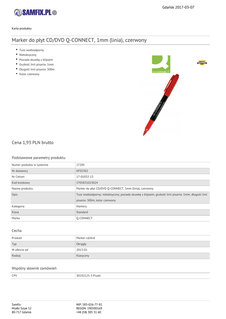 Gdańsk 2017-03-07 Karta produktu: Marker do płyt CD/DVD Q-CONNECT, 1mm (linia), czerwony Tusz wodoodporny Nietoksyczny Posiada skuwkę z klipsem Grubość linii pisania: 1mm Długość linii pisania: 300m Kolor czerwony Cena 1,93 PLN brutto Podstawowe parametry produktu Numer produktu w systemie 17205 Nr dostawcy KF02302 Nr Celcen 17-01032-13 Kod kreskowy 5705831023024 Nazwa produktu Marker do płyt CD/DVD Q-CONNECT, 1mm (linia), czerwony Opis Tusz wodoodporny; nietoksyczny; posiada skuwkę z klipsem; grubość linii pisania: 1mm; długość linii pisania: 300m; kolor czerwony Kategoria Markery Klasa Standard Marka Q-CONNECT Cecha Produkt Marker cd/dvd Typ Okrągły W ofercie od 2013-01 Rodzaj Klasyczny Wspólny słownik zamówień CPV 30192125-3 Pisaki Samfix Miałki Szlak 52 80-717 Gdańsk NIP: 583-026-77-81 REGON: 190500169 +48 (58) 305 31 60 Gdańsk 2017-03-07 Karta katalogowa produktu cd. Marker do płyt CD/DVD Q-CONNECT, 1mm (linia), czerwony Certyfikaty Nowy produkt w ofercie Standard Hit Standard Wymiary Końcówka (mm) 1 Dł. linii (m) 300 Grubość linii (mm) 1 Kolor Kolor Czerwony Pozostałe zdjęcia produktu Serdecznie zapraszamy do współpracy Zespół Samfix. Samfix Miałki Szlak 52 80-717 Gdańsk NIP: 583-026-77-81 REGON: 190500169 +48 (58) 305 31 60