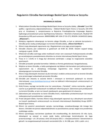 Regulamin Ośrodka Narciarskiego Beskid Sport Arena w Szczyrku I. INFORMACJE OGÓLNE 1. Właścicielem Ośrodka Narciarskiego Beskid Sport Arena w Szczyrku (dalej: „Ośrodek”) jest PBC spółka z ograniczoną odpowiedzialnością – Oddział Beskid Sport Arena w Szczyrku (43-370) przy ul. Grzybowej 1, zarejestrowana w Rejestrze Przedsiębiorców Krajowego Rejestru Sądowego prowadzonym przez Sąd Rejonowy Katowice – Wschód w Katowicach, Wydział VIII Gospodarczy KRS pod numerem: 0000359808, NIP: 634-27-53-272, REGON: 241645322 (dalej: „Właściciel”). 2. Niniejszy regulamin obowiązuje na terenie całego Ośrodka, w tym w zakresie korzystania z Ośrodka przez osoby przebywające na terenie Ośrodka (dalej: „Klienci lub Klient”). 3. Klienci mają obowiązek zapoznania się z Regulaminem oraz jego przestrzegania. 4. Ośrodek otwarty jest codziennie w godzinach od 8:00 do 20:00. Ostatni wyjazd koleją następuje o godz. 20:00. 5. Właściciel ośrodka zastrzega sobie możliwość zmian ram czasowych funkcjonowania ośrodka po wcześniejszym powiadomieniu klientów na stronie internetowej Beskid Sport Areny. 6. Trasa nr 3 i strefa nr 5 mogą być okresowo zamknięte z uwagi na rozgrywanie zawodów sportowych. 7. Ośrodek prowadzi sprzedaż karnetów i biletów w formie gotówkowej i bezgotówkowej. 8. Wejście na teren Ośrodka, a także posługiwanie się biletem lub karnetem jest jednoznaczne z zapoznaniem się i akceptacją niniejszego regulaminu oraz innymi regulaminami obowiązującymi na terenie Ośrodka. 9. Klienci mają obowiązek stosować się do instrukcji i znaków umieszczonych na terenie Ośrodka oraz przestrzegać wskazówek personelu Ośrodka. 10. Ośrodek jest otwarty w sezonie letnim i zimowym w terminach podanych na stronie internetowej: www.beskidsportarena.pl oraz na tablicach informacyjnych umieszczonych na terenie Ośrodka. 11. Kolej linowa, wyciągi narciarskie oraz tor saneczkowy „Tatrabob”, taśma narciarska „Ignacy” czynne są w godzinach wskazanych na tablicach informacyjnych. Zabronione jest przebywanie na terenie Ośrodka, w tym na trasach zjazdowych, poza godzinami ich otwarcia. 12. Zabronione jest wnoszenie na teren Ośrodka broni, materiałów pirotechnicznych lub innych niebezpiecznych przedmiotów i substancji. 13. Przed zakupem biletu i karnetu Klienci mają obowiązek zapoznać się z aktualnymi warunkami na trasach zjazdowych umieszczonych na stronach internetowych Beskidzkiej Grupy GOPR i Beskid Sport Arena. 14. Klienci nie powinni pozostawiać sprzętu narciarskiego, snowboardowego lub innego bez dozoru. Ośrodek nie ponosi odpowiedzialności za pozostawiony sprzęt, bagaż oraz przedmioty osobistego użytku. 15. Klienci uprawiający narciarstwo zjazdowe lub snowboarding, do ukończenia 16 roku życia, obowiązani są używać w czasie jazdy kasku ochronnego konstrukcyjnie do tego przeznaczonego – art. 29 ustawy z dnia 18 sierpnia 2011 r. o bezpieczeństwie i ratownictwie w górach i na zorganizowanych terenach narciarskich (Dz. U. Nr 208, poz. 1241 z późn. zm.). 16. Klienci, którzy nie ukończyli 16 roku życia i nie posiadają kasku, nie zostaną dopuszczeni do korzystania z Wyciągów. 17. Zabrania się uprawiania narciarstwa lub snowboardingu na terenie Ośrodka w stanie nietrzeźwości lub pod wpływem środka odurzającego. 18. Na terenie Ośrodka obowiązuje zakaz wnoszenia alkoholu oraz jego spożywania jak również zakaz palenia papierosów. Spożywanie alkoholu i palenie papierosów dopuszczalne jest tylko i wyłącznie w wyznaczonych do tego miejscach. 19. Personel Ośrodka może odmówić wstępu albo nakazać opuszczenie terenu Ośrodka osobie, której zachowanie wyraźnie wskazuje, że znajduje się ona w stanie nietrzeźwości lub pod wpływem środka odurzającego. 20. Na terenie Ośrodka zabronione jest prowadzenie jakiejkolwiek działalności gospodarczej i promocyjnej, w tym umieszczanie reklam i ulotek bez uprzedniej, pisemnej zgody Właściciela. 21. Zabrania się wprowadzania zwierząt na obszar tras zjazdowych, kolei linowej, wyciągów narciarskich, toru saneczkowego „Tatrabob”, taśma narciarska „Ignacy” oraz do budynków Ośrodka. 22. Wraz z zakupem karnetu Klient wyraża zgodę na rejestrowanie swojego wizerunku i rozpowszechniania go w celu ustalenia czy osoba używająca karnetu jest do tego upoważniona. II. REGULAMIN SPRZEDAŻY BILETÓW I KARNETÓW 1. Godziny otwarcia Kas Biletowych: codziennie od 8:00 do 19:30 2. Przy zakupie karnetów i biletów nie jest pobierana kaucja. 3. Karnety sprzedawane są na konkretne dni. Karnet również można zakupić z wyprzedzeniem na inny konkretny dzień. 4. Karnet przypisany jest do jednej osoby. Personalizacja i identyfikacja następuje w momencie pierwszego przejścia przez bramkę kontrolną (uwaga: użycie karnetu przez inną osobę, niż zarejestrowana podczas personalizacji spowoduje jego anulowanie, bez zwrotu kosztów zakupu) 5. Karnety są ważne na KL „Beskid” oraz wyciągi WN1, WN2 i obowiązują tylko w sezonie, w którym zostały zakupione, nie podlegając zwrotowi. 6. Naliczanie czasu dla karnetów godzinowych rozpoczyna się w momencie pierwszego przejścia przez bramkę kontrolną. 7. W sytuacji, kiedy nie jest możliwy zjazd na nartach do stacji dolnej, zakupiony karnet upoważnia do jednorazowego zjazdu koleją linową do godziny 19:30. 8. Bilety nie są personalizowane. 9. Bilety sprzedawane są na konkretne dni. Bilet można również zakupić z wyprzedzeniem na inny konkretny dzień. Bilety są ważne w sezonie w którym zostały zakupione i nie podlegają zwrotowi. 10.Ulga przyznawana jest tylko na podstawie dokumentu zawierającego: zdjęcie, imię, nazwisko i datę urodzenia osoby uprawnionej do ulgi tj. dziecka poniżej 15 lat, seniora powyżej 65 lat. 11.Dzieci do 3 roku życia (bez nart) korzystają z usług KL „Beskid” bezpłatnie. 12.Niezastosowanie się do instrukcji pracownika obsługi kolei lub wyciągu będ
