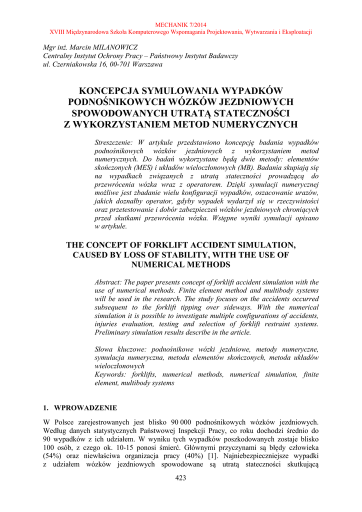MECHANIK 7/2014 XVIII Międzynarodowa Szkoła Komputerowego Wspomagania Projektowania, Wytwarzania i Eksploatacji Mgr inż. Marcin MILANOWICZ Centralny Instytut Ochrony Pracy – Państwowy Instytut Badawczy ul. Czerniakowska 16, 00-701 Warszawa KONCEPCJA SYMULOWANIA WYPADKÓW PODNOŚNIKOWYCH WÓZKÓW JEZDNIOWYCH SPOWODOWANYCH UTRATĄ STATECZNOŚCI Z WYKORZYSTANIEM METOD NUMERYCZNYCH Streszczenie: W artykule przedstawiono koncepcję badania wypadków podnośnikowych wózków jezdniowych z wykorzystaniem metod numerycznych. Do badań wykorzystane będą dwie metody: elementów skończonych (MES) i układów wieloczłonowych (MB). Badania skupiają się na wypadkach związanych z utratą stateczności prowadzącą do przewrócenia wózka wraz z operatorem. Dzięki symulacji numerycznej możliwe jest zbadanie wielu konfiguracji wypadków, oszacowanie urazów, jakich doznałby operator, gdyby wypadek wydarzył się w rzeczywistości oraz przetestowanie i dobór zabezpieczeń wózków jezdniowych chroniących przed skutkami przewrócenia wózka. Wstępne wyniki symulacji opisano w artykule. THE CONCEPT OF FORKLIFT ACCIDENT SIMULATION, CAUSED BY LOSS OF STABILITY, WITH THE USE OF NUMERICAL METHODS Abstract: The paper presents concept of forklift accident simulation with the use of numerical methods. Finite element method and multibody systems will be used in the research. The study focuses on the accidents occurred subsequent to the forklift tipping over sideways. With the numerical simulation it is possible to investigate multiple configurations of accidents, injuries evaluation, testing and selection of forklift restraint systems. Preliminary simulation results describe in the article. Słowa kluczowe: podnośnikowe wózki jezdniowe, metody numeryczne, symulacja numeryczna, metoda elementów skończonych, metoda układów wieloczłonowych Keywords: forklifts, numerical methods, numerical simulation, finite element, multibody systems 1. WPROWADZENIE W Polsce zarejestrowanych jest blisko 90 000 podnośnikowych wózków jezdniowych. Według danych statystycznych Państwowej Inspekcji Pracy, co roku dochodzi średnio do 90 wypadków z ich udziałem. W wyniku tych wypadków poszkodowanych zostaje blisko 100 osób, z czego ok. 10-15 ponosi śmierć. Głównymi przyczynami są błędy człowieka (54%) oraz niewłaściwa organizacja pracy (40%) [1]. Najniebezpieczniejsze wypadki z udziałem wózków jezdniowych spowodowane są utratą stateczności skutkującą 423 MECHANIK 7/2014 XVIII Międzynarodowa Szkoła Komputerowego Wspomagania Projektowania, Wytwarzania i Eksploatacji przewróceniem się wózka wraz z operatorem. Tego typu wypadki stanowią blisko 45% wypadków ciężkich i śmiertelnych z udziałem wózków jezdniowych, przy czym 60% tych wypadków kończy się śmiercią operatora1. Podobnie sytuacja przedstawia się w innych krajach europejskich. Dla przykładu według danych Instytutu INRS (Institut National de Recherche et de Securite) z Francji, rokrocznie 63% śmiertelnych wypadków z udziałem wózków jezdniowych spowodowanych jest ich przewróceniem wraz operatorem, przy czym w większości przypadków operatorzy nie mieli zapiętych pasów bezpieczeństwa [2]. W Polsce każdy wózek jezdniowy musi być wyposażony w zabezpieczenia ograniczające ryzyko związane z jego przewróceniem. Zabezpieczenia te mogą być stosowane wymiennie i są to: kabina dla operatora lub konstrukcja zapobiegająca wywróceniu się albo konstrukcja zapewniająca dostateczną wolną przestrzeń między podłożem i określonymi częściami wózka jezdniowego dla przewożonych pracowników, na wypadek wywrócenia się bądź konstrukcja zabezpieczająca pracownika znajdującego się na miejscu kierowcy, aby nie został przygnieciony przez części wywracającego się wózka [3]. Jak wynika ze statystyk, mimo obowiązkowych zabezpieczeń, problem ciężkich i śmiertelnych wypadków nadal jest duży. Aby ograniczyć skutki tych wypadków, należy zidentyfikować parametry, przy jakich do nich dochodzi (np. prędkość wózka, kąt skręcenia kierownicy itp.) w zależności od typu wózka, kąta nachylania powierzchni, po której się porusza itp., a następnie zbadać dla tych parametrów, na ile skuteczne są obecnie stosowane zabezpieczenia. Tego typu prace prowadzone są na świecie np. przez Instytut INRS. W tym celu naukowcy z INRS opracowali stanowisko badawcze składające się z kabiny wózka poruszającej się po torach tworzących zakręt. W kabinie umieszczany jest manekin Hybrid III, następnie kabina rozpędzana jest do prędkości powodującej przewrócenie kabiny na łuku. W ten sposób testowane są dostępne na rynku zabezpieczenia (np. pasy bezpieczeństwa) [2, 4]. Zastosowanie manekina Hybrid III pozwala także na oszacowanie urazów, jakich doznałby operator, gdyby symulowany wypadek wydarzył się naprawdę. Manekin Hybrid III jest powszechnie wykorzystywany do oceny samochodowych systemów bezpieczeństwa w testach zderzeniowych. Jego masa i wymiary odpowiadają 50-centylowemu mężczyźnie populacji amerykańskiej. Do głównych zalet manekina zaliczyć można wierne odwzorowanie kinematyki człowieka oraz możliwość rejestracji bardzo wielu wielkości fizycznych w poszczególnych częściach ciała [5]. Dzięki znajomości tych wielkości możliwe jest szacowanie urazów, jakich doznałby człowiek poddany takim samym obciążeniom, jak manekin. Opracowane przez zespół naukowców z INRS stanowisko badawcze służy także do prac nad nowymi systemami zabezpieczającymi operatora – np. poduszki powietrzne w formie kurtyn bocznych [6]. W CIOP-PIB powstała koncepcja prowadzenia podobnych badań, z tą różnicą że badania prowadzone będą z wykorzystaniem metod numerycznych. Badania tego typu od kilku lat są już powszechne w przemyśle samochodowym. Niemal każdy koncern samochodowy bada swoje nowe konstrukcje poprzez prowadzenie wirtualnych testów zderzeniowych. Do tego