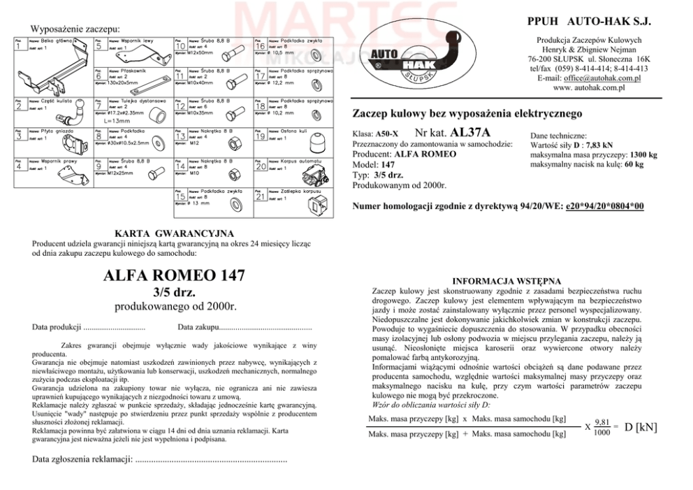 PPUH AUTO-HAK S.J. WyposaŜenie zaczepu: Produkcja Zaczepów Kulowych Henryk & Zbigniew Nejman 76-200 SŁUPSK ul. Słoneczna 16K tel/fax (059) 8-414-414; 8-414-413 E-mail: [email protected] www. autohak.com.pl Zaczep kulowy bez wyposaŜenia elektrycznego AL37A Klasa: A50-X Nr kat. Przeznaczony do zamontowania w samochodzie: Producent: ALFA ROMEO Model: 147 Typ: 3/5 drz. Produkowanym od 2000r. Dane techniczne: Wartość siły D : 7,83 kN maksymalna masa przyczepy: 1300 kg maksymalny nacisk na kulę: 60 kg Numer homologacji zgodnie z dyrektywą 94/20/WE: e20*94/20*0804*00 KARTA GWARANCYJNA Producent udziela gwarancji niniejszą kartą gwarancyjną na okres 24 miesięcy licząc od dnia zakupu zaczepu kulowego do samochodu: ALFA ROMEO 147 3/5 drz. produkowanego od 2000r. Data produkcji .............................. Data zakupu............................................. Zakres gwarancji obejmuje wyłącznie wady jakościowe wynikające z winy producenta. Gwarancja nie obejmuje natomiast uszkodzeń zawinionych przez nabywcę, wynikających z niewłaściwego montaŜu, uŜytkowania lub konserwacji, uszkodzeń mechanicznych, normalnego zuŜycia podczas eksploatacji itp. Gwarancja udzielona na zakupiony towar nie wyłącza, nie ogranicza ani nie zawiesza uprawnień kupującego wynikających z niezgodności towaru z umową. Reklamacje naleŜy zgłaszać w punkcie sprzedaŜy, składając jednocześnie kartę gwarancyjną. Usunięcie "wady" następuje po stwierdzeniu przez punkt sprzedaŜy wspólnie z producentem słuszności złoŜonej reklamacji. Reklamacja powinna być załatwiona w ciągu 14 dni od dnia uznania reklamacji. Karta gwarancyjna jest niewaŜna jeŜeli nie jest wypełniona i podpisana. Data zgłoszenia reklamacji: ................................................................... INFORMACJA WSTĘPNA Zaczep kulowy jest skonstruowany zgodnie z zasadami bezpieczeństwa ruchu drogowego. Zaczep kulowy jest elementem wpływającym na bezpieczeństwo jazdy i moŜe zostać zainstalowany wyłącznie przez personel wyspecjalizowany. Niedopuszczalne jest dokonywanie jakichkolwiek zmian w konstrukcji zaczepu. Powoduje to wygaśniecie dopuszczenia do stosowania. W przypadku obecności masy izolacyjnej lub osłony podwozia w miejscu przylegania zaczepu, naleŜy ją usunąć. Nieosłonięte miejsca karoserii oraz wywiercone otwory naleŜy pomalować farbą antykorozyjną. Informacjami wiąŜącymi odnośnie wartości obciąŜeń są dane podawane przez producenta samochodu, względnie wartości maksymalnej masy przyczepy oraz maksymalnego nacisku na kulę, przy czym wartości parametrów zaczepu kulowego nie mogą być przekroczone. Wzór do obliczania wartości siły D: Maks. masa przyczepy [kg] x Maks. masa samochodu [kg] Maks. masa przyczepy [kg] + Maks. masa samochodu [kg] X 9,81 = 1000 D [kN] INSTRUKCJA MontaŜu i eksploatacji zaczepu kulowego Oznaczenie zacisku wg ISO PN 1 L 2 + 3 31 4 R 5 58R 6 54 7 58L 12 6 X 5 A G Kolejność czynności przy montaŜu 1. Łączenie przewodów Do świateł kierunku jazdy lewych Tylne światła przeciwmgłowe Do masy pojazdu Do świateł kierunku jazdy prawych Do świateł pozycyjnych prawych Do świateł hamowania Do świateł pozycyjnych lewych 12 C 10 B 11 X 12 H 4 F 3 7 E 6 9 D 2 1 20 Zaczep kulowy przeznaczony jest do zamontowania w samochodzie: ALFA ROMEO 147, 3/5 drz., produkowanym od 2000r., numer katalogowy AL37A i słuŜy do ciągnięcia przyczep o masie całkowitej 1300 kg i nacisku na kulę max 60 kg. OD PRODUCENTA Dziękujemy za wybór produkowanego przez naszą firmę zaczepu kulowego. Jego niezawodność została potwierdzona licznymi testami oraz opiniami zadowolonych klientów. JednakŜe niezawodność zaczepów kulowych jest zaleŜna równieŜ od prawidłowego montaŜu oraz prawidłowej eksploatacji. Z tego powodu prosimy Państwa o staranne przeczytanie niniejszej instrukcji montaŜu oraz przestrzeganie zawartych wskazówek. Zaczep naleŜy zamontować w miejscach do tego celu przeznaczonych przez producenta samochodu. W celu zamontowania zaczepu naleŜy: - zdemontować zderzak, tłumik, blachę Ŝaroodporną (aluminiową), wykładzinę z podłogi bagaŜnika oraz panele boczne i z tylnej ściany. 2. Usunąć masę wygłuszającą z prawej i lewej strony bagaŜnika, pod którą znajdują się fabrycznie zapunktowane miejsca (po jednym z lewej i prawej strony), naleŜy je przewiercić wiertłem ø10mm. 3. Do tak przygotowanych miejsc przyłoŜyć wsporniki zaczepu (poz. 4 - prawa strona i poz. 5 - lewa strona). W/w elementy naleŜy wystającymi kołkami stabilizacyjnymi oznaczonymi na rysunku „X” nałoŜyć na uprzednio wywiercone otwory ø10mm. 4. Wsporniki (poz. 4 i 5) ułoŜyć bardzo starannie, a następnie przez otwory (poz. A,B,C,D,E i F) wywiercić otwory ø11mm, a przez otwory (poz. G i H) ø13mm. 5. Przez otwory (poz. B i D) od zewnętrznej strony tylnego płata rozwiercić wiertłem ø17mm, a następnie wsunąć w te otwory tulejki dystansowe ø17mm, L=13mm. 6. Od spodu samochodu przyłoŜyć belkę główną zaczepu (poz. 1) i skręcić śrubami M12x50mm (poz. 10) oraz wszystkie pozostałe elementy patrz rys. 7. Zamontować blachę Ŝaroodporną, tłumik, zderzak oraz pozostałe elementy uprzednio zdemontowane. 8. Przykręcić korpus automatu (poz. 20) śrubami M12x25mm (poz. 9) wraz z blachą pod gniazdo (poz. 3). Zamocować kulę zgodnie z instrukcją dołączaną do zaczepu z końcówką szybkodemontowalną. 9. Dokręcić wszystkie śruby z momentem jak pokazano w tabeli. 10. Podłączyć przewody gniazdka 7 – bieg. do instalacji elektrycznej zgodnie z instrukcją fabryczną samochodu (zaleca się wykonanie w ASO). 11. Uzupełnić ewentualne ubytki powłoki malarskiej zaczepu powstałe w trakcie montaŜu. Zalecany moment skręcający dla śrub i nakrętek 8,8: M6 - 11 Nm M8 - 25 Nm M10 - 50 Nm M12 - 87 Nm M14 - 138 Nm M16 - 210 Nm UWAGA Po zamontowaniu zaczepu kulowego naleŜy uzyskać wpis w dowodzie rejestracyjnym pojaz