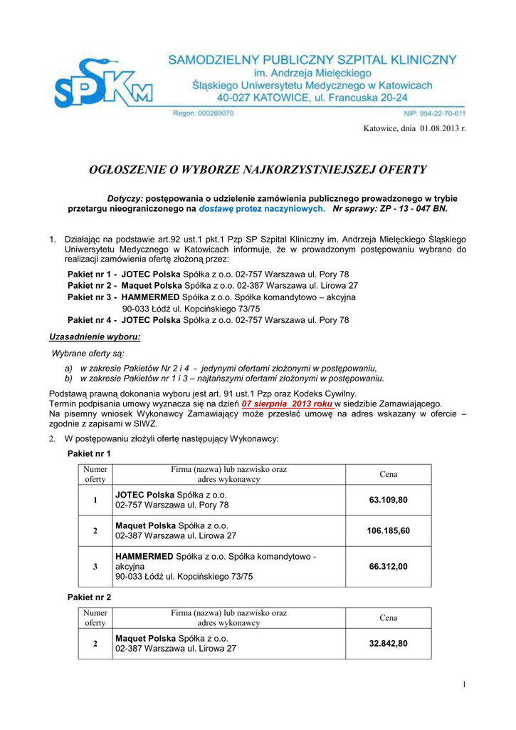 Katowice, dnia 01.08.2013 r. OGŁOSZENIE O WYBORZE NAJKORZYSTNIEJSZEJ OFERTY Dotyczy: postępowania o udzielenie zamówienia publicznego prowadzonego w trybie przetargu nieograniczonego na dostawę protez naczyniowych. Nr sprawy: ZP - 13 - 047 BN. 1. Działając na podstawie art.92 ust.1 pkt.1 Pzp SP Szpital Kliniczny im. Andrzeja Mielęckiego Śląskiego Uniwersytetu Medycznego w Katowicach informuje, że w prowadzonym postępowaniu wybrano do realizacji zamówienia ofertę złożoną przez: Pakiet nr 1 - JOTEC Polska Spółka z o.o. 02-757 Warszawa ul. Pory 78 Pakiet nr 2 - Maquet Polska Spółka z o.o. 02-387 Warszawa ul. Lirowa 27 Pakiet nr 3 - HAMMERMED Spółka z o.o. Spółka komandytowo – akcyjna 90-033 Łódź ul. Kopcińskiego 73/75 Pakiet nr 4 - JOTEC Polska Spółka z o.o. 02-757 Warszawa ul. Pory 78 Uzasadnienie wyboru: Wybrane oferty są: a) w zakresie Pakietów Nr 2 i 4 - jedynymi ofertami złożonymi w postępowaniu, b) w zakresie Pakietów nr 1 i 3 – najtańszymi ofertami złożonymi w postępowaniu. Podstawą prawną dokonania wyboru jest art. 91 ust.1 Pzp oraz Kodeks Cywilny. Termin podpisania umowy wyznacza się na dzień 07 sierpnia 2013 roku w siedzibie Zamawiającego. Na pisemny wniosek Wykonawcy Zamawiający może przesłać umowę na adres wskazany w ofercie – zgodnie z zapisami w SIWZ. 2. W postępowaniu złożyli ofertę następujący Wykonawcy: Pakiet nr 1 Numer oferty Firma (nazwa) lub nazwisko oraz adres wykonawcy Cena 1 JOTEC Polska Spółka z o.o. 02-757 Warszawa ul. Pory 78 63.109,80 2 Maquet Polska Spółka z o.o. 02-387 Warszawa ul. Lirowa 27 106.185,60 3 HAMMERMED Spółka z o.o. Spółka komandytowo akcyjna 90-033 Łódź ul. Kopcińskiego 73/75 66.312,00 Pakiet nr 2 Numer oferty 2 Firma (nazwa) lub nazwisko oraz adres wykonawcy Maquet Polska Spółka z o.o. 02-387 Warszawa ul. Lirowa 27 Cena 32.842,80 1 Pakiet nr 3 Numer oferty Firma (nazwa) lub nazwisko oraz adres wykonawcy Cena 2 Maquet Polska Spółka z o.o. 02-387 Warszawa ul. Lirowa 27 9.504,00 3 HAMMERMED Spółka z o.o. Spółka komandytowo akcyjna 90-033 Łódź ul. Kopcińskiego 73/75 8.640,00 Pakiet nr 4 Numer oferty 1 3. 4. Firma (nazwa) lub nazwisko oraz adres wykonawcy JOTEC Polska Spółka z o.o. 02-757 Warszawa ul. Pory 78 Cena 38.880,00 Działając na podstawie art.92 ust.1 pkt.2 Pzp Zamawiający informuje, że w prowadzonym postępowaniu nie odrzucono żadnej oferty. Działając na podstawie art.92 ust.1 pkt.3 Pzp Zamawiający informuje, że w prowadzonym postępowaniu nie wykluczono żadnego Wykonawcy. Ogłoszenie podpisał w dnia 02.08.2013 r. Z upoważnienia Dyrektora SPSKM Z-ca Dyr. Ds. Ekonomicznych - Główny Księgowy mgr Ewa Mołek 2