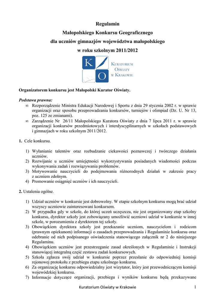 Regulamin Małopolskiego Konkursu Geograficznego dla uczniów gimnazjów województwa małopolskiego w roku szkolnym 2011/2012 Organizatorem konkursu jest Małopolski Kurator Oświaty. Podstawa prawna: • Rozporządzenie Ministra Edukacji Narodowej i Sportu z dnia 29 stycznia 2002 r. w sprawie organizacji oraz sposobu przeprowadzania konkursów, turniejów i olimpiad (Dz. U. Nr 13, poz. 125 ze zmianami). • Zarządzenie Nr 26/11 Małopolskiego Kuratora Oświaty z dnia 7 lipca 2011 r. w sprawie organizacji konkursów przedmiotowych i interdyscyplinarnych w szkołach podstawowych i gimnazjach w roku szkolnym 2011/2012. 1. Cele konkursu. 1) Wyłanianie talentów oraz rozbudzanie ciekawości poznawczej i twórczego działania uczniów. 2) Rozwijanie u uczniów umiejętności wykorzystywania posiadanych wiadomości podczas wykonywania zadań i rozwiązywania problemów. 3) Motywowanie nauczycieli do podejmowania róŜnorodnych działań w zakresie pracy z uczniem zdolnym. 4) Promowanie osiągnięć uczniów i ich nauczycieli. 2. Ustalenia ogólne. 1) Udział uczniów w konkursie jest dobrowolny. W etapie szkolnym konkursu mogą brać udział wszyscy uczniowie zainteresowani konkursem. 2) W przypadku gdy w szkole, do której uczeń uczęszcza, nie jest organizowany etap szkolny konkursu, dyrektor szkoły jest zobowiązany umoŜliwić uczniowi udział w konkursie w innej szkole, w porozumieniu z dyrektorem tej szkoły. 3) Obowiązkiem dyrektora szkoły jest przekazanie uczniom, nauczycielom i rodzicom (prawnym opiekunom) informacji o zasadach przeprowadzania i Regulaminie konkursu oraz odebranie od nich podpisanego oświadczenia stanowiącego załącznik nr 2 do niniejszego Regulaminu. 4) Obowiązkiem uczniów jest przestrzeganie zasad określonych w Regulaminie i Instrukcji stanowiącej integralną część zestawu zadań konkursowych. 5) Szkoła zgłasza swój udział w konkursie poprzez przesłanie do odpowiedniej komisji rejonowej protokołu z przebiegu etapu szkolnego konkursu. 6) Za organizację konkursu odpowiedzialny jest wizytator, który jest przewodniczącym komisji wojewódzkiej konkursu. 7) Informacje dotyczące organizacji, przebiegu i wyników konkursu będą przekazywane Kuratorium Oświaty w Krakowie 1 wyłącznie w formie elektronicznej poprzez stronę www.kuratorium.krakow.pl oraz pocztę elektroniczną przewodniczących komisji rejonowych i wojewódzkiej. 8) Zestawy zadań oraz schematy oceniania i punktacji do wszystkich etapów konkursu będą opracowane według określonych warunków przedstawionych autorom i zostaną dopuszczone do wykorzystania po uzyskaniu pozytywnej recenzji naukowej i metodycznej. 9) Autorzy i recenzenci zadań oraz wiceprzewodniczący komisji wojewódzkiej nie mogą przygotowywać uczniów lub własnych dzieci do udziału w konkursie. 10) Finaliści oraz laureaci konkursu otrzymają zaświadczenia Małopolskiego Kuratora Oświaty, które są waŜne na terenie całego kraju. 11) Laureaci konkursu uzyskują ocenę celującą z przedmiotu, są zwolnieni z części matematyczno – przyrodniczej egzaminu gimnazjalnego, co jest równoznaczne z uzyskaniem najwyŜszego wyniku z tej części egzaminu oraz będą przyjmowani do wybranej szkoły ponadgimnazjalnej, niezaleŜnie od obowiązujących w niej kryteriów, na mocy § 8 ust. 8 rozporządzenia Ministra Edukacji Narodowej i Sportu z dnia 20 lutego 2004 r. w sprawie warunków i trybu przyjmowania uczniów do szkół publicznych oraz przechodzenia z jednych typów szkół do innych (Dz. U. z 2004 r. Nr 26, poz. 232 ze zmianami). 12) Laureaci konkursu otrzymają nagrody. 3. Przebieg konkursu. 1) Konkurs jest trzyetapowy. Szczegółowy harmonogram przebiegu konkursu określa załącznik nr 1 do niniejszego Regulaminu. 2) Eliminacje konkursowe na wszystkich etapach będą przeprowadzane w formie pisemnej. 3) W etapie rejonowym konkursu moŜe wziąć udział co najwyŜej 800 uczestników konkursu, którzy uzyskali najwyŜszą liczbę punktów w etapie szkolnym, jednak nie mniej niŜ 75% punktów moŜliwych do uzyskania. 4) W etapie wojewódzkim konkursu moŜe wziąć udział co najwyŜej 200 uczestników konkursu, którzy uzyskali najwyŜszą liczbę punktów w etapie rejonowym, jednak nie mniej niŜ 75% punktów moŜliwych do uzyskania. 5) Tytuł laureata konkursu otrzymuje 20 uczestników konkursu, którzy uzyskali najwyŜszą liczbę punktów w etapie wojewódzkim, a takŜe ci uczestnicy, którzy zdobyli identyczną liczbę punktów, jaką uzyskał dwudziesty finalista. 4. Organizacja etapu szkolnego konkursu i nadzór nad jego przebiegiem spoczywa na dyrektorze szkoły, który: 1) powołuje szkolną komisję konkursową, w skład której wchodzi co najmniej dwóch nauczycieli, z których co najmniej jeden reprezentuje przedmiot konkursu, 2) uzyskuje zgodę rodziców (prawnych opiekunów) uczniów biorących udział w konkursie na przetwarzanie do celów konkursu danych osobowych uczniów oraz uzyskuje ich potwierdzenie, Ŝe zapoznali się z regulaminem i akceptują jego postanowienia, zgodnie z wzorem, stanowiącym załącznik nr 2 do niniejszego Regulaminu, 3) zapewnia opiekę uczniom swojej szkoły uczestniczącym w etapie szkolnym w innej szkole, jeŜeli w szkole mu podległej nie jest organizowany etap szkolny konkursu, 4) w dniu etapu szkolnego pobiera ze strony www.kuratorium.krakow.pl arkusz z zadaniami oraz przygotowuje odpowiednią liczbę egzemplarzy arkuszy dla uczestników konkursu, 5) organizuje o godzinie 13.00 etap szkolny konkursu, 6) umoŜliwia dokonanie wglądu do prac uczniom, ich rodzicom (prawnym opiekunom) i opiekunom naukowym, zgodnie z harmonogramem przebiegu konkursu, na zasadach określonych w punkcie 7 niniejszego Regulaminu, 7) przyjmuje pisemne zastrzeŜenia, dotyczące sprawdzania i oceniania prac przez szkolną 2 Kuratorium Oświaty w Krakowie komisję konkursową i przekazuje je do zespołu rozpatrującego zastrzeŜenia, zgodnie z punktem 8 pp. 1 niniejszego Regulaminu, 8