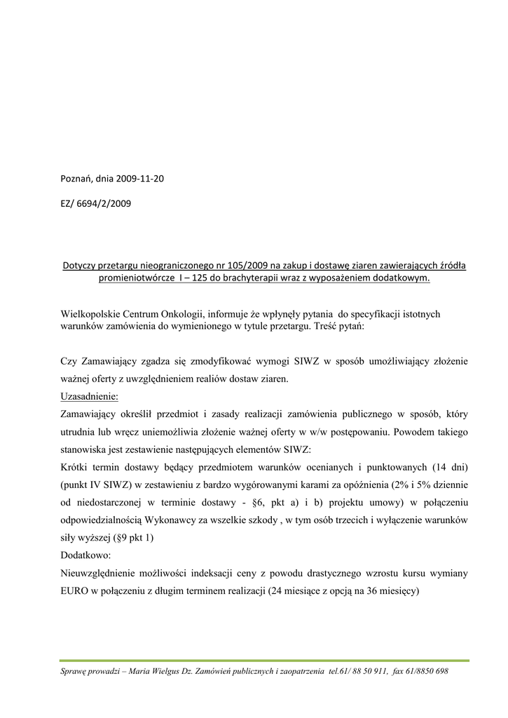 Poznao, dnia 2009-11-20 EZ/ 6694/2/2009 Dotyczy przetargu nieograniczonego nr 105/2009 na zakup i dostawę ziaren zawierających źródła promieniotwórcze I – 125 do brachyterapii wraz z wyposażeniem dodatkowym. Wielkopolskie Centrum Onkologii, informuje że wpłynęły pytania do specyfikacji istotnych warunków zamówienia do wymienionego w tytule przetargu. Treść pytań: Czy Zamawiający zgadza się zmodyfikować wymogi SIWZ w sposób umożliwiający złożenie ważnej oferty z uwzględnieniem realiów dostaw ziaren. Uzasadnienie: Zamawiający określił przedmiot i zasady realizacji zamówienia publicznego w sposób, który utrudnia lub wręcz uniemożliwia złożenie ważnej oferty w w/w postępowaniu. Powodem takiego stanowiska jest zestawienie następujących elementów SIWZ: Krótki termin dostawy będący przedmiotem warunków ocenianych i punktowanych (14 dni) (punkt IV SIWZ) w zestawieniu z bardzo wygórowanymi karami za opóźnienia (2% i 5% dziennie od niedostarczonej w terminie dostawy - §6, pkt a) i b) projektu umowy) w połączeniu odpowiedzialnością Wykonawcy za wszelkie szkody , w tym osób trzecich i wyłączenie warunków siły wyższej (§9 pkt 1) Dodatkowo: Nieuwzględnienie możliwości indeksacji ceny z powodu drastycznego wzrostu kursu wymiany EURO w połączeniu z długim terminem realizacji (24 miesiące z opcją na 36 miesięcy) Sprawę prowadzi – Maria Wielgus Dz. Zamówień publicznych i zaopatrzenia tel.61/ 88 50 911, fax 61/8850 698 Wnosimy o: Pytanie 1: Zmianę wymaganego terminu dostawy na 21 dni roboczych od daty złożenia zamówienia oraz stosownych zmian w zakresie Załącznika nr 3B „Ocena terminów dostawy”, Odpowiedź: Zamawiający nie wyraża zgody na modyfikację siwz w sposób zaproponowany przez wykonawcę ponieważ: 1. Dostawa ziaren promieniotwórczych w przeciągu maksymalnie do 14 dni po otrzymaniu zamówienia według wstępnego planu leczenia gwarantuje spełnienie oczekiwań pacjentów płacących za zabieg i oczekujących szybkiej realizacji. W przeszłości pacjenci rezygnowali z zabiegu ze względu na zbyt długi okres oczekiwania. Wielkopolskie Centrum Onkologii oczekuje, że w rzeczywistości będzie to termin kilkudniowy, jedynie w wyjątkowych losowych sytuacjach sięgnie 14 dni. 2. Długi okres dostawy ziaren utrudnia planowanie zabiegów. Ze względu na znaczną liczbę leczonych pacjentów wymagany jest precyzyjny proces planowania kolejnych zabiegów, rezerwacja czasu pracy poszczególnych członków zespołu (lekarze, pielęgniarki, anestezjolog, dostępność sali zabiegowej). 3. Krótki czas od decyzji o podjęciu leczenia do jego realizacji ma istotny wpływ na emocjonalne podejście chorych do całego procesu leczenia co może mieć istotny wpływ na jego przebieg i w konsekwencji wynik. Pytanie 2: Dostosowanie wysokości kar umownych do powszechnie stosowanego poziomu z jednoczesnym wykreśleniem zapisów włączających czynniki losowe i następstwa nieszczęśliwych wypadków do odpowiedzialności Wykonawcy (tzw. siła wyższa - §9 pkt 1) Odpowiedź: Zamawiający przychyla się do wniosku i dokonuje następujących zmian: 1) zmienia wysokość kar umownych jakie Wykonawca będzie zobowiązany do zapłaty na rzecz Zamawiającego na 2%, w każdym przypadku określonym w §6 umowy. 2) Zmienia zapis par. 9 ust.1 umowy, w ten sposób, że przyjmuje on brzmienie: „1. Strony zgodnie postanawiają, że Wykonawca ponosi całkowitą odpowiedzialność za wszelkie szkody poniesione przez Zamawiającego oraz jakiekolwiek osoby trzecie, za które ponosi odpowiedzialność, powstałe w związku z wykonywaniem niniejszej umowy, w tym także spowodowane zaistnieniem zdarzeń losowych oraz nieszczęśliwych wypadków. Wykonawca jest zwolniony od odpowiedzialności odszkodowawczej tylko w przypadku, gdy nie wykonanie lub opóźnione wykonanie umowy nastąpią z nieprzewidzialnych okoliczności o charakterze siły wyższej ( tj. burza, trzęsienie ziemi, powódź lub inna katastrofa naturalna, zamieszek, sabotażu, wojny).” Sprawę prowadzi – Maria Wielgus Dz. Zamówień publicznych i zaopatrzenia tel.61/ 88 50 911, fax 61/8850 698 Pytanie 3: Uzupełnienie kryteriów indeksacji ceny (§4 pkt.3) o możliwość negocjacji ceny w przypadku zmiany kursu EUR o więcej niż 10%. Odpowiedź. Zamawiający nie widzi możliwości indeksacji ceny w przypadku zmiany kursu Euro. Zamawiający bowiem przewiduje możliwość złożenia ofert denominowanych w Euro. Pytanie 4: Dopuszczenie możliwości złożenia ofert denominowanych w walucie (EUR/USD). Odpowiedź: Zamawiający uwzględnia możliwość denominacji wartości umowy w Euro. Zmianie ulega zapis par.4 w ten sposób, ze ust. 1 otrzymuje brzmienie: „1. Całkowita wartość Sprzętu, którego sprzedaż i dostawa jest przedmiotem niniejszej umowy (łączna cena Sprzętu), zgodnie z ofertą, będącą integralną częścią niniejszej umowy, wynosi netto ……………… PLN/EURO* ( słownie:………………………………………. i brutto : ……………………….PLN/EURO* (słownie: ……………………………………)” *niepotrzebne skreślić Par.4 ust.2 umowy otrzymuje brzmienie: „W przypadku oferty złożonej w walucie Euro cena netto i brutto poszczególnych dostaw jest wyliczana będzie w PLN wg kursu sprzedaży Euro ogłaszanego przez NBP obowiązującego w dniu wystawienia przez Wykonawcę faktury. W przypadku gdy w okresie pomiędzy datą wystawienia faktury, a uiszczeniem płatności wystąpi zmiana kursu sprzedaży Euro w NBP o więcej niż 10% Wykonawca wystawi zamawiającemu fakturę korygującą tę zmianę.” W par.4 ust.3 umowy wykreśla się literę d). W par.4 skreśla się ust. 5 – 8. W par.4 dotychczasowy „ust. 9” otrzymuje oznaczenie „ust. 5.” W związku z powyższym § 5 ust. 2 przyjmuje nowe brzmienie: „2. Zamawiający przewiduje możliwość przedłużenia okresu obowiązywania niniejszej umowy, o kolejne 12 m