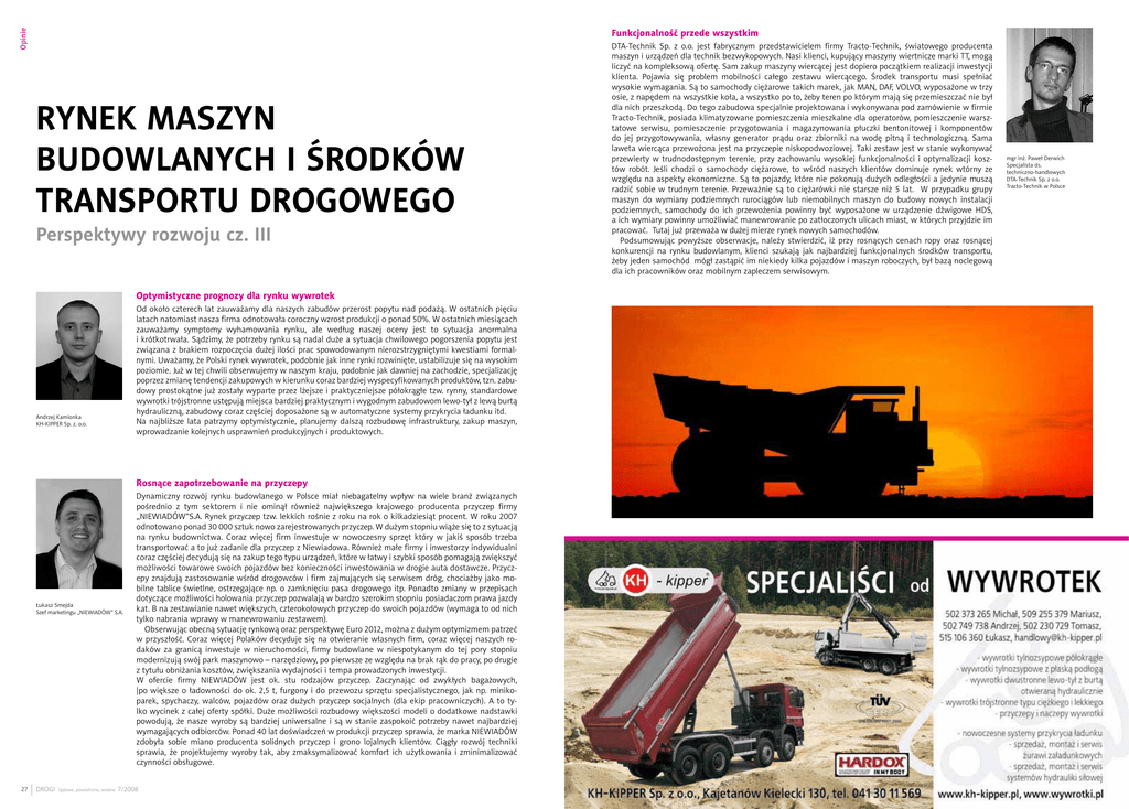 Opinie Funkcjonalność przede wszystkim RYNEK MASZYN BUDOWLANYCH I ŚRODKÓW TRANSPORTU DROGOWEGO Perspektywy rozwoju cz. III DTA-Technik Sp. z o.o. jest fabrycznym przedstawicielem firmy Tracto-Technik, światowego producenta maszyn i urządzeń dla technik bezwykopowych. Nasi klienci, kupujący maszyny wiertnicze marki TT, mogą liczyć na kompleksową ofertę. Sam zakup maszyny wiercącej jest dopiero początkiem realizacji inwestycji klienta. Pojawia się problem mobilności całego zestawu wiercącego. Środek transportu musi spełniać wysokie wymagania. Są to samochody ciężarowe takich marek, jak MAN, DAF, VOLVO, wyposażone w trzy osie, z napędem na wszystkie koła, a wszystko po to, żeby teren po którym mają się przemieszczać nie był dla nich przeszkodą. Do tego zabudowa specjalnie projektowana i wykonywana pod zamówienie w firmie Tracto-Technik, posiada klimatyzowane pomieszczenia mieszkalne dla operatorów, pomieszczenie warsztatowe serwisu, pomieszczenie przygotowania i magazynowania płuczki bentonitowej i komponentów do jej przygotowywania, własny generator prądu oraz zbiorniki na wodę pitną i technologiczną. Sama laweta wiercąca przewożona jest na przyczepie niskopodwoziowej. Taki zestaw jest w stanie wykonywać przewierty w trudnodostępnym terenie, przy zachowaniu wysokiej funkcjonalności i optymalizacji kosztów robót. Jeśli chodzi o samochody ciężarowe, to wśród naszych klientów dominuje rynek wtórny ze względu na aspekty ekonomiczne. Są to pojazdy, które nie pokonują dużych odległości a jedynie muszą radzić sobie w trudnym terenie. Przeważnie są to ciężarówki nie starsze niż 5 lat. W przypadku grupy maszyn do wymiany podziemnych rurociągów lub niemobilnych maszyn do budowy nowych instalacji podziemnych, samochody do ich przewożenia powinny być wyposażone w urządzenie dźwigowe HDS, a ich wymiary powinny umożliwiać manewrowanie po zatłoczonych ulicach miast, w których przyjdzie im pracować. Tutaj już przeważa w dużej mierze rynek nowych samochodów. Podsumowując powyższe obserwacje, należy stwierdzić, iż przy rosnących cenach ropy oraz rosnącej konkurencji na rynku budowlanym, klienci szukają jak najbardziej funkcjonalnych środków transportu, żeby jeden samochód mógł zastąpić im niekiedy kilka pojazdów i maszyn roboczych, był bazą noclegową dla ich pracowników oraz mobilnym zapleczem serwisowym. mgr inż. Paweł Derwich Specjalista ds. techniczno-handlowych DTA-Technik Sp. z o.o. Tracto-Technik w Polsce Optymistyczne prognozy dla rynku wywrotek Od około czterech lat zauważamy dla naszych zabudów przerost popytu nad podażą. W ostatnich pięciu latach natomiast nasza firma odnotowała coroczny wzrost produkcji o ponad 50%. W ostatnich miesiącach zauważamy symptomy wyhamowania rynku, ale według naszej oceny jest to sytuacja anormalna i krótkotrwała. Sądzimy, że potrzeby rynku są nadal duże a sytuacja chwilowego pogorszenia popytu jest związana z brakiem rozpoczęcia dużej ilości prac spowodowanym nierozstrzygniętymi kwestiami formalnymi. Uważamy, że Polski rynek wywrotek, podobnie jak inne rynki rozwinięte, ustabilizuje się na wysokim poziomie. Już w tej chwili obserwujemy w naszym kraju, podobnie jak dawniej na zachodzie, specjalizację poprzez zmianę tendencji zakupowych w kierunku coraz bardziej wyspecyfikowanych produktów, tzn. zabudowy prostokątne już zostały wyparte przez lżejsze i praktyczniejsze półokrągłe tzw. rynny, standardowe wywrotki trójstronne ustępują miejsca bardziej praktycznym i wygodnym zabudowom lewo-tył z lewą burtą hydrauliczną, zabudowy coraz częściej doposażone są w automatyczne systemy przykrycia ładunku itd. Na najbliższe lata patrzymy optymistycznie, planujemy dalszą rozbudowę infrastruktury, zakup maszyn, wprowadzanie kolejnych usprawnień produkcyjnych i produktowych. Andrzej Kamionka KH-KIPPER Sp. z. o.o. Rosnące zapotrzebowanie na przyczepy Łukasz Smejda Szef marketingu „NIEWIADÓW” S.A. 27 DROGI lądowe, powietrzne, wodne Dynamiczny rozwój rynku budowlanego w Polsce miał niebagatelny wpływ na wiele branż związanych pośrednio z tym sektorem i nie ominął również największego krajowego producenta przyczep firmy „NIEWIADÓW”S.A. Rynek przyczep tzw. lekkich rośnie z roku na rok o kilkadziesiąt procent. W roku 2007 odnotowano ponad 30 000 sztuk nowo zarejestrowanych przyczep. W dużym stopniu wiąże się to z sytuacją na rynku budownictwa. Coraz więcej firm inwestuje w nowoczesny sprzęt który w jakiś sposób trzeba transportować a to już zadanie dla przyczep z Niewiadowa. Również małe firmy i inwestorzy indywidualni coraz częściej decydują się na zakup tego typu urządzeń, które w łatwy i szybki sposób pomagają zwiększyć możliwości towarowe swoich pojazdów bez konieczności inwestowania w drogie auta dostawcze. Przyczepy znajdują zastosowanie wśród drogowców i firm zajmujących się serwisem dróg, chociażby jako mobilne tablice świetlne, ostrzegające np. o zamknięciu pasa drogowego itp. Ponadto zmiany w przepisach dotyczące możliwości holowania przyczep pozwalają w bardzo szerokim stopniu posiadaczom prawa jazdy kat. B na zestawianie nawet większych, czterokołowych przyczep do swoich pojazdów (wymaga to od nich tylko nabrania wprawy w manewrowaniu zestawem). Obserwując obecną sytuację rynkową oraz perspektywę Euro 2012, można z dużym optymizmem patrzeć w przyszłość. Coraz więcej Polaków decyduje się na otwieranie własnych firm, coraz więcej naszych rodaków za granicą inwestuje w nieruchomości, firmy budowlane w niespotykanym do tej pory stopniu modernizują swój park maszynowo – narzędziowy, po pierwsze ze względu na brak rąk do pracy, po drugie z tytułu obniżania kosztów, zwiększania wydajności i tempa prowadzonych inwestycji. W ofercie firmy NIEWIADÓW jest ok. stu rodzajów przyczep. Zaczynając od zwykłych bagażowych, |po
