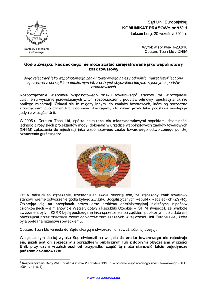 Sąd Unii Europejskiej KOMUNIKAT PRASOWY nr 95/11 Luksemburg, 20 września 2011 r. Wyrok w sprawie T-232/10 Couture Tech Ltd / OHIM Kontakty z Mediami i Informacja Godło Związku Radzieckiego nie może zostać zarejestrowane jako wspólnotowy znak towarowy Jego rejestracji jako wspólnotowego znaku towarowego należy odmówić, nawet jeżeli jest ono sprzeczne z porządkiem publicznym lub z dobrymi obyczajami jedynie w jednym z państw członkowskich Rozporządzenie w sprawie wspólnotowego znaku towarowego1 stanowi, że w przypadku zaistnienia wyraźnie przewidzianych w tym rozporządzeniu podstaw odmowy rejestracji znak nie podlega rejestracji. Odnosi się to między innymi do znaków towarowych, które są sprzeczne z porządkiem publicznym lub z dobrymi obyczajami, i to nawet jeżeli taka podstawa występuje jedynie w części Unii. W 2006 r. Couture Tech Ltd, spółka zajmująca się międzynarodowymi aspektami działalności jednego z rosyjskich projektantów mody, dokonała w urzędzie wspólnotowych znaków towarowych (OHIM) zgłoszenia do rejestracji jako wspólnotowego znaku towarowego odtworzonego poniżej oznaczenia graficznego: OHIM odrzucił to zgłoszenie, uzasadniając swoją decyzję tym, że zgłoszony znak towarowy stanowił wierne odtworzenie godła byłego Związku Socjalistycznych Republik Radzieckich (ZSRR). Opierając się na przepisach prawa oraz praktyce administracyjnej niektórych z państw członkowskich – a mianowicie Węgier, Łotwy i Republiki Czeskiej – OHIM stwierdził, że symbole związane z byłym ZSRR będą postrzegane jako sprzeczne z porządkiem publicznym lub z dobrymi obyczajami przez znaczącą część odbiorców zamieszkałych w tej części Unii Europejskiej, która była poddana reżimowi sowieckiemu. Couture Tech Ltd wniosła do Sądu skargę o stwierdzenie nieważności tej decyzji. W ogłoszonym dzisiaj wyroku Sąd stwierdził na wstępie, że znaku towarowego nie rejestruje się, jeżeli jest on sprzeczny z porządkiem publicznym lub z dobrymi obyczajami w części Unii, przy czym w zależności od przypadku część tę może stanowić także pojedyncze państwo członkowskie. 1 Rozporządzenie Rady (WE) nr 40/94 z dnia 20 grudnia 1993 r. w sprawie wspólnotowego znaku towarowego (Dz.U. 1994, L 11, s. 1). www.curia.europa.eu Sąd zauważył następnie, że przy dokonywaniu wykładni pojęć porządku publicznego i dobrych obyczajów należy uwzględnić nie tylko okoliczności wspólne wszystkim państwom członkowskim Unii, ale również szczególne uwarunkowania każdego z państw członkowskich rozpatrywanych odrębnie, które mogą wpłynąć na sposób postrzegania właściwego kręgu odbiorców znajdujących się na terytorium tych państw. Sąd wyjaśnił przy tym, że w zakresie, w jakim wspólnotowy system znaków towarowych stanowi system autonomiczny, którego stosowanie jest niezależne od wszelkich systemów krajowych, przepisy prawa i praktyka administracyjna niektórych państw członkowskich są brane pod uwagę nie ze względu na ich walor normatywny, ale dlatego, że stanowią faktyczne przesłanki pozwalające ocenić sposób, w jaki właściwy krąg odbiorców znajdujących się w rozpatrywanych państwach członkowskich postrzega symbole związane z byłym ZSRR. Sąd stwierdził wreszcie, że OHIM nie popełnił błędu w ocenie, uznając, na podstawie analizy elementów dotyczących sytuacji panującej w szczególności na Węgrzech, że w odczuciu właściwego kręgu odbiorców zgłoszony znak towarowy jest sprzeczny z porządkiem publicznym lub z dobrymi obyczajami. Zgodnie bowiem z przepisami prawa węgierskiego sierp, młot i czerwona gwiazda pięcioramienna są uważane za „symbole despotyzmu”, a ich używanie jest sprzeczne z porządkiem publicznym. A zatem w ocenie Sądu, zważywszy na to, że rejestracji znaku towarowego należy odmówić, jeżeli znak ten jest sprzeczny z porządkiem publicznym lub z dobrymi obyczajami jedynie w części Unii – także gdy jest to pojedyncze państwo członkowskie – nie było potrzeby rozpatrzenia innych kwestii, dotyczących w szczególności sposobu postrzegania tego oznaczenia przez właściwy krąg odbiorców znajdujących się na Łotwie i w Republice Czeskiej. W konsekwencji Sąd oddalił żądanie Couture Tech Ltd. UWAGA: Odwołanie od orzeczenia Sądu, ograniczone do kwestii prawnych, może zostać wniesione do Trybunału w terminie dwóch miesięcy od dnia zawiadomienia o tym orzeczeniu. UWAGA: Celem skargi o stwierdzenie nieważności jest doprowadzenie do uznania za nieważne aktów instytucji Unii, które są sprzeczne z prawem Unii. Państwa członkowskie, instytucje wspólnotowe oraz jednostki mogą, pod pewnymi warunkami, wnieść skargę o stwierdzenie nieważności do Trybunału Sprawiedliwości lub Sądu. Jeżeli skarga jest zasadna, stwierdza się nieważność aktu. Instytucja, której to dotyczy, powinna zaradzić ewentualnej próżni prawnej spowodowanej nieważnością tego aktu. Dokument nieoficjalny, sporządzony na użytek mediów, który nie wiąże Sądu. Pełny tekst wyroku jest publikowany na stronie internetowej CURIA w dniu ogłoszenia Osoba odpowiedzialna za kontakty z mediami: Ireneusz Kolowca (+352) 4303 2793 Nagranie wideo z ogłoszenia wyroku jest dostępne przez „Europe by Satellite” (+32) 2 2964106 www.curia.europa.eu