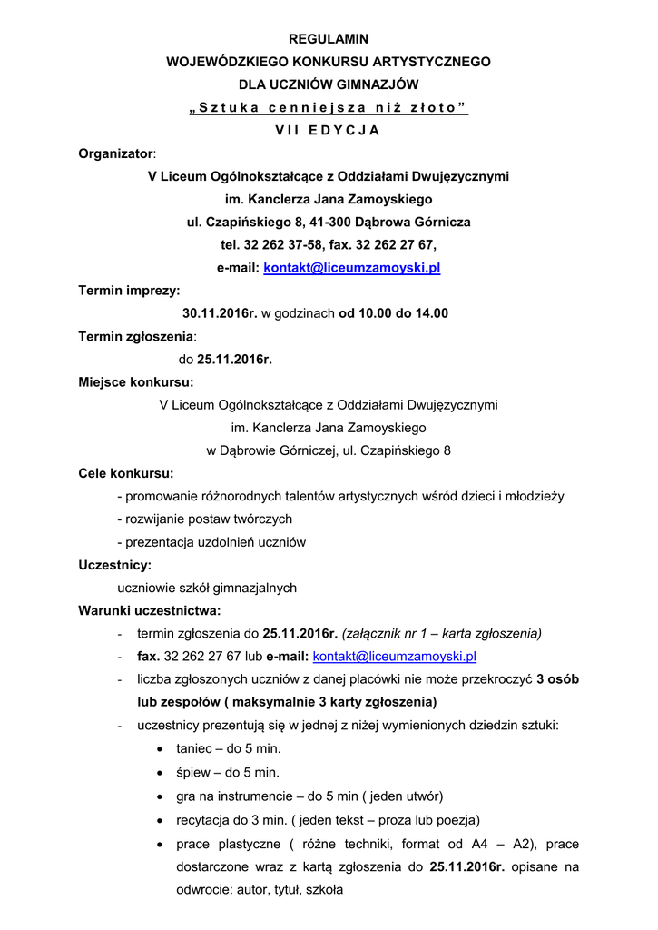 REGULAMIN WOJEWÓDZKIEGO KONKURSU ARTYSTYCZNEGO DLA UCZNIÓW GIMNAZJÓW „Sztuka cenniejsza niż złoto” VII EDYCJA Organizator: V Liceum Ogólnokształcące z Oddziałami Dwujęzycznymi im. Kanclerza Jana Zamoyskiego ul. Czapińskiego 8, 41-300 Dąbrowa Górnicza tel. 32 262 37-58, fax. 32 262 27 67, e-mail: [email protected] Termin imprezy: 30.11.2016r. w godzinach od 10.00 do 14.00 Termin zgłoszenia: do 25.11.2016r. Miejsce konkursu: V Liceum Ogólnokształcące z Oddziałami Dwujęzycznymi im. Kanclerza Jana Zamoyskiego w Dąbrowie Górniczej, ul. Czapińskiego 8 Cele konkursu: - promowanie różnorodnych talentów artystycznych wśród dzieci i młodzieży - rozwijanie postaw twórczych - prezentacja uzdolnień uczniów Uczestnicy: uczniowie szkół gimnazjalnych Warunki uczestnictwa: - termin zgłoszenia do 25.11.2016r. (załącznik nr 1 – karta zgłoszenia) - fax. 32 262 27 67 lub e-mail: [email protected] - liczba zgłoszonych uczniów z danej placówki nie może przekroczyć 3 osób lub zespołów ( maksymalnie 3 karty zgłoszenia) - uczestnicy prezentują się w jednej z niżej wymienionych dziedzin sztuki: taniec – do 5 min. śpiew – do 5 min. gra na instrumencie – do 5 min ( jeden utwór) recytacja do 3 min. ( jeden tekst – proza lub poezja) prace plastyczne ( różne techniki, format od A4 – A2), prace dostarczone wraz z kartą zgłoszenia do 25.11.2016r. opisane na odwrocie: autor, tytuł, szkoła teatr jednego aktora lub „wywiedzione ze słowa” – do 7 min. Podkłady muzyczne prosimy przygotować w formacie MP3 i przesłać do 25.11.2016r. na adres email: [email protected] (temat: VII edycja „Sztuka cenniejsza niż złoto”; treść: dane – szkoła, uczestnik ; załącznik – plik MP3) Zasady punktowania: - skala punktów od 0 do 5 Dla zwycięzców przewidziane są cenne i atrakcyjne nagrody. ARTYŚCI- GIMNAZJALIŚCI- GÓRĄ !!! Serdecznie zapraszamy!!! Koordynatorzy mgr Agata Benduska mgr Anna Chłosta mgr Aneta Cupiał załącznik nr 1 KARTA ZGŁOSZENIA Wojewódzki Konkurs Artystyczny VII edycja imię i nazwisko ucznia, członków zespołu …………………………………………......................................... ................................................................................................... ................................................................................................... wiek ..................... klasa ....................... dokładna nazwa szkoły: ................................................................................................. ................................................................................................. ................................................................................................. ................................................................................................ adres szkoły ................................................................................................ ................................................................................................ ................................................................................................ ................................................................................................ tel/fax ................................................................. e-mail szkoły ................................................................ imię i nazwisko opiekuna ................................................................ kategoria ................................................................................ wymagania techniczne niezbędne do występu ………………………………………………………………………………… ……………………………………………………………...………………… ………………………………………… Podpis opiekuna