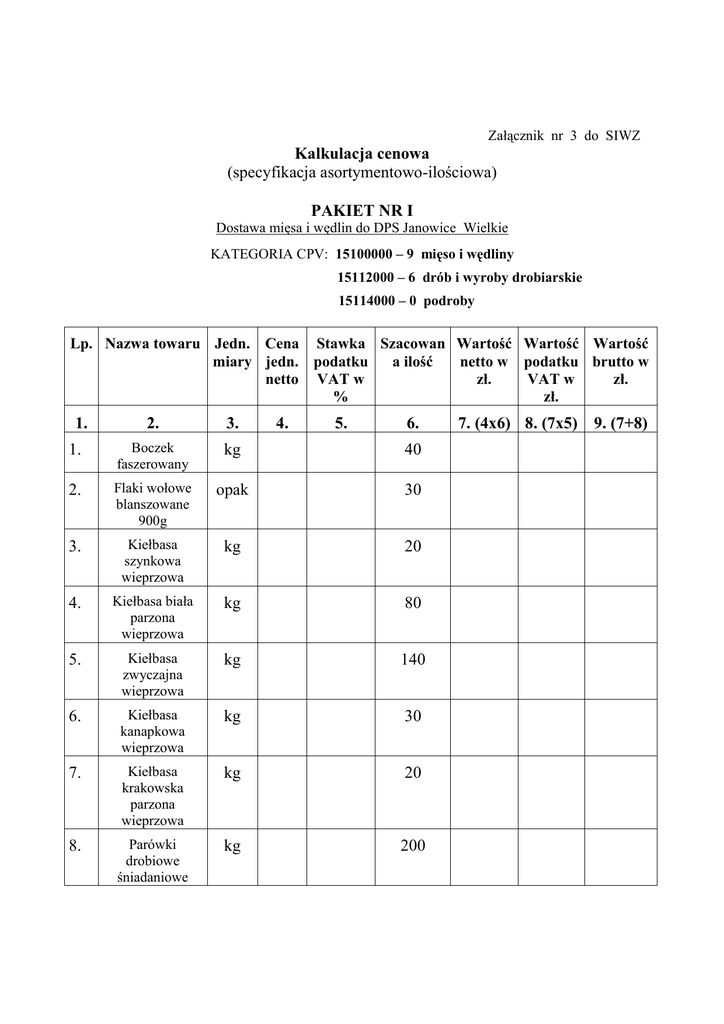 Załącznik nr 3 do SIWZ Kalkulacja cenowa (specyfikacja asortymentowo-ilościowa) PAKIET NR I Dostawa mięsa i wędlin do DPS Janowice Wielkie KATEGORIA CPV: 15100000 – 9 mięso i wędliny 15112000 – 6 drób i wyroby drobiarskie 15114000 – 0 podroby Lp. Nazwa towaru Jedn. Cena Stawka Szacowan Wartość Wartość Wartość miary jedn. podatku a ilość netto w podatku brutto w netto VAT w zł. VAT w zł. % zł. 1. 2. 3. 4. 5. 6. 1. Boczek faszerowany kg 40 2. Flaki wołowe blanszowane 900g opak 30 3. Kiełbasa szynkowa wieprzowa kg 20 4. Kiełbasa biała parzona wieprzowa kg 80 5. Kiełbasa zwyczajna wieprzowa kg 140 6. Kiełbasa kanapkowa wieprzowa kg 30 7. Kiełbasa krakowska parzona wieprzowa kg 20 8. Parówki drobiowe śniadaniowe kg 200 7. (4x6) 8. (7x5) 9. (7+8) 9. Parówki delikatesowe kg 230 wieprzowe 10. Kiełbasa podwawelska kg 30 11. Kiełbasa parówkowa wieprzowa kg 200 12. Kiełbasa z pieca kg 40 Kiełbasa z beczki kg 40 13. Kiełbasa mielonka tyrolska kg 50 14. Kiełbasa śląska wieprzowa kg 400 15. Kiełbasa piwna wieprzowa kg 30 16. Kiełbasa jałowcowa wieprzowa kg 2 kg 300 gruba 17. Kiełbasa grilowa wieprzowa 18. Kiełbasa mortadela drobiowa kg 100 19. Kiełbasa mortadela wieprzowa kg 30 20. Kaszanka krupniok kg 140 21. Mięso antrykot wołowy kg 40 22. Mięso karczek wieprzowy z/k kg 200 23. Mięso karczek wieprzowy b/k kg 300 24. Mięso łopatka wieprzowa z/k kg 200 25. Mięso łopatka wieprzowa b/k kg 500 26. Mięso wieprzowe mielone extra kg 30 kg 50 27. Mięso gulaszowe wieprzowe 28. Mięso schab wieprzowy z/k kg 100 29. Mięso schab wieprzowy b/k kg 50 30. Wątroba drobiowa kg 140 31. Mięso Ŝeberka wieprzowe paski kg 40 32. Kurczaki św. kg 500 33. Kurczak udka kg 570 34. Kiełbasa bigosowa kg 40 35. Baleron gotowany kg 40 36. Pieczeń a”la kaczka kg 50 37. Pieczeń z warzywami kg 50 38. Pasztet wieprzowy pieczony kg 20 39. Pasztetowa drobiowa kg 160 kg 15 kg 30 40. Pieczeń rzymska 41. Pieczeń meksykańska 42. Pierś królewiecka kg 50 43. Salceson ozorkowy kg 30 kg 30 44. Salceson wianek 45. Salceson wieprzowy delikatesowy kg 80 46. Szynka wieprzowa wędzona parzona kg 40 47. Polędwica kanadyjska kg 40 48. Ozory wieprzowe kg 40 49. Porcje rosołowe kg 820 50. Serca wieprzowe kg 20 kg 20 52. Nerki wieprzowe kg 20 53. Ogonówka wędzona parzona kg 40 54. Szynka konserwowa kg 50 kg 50 51. Płucka wieprzowe 55. Szynka domowa pieczona 56. Szynka konserwowa z kurczaka kg 50 57. Polędwica sopocka tradycyjna kg 40 58. Wędzonka wieprzowa myśliwska kg 30 59. Konserwa wieprzowa typu 300g 400 turystyczna lub równowaŜna 60. Pasztet drobiowy 160g 150szt typu prochowicki lub równowaŜny 61. Pasztet drobiowy 135 g 100 szt typu prochowicki lub równowaŜny 62. Pasztet drobiowy 500g 250 szt słoik 63. Słonina kg 20 64. Smalec kostka kg 50 RAZEM POZYCJE 1 – 64 Dostarczane mięso oraz podroby powinny być świeŜe, schłodzone, bez wad jakościowych, /kolor mięsa jasno-róŜowy właściwy jak dla mięsa świeŜego/. Dostarczane wędliny powinny być świeŜe, schłodzone, bez wad jakościowych. Wszystkie wyroby muszą być zgodne z ofertą wieprzowe i drobiowe. Wartość oferty netto ..............................................zł słownie........................................................................................................................Wartość podatku VAT ............................................zł. słownie : ...................................................................................................................................Wartość oferty brutto ..............................................zł. słownie : ................................................................................................................................... Uwaga: Podana ilość towarów jest ilością szacunkową. Zamawiający zastrzega sobie moŜliwość zmian ilościowych w poszczególnych pozycjach, a takŜe zamówienia mniejszej ilości towarów. .................................................... (miejscowość, data) ................................................................ (pieczęć i podpis osób wykazanych w dokumencie uprawniającym do występowania w obrocie prawnym lub posiadających pełnomocnictwo)