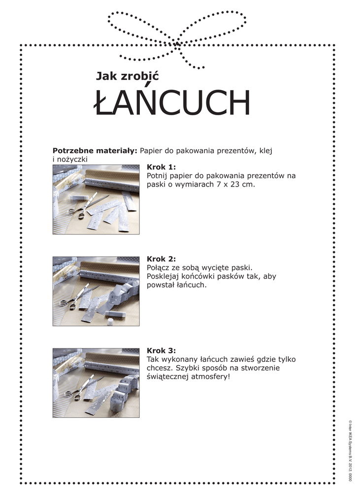 Jak zrobić ŁAŃCUCH Potrzebne materiały: Papier do pakowania prezentów, klej i nożyczki Krok 1: Potnij papier do pakowania prezentów na paski o wymiarach 7 x 23 cm. Krok 2: Połącz ze sobą wycięte paski. Posklejaj końcówki pasków tak, aby powstał łańcuch. Krok 3: Tak wykonany łańcuch zawieś gdzie tylko chcesz. Szybki sposób na stworzenie świątecznej atmosfery! © Inter IKEA Systems B.V. 2012. 0000