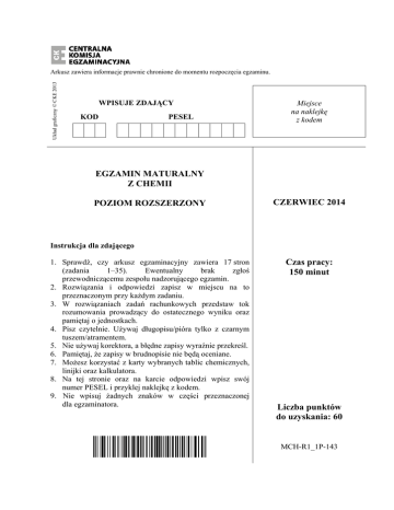 Układ graficzny © CKE 2013 Arkusz zawiera informacje prawnie chronione do momentu rozpoczęcia egzaminu. WPISUJE ZDAJĄCY KOD PESEL Miejsce na naklejkę z kodem EGZAMIN MATURALNY Z CHEMII POZIOM ROZSZERZONY CZERWIEC 2014 Instrukcja dla zdającego 1. Sprawdź, czy arkusz egzaminacyjny zawiera 17 stron (zadania 1–35). Ewentualny brak zgłoś przewodniczącemu zespołu nadzorującego egzamin. 2. Rozwiązania i odpowiedzi zapisz w miejscu na to przeznaczonym przy każdym zadaniu. 3. W rozwiązaniach zadań rachunkowych przedstaw tok rozumowania prowadzący do ostatecznego wyniku oraz pamiętaj o jednostkach. 4. Pisz czytelnie. Używaj długopisu/pióra tylko z czarnym tuszem/atramentem. 5. Nie używaj korektora, a błędne zapisy wyraźnie przekreśl. 6. Pamiętaj, że zapisy w brudnopisie nie będą oceniane. 7. Możesz korzystać z karty wybranych tablic chemicznych, linijki oraz kalkulatora. 8. Na tej stronie oraz na karcie odpowiedzi wpisz swój numer PESEL i przyklej naklejkę z kodem. 9. Nie wpisuj żadnych znaków w części przeznaczonej dla egzaminatora. Czas pracy: 150 minut Liczba punktów do uzyskania: 60 MCH-R1_1P-143 Egzamin maturalny z chemii Poziom rozszerzony 2 Zadanie 1. (1 pkt) Wypełnij tabelę, wpisując literę P, jeżeli zdanie jest prawdziwe, lub literę F, jeżeli jest fałszywe. Zdanie P/F 1. Atom o konfiguracji powłoki walencyjnej 4s24p3 zawiera w rdzeniu atomowym 18 elektronów. 2. Jony K , S 2 , Ca 2 mają taką samą konfigurację elektronową. 3. Elektrony w jonach Na , F , Mg 2 rozmieszczone są na podpowłokach 1s, 2s i 2p. Zadanie 2. (1 pkt) Poniżej przedstawiono symbole nuklidów. 48 22 50 24 E E 120 50 E 50 22 E 24 12 112 50 E E 54 24 E Podaj, jaką liczbę pierwiastków chemicznych prezentuje zbiór nuklidów o podanych symbolach. Liczba pierwiastków: ................................................................................................................... Zadanie 3. (1 pkt) W tabeli przedstawiono wartości liczb kwantowych opisujących stan czterech elektronów. Liczby kwantowe Numer elektronu główna n poboczna l magnetyczna m magnetyczna spinowa ms I 3 2 1 +1/2 II 4 2 –1 +1/2 III 3 1 1 –1/2 IV 3 2 0 +1/2 Podaj numery dwóch elektronów, które należą do tej samej podpowłoki energetycznej, oraz napisz symbol tej podpowłoki. Numery elektronów: .................................................................................................................... Symbol podpowłoki: .................................................................................................................... Egzamin maturalny z chemii Poziom rozszerzony 3 Zadanie 4. (2 pkt) Trzy pierwiastki X, Y i Z mają liczby atomowe o wartościach równych kolejno: 8, 17 i 20. a) Stosując symbole chemiczne pierwiastków X, Y i Z, napisz wzory substancji powstających w wyniku połączenia atomów lub jonów: I – pierwiastków X i Z II – pierwiastków Y i Z III – pierwiastka Y I ......................................... II ......................................... III ......................................... b) Określ charakter chemiczny związku I, zapisując w formie jonowej równanie odpowiedniej reakcji chemicznej. ....................................................................................................................................................... Zadanie 5. (1 pkt) W wyniku emisji cząstki β z jądra radioizotopu I powstało jądro ołowiu emisji cząstki α z jądra radioizotopu II powstało jądro ołowiu 212 Pb. 210 Pb, a w wyniku Ustal symbole chemiczne radioizotopów I i II oraz podaj wartości liczb A i Z. Radioizotop I Radioizotop II Zadanie 6. (2 pkt) Oblicz okres półtrwania τ 1/ 2 izotopu fransu 223 Fr, jeżeli z próbki o masie początkowej 0,64 grama po upływie 1 godziny i 45 minut pozostało 0,02 grama izotopu. Obliczenia: Odpowiedź: Egzamin maturalny z chemii Poziom rozszerzony 4 Zadanie 7. (2 pkt) a) Napisz wzór elektronowy dichlorku karbonylu (fosgenu) COCl2 i wzór elektronowy kwasu metanowego (mrówkowego). Wzór elektronowy dichlorku karbonylu Wzór elektronowy kwasu metanowego b) Podaj liczbę wolnych (niewiążących) par elektronowych oraz liczbę wiązań σ i π w cząsteczkach tych związków. Nazwa związku Liczba wolnych (niewiążących) par elektronowych wiązań σ wiązań π dichlorek karbonylu kwas metanowy Zadanie 8. (2 pkt) Amoniak otrzymuje się na skalę przemysłową w wyniku bezpośredniej syntezy azotu z wodorem w obecności katalizatora, pod zwiększonym ciśnieniem i w temperaturze 773 K, zgodnie z równaniem: katalizator, p,T N2 + 3H2 2NH3 Przygotowano stechiometryczną mieszaninę azotu z wodorem i zainicjowano reakcję, którą przerwano, gdy przereagowało 20% objętościowych azotu użytego do syntezy. Oblicz w procentach objętościowych skład mieszaniny poreakcyjnej, w chwili, gdy przerwano reakcję. Wynik podaj z dokładnością do pierwszego miejsca po przecinku. Obliczenia: Odpowiedź: Egzamin maturalny z chemii Poziom rozszerzony 5 Zadanie 9. (2 pkt) Bezbarwny tetratlenek diazotu ulega przemianie zilustrowanej równaniem: N2O4 (g) ⇄ 2NO2 (g) ΔH = 62,8 kJ Uzupełnij poniższe zdania dotyczące tej przemiany. Wybierz i podkreśl jedno określenie spośród podanych w każdym nawiasie. 1. Obniżenie o kilkanaście stopni temperatury mieszaniny tlenków NO2 i N2O4 będących w stanie równowagi w temperaturze pokojowej spowoduje (wzrost / zmniejszenie) intensywności brunatnopomarańczowej barwy mieszaniny. 2. Zachodzi wówczas w większym stopniu proces (dysocjacji / asocjacji) (N2O4 / NO2). 3. Stała równowagi (asocjacji / dysocjacji) (N2O4 / NO2) maleje. Zadanie 10. (2 pkt) Oblicz standardową entalpię tworzenia etanolu z pierwiastków. Skorzystaj z podanych równań reakcji i z wartości standardowych entalpii spalania. Wynik podaj z dokładnością do drugiego miejsca po przecinku. 1 O2 ( g) →H2O (c) 2 C (grafit) + O2 (g) → CO2 (g) ΔH 1o = – 285,83 kJ · m