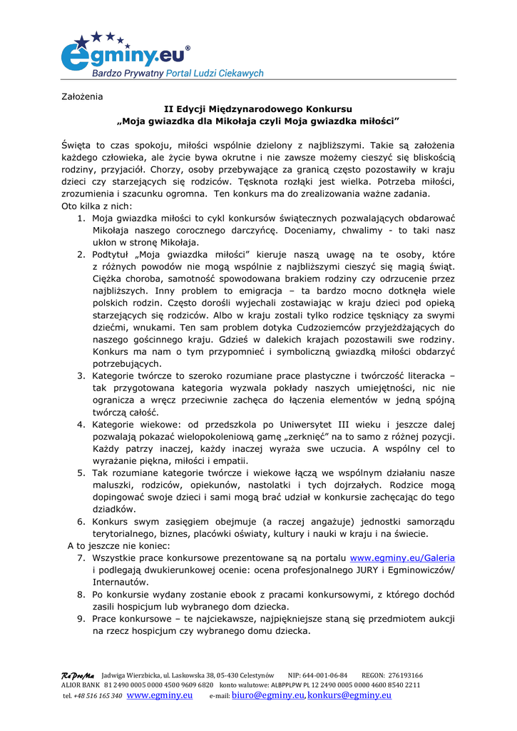 Założenia II Edycji Międzynarodowego Konkursu „Moja gwiazdka dla Mikołaja czyli Moja gwiazdka miłości” Święta to czas spokoju, miłości wspólnie dzielony z najbliższymi. Takie są założenia każdego człowieka, ale życie bywa okrutne i nie zawsze możemy cieszyć się bliskością rodziny, przyjaciół. Chorzy, osoby przebywające za granicą często pozostawiły w kraju dzieci czy starzejących się rodziców. Tęsknota rozłąki jest wielka. Potrzeba miłości, zrozumienia i szacunku ogromna. Ten konkurs ma do zrealizowania ważne zadania. Oto kilka z nich: 1. Moja gwiazdka miłości to cykl konkursów świątecznych pozwalających obdarować Mikołaja naszego corocznego darczyńcę. Doceniamy, chwalimy - to taki nasz ukłon w stronę Mikołaja. 2. Podtytuł „Moja gwiazdka miłości” kieruje naszą uwagę na te osoby, które z różnych powodów nie mogą wspólnie z najbliższymi cieszyć się magią świąt. Ciężka choroba, samotność spowodowana brakiem rodziny czy odrzucenie przez najbliższych. Inny problem to emigracja – ta bardzo mocno dotknęła wiele polskich rodzin. Często dorośli wyjechali zostawiając w kraju dzieci pod opieką starzejących się rodziców. Albo w kraju zostali tylko rodzice tęskniący za swymi dziećmi, wnukami. Ten sam problem dotyka Cudzoziemców przyjeżdżających do naszego gościnnego kraju. Gdzieś w dalekich krajach pozostawili swe rodziny. Konkurs ma nam o tym przypomnieć i symboliczną gwiazdką miłości obdarzyć potrzebujących. 3. Kategorie twórcze to szeroko rozumiane prace plastyczne i twórczość literacka – tak przygotowana kategoria wyzwala pokłady naszych umiejętności, nic nie ogranicza a wręcz przeciwnie zachęca do łączenia elementów w jedną spójną twórczą całość. 4. Kategorie wiekowe: od przedszkola po Uniwersytet III wieku i jeszcze dalej pozwalają pokazać wielopokoleniową gamę „zerknięć” na to samo z różnej pozycji. Każdy patrzy inaczej, każdy inaczej wyraża swe uczucia. A wspólny cel to wyrażanie piękna, miłości i empatii. 5. Tak rozumiane kategorie twórcze i wiekowe łączą we wspólnym działaniu nasze maluszki, rodziców, opiekunów, nastolatki i tych dojrzałych. Rodzice mogą dopingować swoje dzieci i sami mogą brać udział w konkursie zachęcając do tego dziadków. 6. Konkurs swym zasięgiem obejmuje (a raczej angażuje) jednostki samorządu terytorialnego, biznes, placówki oświaty, kultury i nauki w kraju i na świecie. A to jeszcze nie koniec: 7. Wszystkie prace konkursowe prezentowane są na portalu www.egminy.eu/Galeria i podlegają dwukierunkowej ocenie: ocena profesjonalnego JURY i Egminowiczów/ Internautów. 8. Po konkursie wydany zostanie ebook z pracami konkursowymi, z którego dochód zasili hospicjum lub wybranego dom dziecka. 9. Prace konkursowe – te najciekawsze, najpiękniejsze staną się przedmiotem aukcji na rzecz hospicjum czy wybranego domu dziecka. ReProMa Jadwiga Wierzbicka, ul. Laskowska 38, 05-430 Celestynów NIP: 644-001-06-84 REGON: 276193166 ALIOR BANK 81 2490 0005 0000 4500 9609 6820 konto walutowe: ALBPPLPW PL 12 2490 0005 0000 4600 8540 2211 tel. +48 516 165 340 www.egminy.eu e-mail: [email protected], [email protected] Reasumując: Konkurs to „klęska” sukcesu. Tu są sami zwycięzcy, tu każdy odnosi sukces i jest doceniony. Najmłodsi otrzymują w wersji elektronicznej dyplomy, a także nagrody rzeczowe. Uczestnicy konkursu mogą zaprezentować swe prace i umiejętności na tle innych nadesłanych prac. Prezentują je w Internecie na www.egminy.eu/Galeria. Promują siebie. Ich bliscy wspierają ich i dopingują dodając łapki polubień. Po zakończeniu konkursu prace żyją dalej stając się przedmiotem licytacji na rzecz potrzebujących. Honorowe Patronaty, Partnerzy i Sponsorzy dobrze lokują swą empatię. Plakaty, dyplomy, regulamin konkursu – to wszystko rozsyłane jest drogą elektroniczną i każda edycja konkursu to minimum kilkadziesiąt tysięcy e-maili. Można dodatkowo zaistnieć wspierając innych w dobrym stylu w trakcie wielokierunkowych działań około konkursowych. Praca wszystkich jest doceniona i nie idzie w zapomnienie – prace konkursowe w różnej formie trafiają do potrzebujących – a przecież zadowolenie na buziakach wielu jest bezcenne. To nasza wspólna gwiazdka miłości. Zapraszamy do udziału w każdej dogodnej formie ReProMa Jadwiga Wierzbicka, ul. Laskowska 38, 05-430 Celestynów NIP: 644-001-06-84 REGON: 276193166 ALIOR BANK 81 2490 0005 0000 4500 9609 6820 konto walutowe: ALBPPLPW PL 12 2490 0005 0000 4600 8540 2211 tel. +48 516 165 340 www.egminy.eu e-mail: [email protected], [email protected]