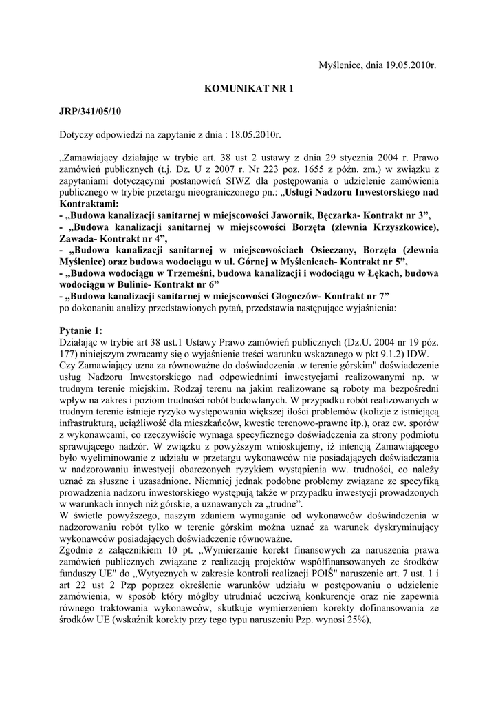 Myślenice, dnia 19.05.2010r. KOMUNIKAT NR 1 JRP/341/05/10 Dotyczy odpowiedzi na zapytanie z dnia : 18.05.2010r. „Zamawiający działając w trybie art. 38 ust 2 ustawy z dnia 29 stycznia 2004 r. Prawo zamówień publicznych (t.j. Dz. U z 2007 r. Nr 223 poz. 1655 z późn. zm.) w związku z zapytaniami dotyczącymi postanowień SIWZ dla postępowania o udzielenie zamówienia publicznego w trybie przetargu nieograniczonego pn.: „Usługi Nadzoru Inwestorskiego nad Kontraktami: - „Budowa kanalizacji sanitarnej w miejscowości Jawornik, Bęczarka- Kontrakt nr 3”, - „Budowa kanalizacji sanitarnej w miejscowości Borzęta (zlewnia Krzyszkowice), Zawada- Kontrakt nr 4”, - „Budowa kanalizacji sanitarnej w miejscowościach Osieczany, Borzęta (zlewnia Myślenice) oraz budowa wodociągu w ul. Górnej w Myślenicach- Kontrakt nr 5”, - „Budowa wodociągu w Trzemeśni, budowa kanalizacji i wodociągu w Łękach, budowa wodociągu w Bulinie- Kontrakt nr 6” - „Budowa kanalizacji sanitarnej w miejscowości Głogoczów- Kontrakt nr 7” po dokonaniu analizy przedstawionych pytań, przedstawia następujące wyjaśnienia: Pytanie 1: Działając w trybie art 38 ust.1 Ustawy Prawo zamówień publicznych (Dz.U. 2004 nr 19 póz. 177) niniejszym zwracamy się o wyjaśnienie treści warunku wskazanego w pkt 9.1.2) IDW. Czy Zamawiający uzna za równoważne do doświadczenia .w terenie górskim" doświadczenie usług Nadzoru Inwestorskiego nad odpowiednimi inwestycjami realizowanymi np. w trudnym terenie miejskim. Rodzaj terenu na jakim realizowane są roboty ma bezpośredni wpływ na zakres i poziom trudności robót budowlanych. W przypadku robót realizowanych w trudnym terenie istnieje ryzyko występowania większej ilości problemów (kolizje z istniejącą infrastrukturą, uciążliwość dla mieszkańców, kwestie terenowo-prawne itp.), oraz ew. sporów z wykonawcami, co rzeczywiście wymaga specyficznego doświadczenia za strony podmiotu sprawującego nadzór. W związku z powyższym wnioskujemy, iż intencją Zamawiającego było wyeliminowanie z udziału w przetargu wykonawców nie posiadających doświadczania w nadzorowaniu inwestycji obarczonych ryzykiem wystąpienia ww. trudności, co należy uznać za słuszne i uzasadnione. Niemniej jednak podobne problemy związane ze specyfiką prowadzenia nadzoru inwestorskiego występują także w przypadku inwestycji prowadzonych w warunkach innych niż górskie, a uznawanych za „trudne”. W świetle powyższego, naszym zdaniem wymaganie od wykonawców doświadczenia w nadzorowaniu robót tylko w terenie górskim można uznać za warunek dyskryminujący wykonawców posiadających doświadczenie równoważne. Zgodnie z załącznikiem 10 pt. „Wymierzanie korekt finansowych za naruszenia prawa zamówień publicznych związane z realizacją projektów współfinansowanych ze środków funduszy UE" do „Wytycznych w zakresie kontroli realizacji POIŚ" naruszenie art. 7 ust. 1 i art 22 ust 2 Pzp poprzez określenie warunków udziału w postępowaniu o udzielenie zamówienia, w sposób który mógłby utrudniać uczciwą konkurencje oraz nie zapewnia równego traktowania wykonawców, skutkuje wymierzeniem korekty dofinansowania ze środków UE (wskaźnik korekty przy tego typu naruszeniu Pzp. wynosi 25%), Odpowiedź: Zamawiający nie wyraża zgody na zmianę warunków określonych w pkt. 9.1.2) SIWZ w zakresie doświadczenia polegającego na świadczeniu usług Nadzoru Inwestorskiego nad realizacją odpowiednich inwestycji w terenie górskim. Zmiana zaproponowana przez Wykonawcę, polegająca na uznaniu doświadczenia w nadzorze w trudnym terenie miejskim, w żadnym wypadku nie odpowiada wymogom Zamawiającego. Warunki określone przez Zamawiającego związane są z nadzorem nad robotami, które mają być wykonane w terenie skalistym, trudnym, a jednocześnie na terenie gdzie występują znaczne spadki i różnice wysokości terenu na danych odcinkach, nie zaś z trudnościami natury prawnej, czy logistycznej, jakie pojawiają się w przypadku nadzorowania robót w centrum miasta. Prowadzenie robót w terenie górskim, wymaga nie tylko od wykonawcy robót, ale także od Inspektorów Nadzoru, odpowiedniego doświadczenia w nadzorowaniu tego typu prac. Jednocześnie Zamawiający podkreśla, iż postawienie warunków, odnoszących się bezpośrednio do specyfiki realizowanego zamówienia, nie może być traktowane jako ograniczanie konkurencji i dyskryminację Wykonawców. Postanowienia Specyfikacji Istotnych Warunków Zamówienia są przez Zamawiającego jasno sprecyzowane, kierowane do kręgu Wykonawców, specjalizujących się w przedmiocie zamówienia oraz nie faworyzują żadnego z potencjalnych Wykonawców, a jednocześnie w żaden sposób nie ograniczają kręgu oferentów zamierzających wziąć udział w niniejszym postępowaniu przetargowym, bowiem wymagania Zamawiającego zostały określone jednolicie w stosunku do wszystkich Wykonawców. Stanowisko Zamawiającego potwierdza również orzecznictwo KIO: „Wskazanie w SIWZ wymogów technicznych dotyczących przedmiotu zamówienia trudnych do spełnienia przez Odwołującego lub innego oferenta nie stanowi dostatecznej podstawy do uznania, że przedmiot zamówienia określony został w sposób naruszający zasady wynikające z art. 7 ust. 1, art. 22 ust. 2 oraz 29 ust. 2 ustawy - Prawo zamówień publicznych.” (wyrok ZA z dnia 07.02.2005, sygn. UZP/ZO/0-175/05). „1. Wymagania podmiotowe nie mogą być nadmierne, ale również nie mogą być niewystarczające. 2. Przez niezbędne doświadczenie należy rozumieć potwierdzone w praktyce posiadanie umiejętności w zakresie wykonywania danego rodzaju zamówienia.” (wyrok KIO z dnia 27.08.2009 r. sygn. akt: KIO/UZP 1056/09 publ. LEX nr 515899). „Zamawiający nie może dostosowywać SIWZ do warunków technicznych wygodnych dla poszczególnych wykonawców, obniżając wymagania techniczne w odniesieniu do swoich potrzeb. Przyję