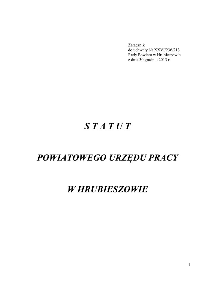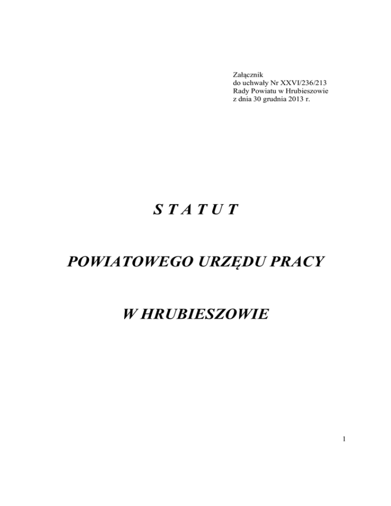Załącznik do uchwały Nr XXVI/236/213 Rady Powiatu w Hrubieszowie z dnia 30 grudnia 2013 r. STATUT POWIATOWEGO URZĘDU PRACY W HRUBIESZOWIE 1 STATUT POWIATOWEGO URZĘDU PRACY W HRUBIESZOWIE Rozdział I Postanowienia ogólne §1 1. Powiatowy Urząd Pracy w Hrubieszowie wchodzi w skład powiatowej administracji zespolonej Powiatu Hrubieszowskiego. 2. Powiatowy Urząd Pracy w Hrubieszowie jest jednostką budżetową, nie posiadającą osobowości prawnej, działającą jako wyodrębniona, samodzielna jednostka budżetowa. 3. Siedzibą Powiatowego Urzędu Pracy w Hrubieszowie jest - miasto Hrubieszów, ul. Leśmiana 11. 4. Terenem działania Powiatowego Urzędu Pracy w Hrubieszowie jest obszar Powiatu Hrubieszowskiego obejmujący następujące gminy: 1/ Gmina Miasto Hrubieszów, 2/ Gmina Hrubieszów, 3/ Gmina Dołhobyczów, 4/ Gmina Horodło, 5/ Gmina Mircze, 6/ Gmina Trzeszczany, 7/ Gmina Uchanie, 2 8/ Gmina Werbkowice. 5. W/w zakres właściwości terytorialnej został ustalony w oparciu o Statut Powiatu Hrubieszowskiego. 6. Zwierzchnictwo nad Powiatowym Urzędem Pracy w Hrubieszowie sprawuje Starosta Hrubieszowski będący organem zatrudnienia. §2 Powiatowy Urząd Pracy w Hrubieszowie używa pieczęci podłużnej o treści: Powiatowy Urząd Pracy w Hrubieszowie ul. Leśmiana 11 22 – 500 Hrubieszów tel./fax 696 26 91, 696 26 92 §3 Powiatowy Urząd Pracy w Hrubieszowie działa w szczególności na podstawie następujących aktów prawnych: 1/ ustawy z dnia 20 kwietnia 2004 roku „o promocji zatrudnienia i instytucjach rynku pracy” /t.j. Dz. U. z 2013 r., poz. 674 z późn. zm./, 2/ ustawy z dnia 27 sierpnia 1997 roku „o rehabilitacji zawodowej i społecznej oraz zatrudnianiu osób niepełnosprawnych” /Dz. U. z 2011 Nr 127, poz. 721 z późn. zm./, 3/ ustawy z dnia 5 czerwca 1998 roku „o samorządzie powiatowym” /t.j. Dz. U. z 2013 poz. 595 z późn. zm./, 4/ ustawy z dnia 21 listopada 2008 roku „o pracownikach samorządowych” /Dz. U. z 2008 r. nr 223 poz. 1458/ 3 5/ ustawy z dnia 27 sierpnia 2009 roku „o finansach publicznych” /Dz. U. z 2013 r. poz. 885 z późn. zm./, 6/ ustawy z dnia 14 czerwca 1960 roku „Kodeks postępowania administracyjnego” /t.j. Dz. U. z 2013 r. poz. 267./, oraz 7/ niniejszego Statutu. Rozdział II Cele i zadania Powiatowego Urzędu Pracy w Hrubieszowie §4 1. Powiatowy Urząd Pracy w Hrubieszowie wykonuje zadania samorządu powiatu w zakresie polityki rynku pracy, o których mowa w art. 9 ust. 1 ustawy z dnia 20kwietnia 2004 roku „o promocji zatrudnienia i instytucjach rynku pracy” / Dz. U. z 2013 r., poz. 674 z późn.zm./ do których należy: 1/ opracowanie i realizacja programu promocji zatrudnienia oraz aktywizacji lokalnego rynku pracy, stanowiącego część powiatowej strategii rozwiązywania problemów społecznych, o której mowa w odrębnych przepisach; 2/ pozyskiwanie i gospodarowanie środkami finansowymi na realizację zadań z zakresu aktywizacji lokalnego rynku pracy; 2a/ udzielanie informacji o możliwościach i zakresie pomocy określonej w ustawie; 3/ udzielanie pomocy bezrobotnym i poszukującym pracy w znalezieniu pracy przez pośrednictwo pracy, poradnictwo zawodowe i informację zawodową oraz pomoc w aktywnym poszukiwaniu pracy; 3a/ udzielenie pomocy pracodawcom w pozyskiwaniu pracowników przez pośrednictwo pracy oraz poradnictwo zawodowe i informację zawodową; 4 4/ rejestrowanie bezrobotnych i poszukujących pracy; 5/ inicjowanie, organizowanie i finansowanie usług i instrumentów rynku pracy; 6/ inicjowanie i wspieranie metodyczne tworzenia klubów pracy działających w innych niż Powiatowy Urząd Pracy instytucjach i organizacjach; 7/ inicjowanie, organizowanie i finansowanie szkoleń i przygotowania zawodowego dorosłych; 8/ opracowywanie analiz i sprawozdań, w tym prowadzenie monitoringu zawodów deficytowych i nadwyżkowych, oraz dokonywanie ocen dotyczących rynku pracy na potrzeby powiatowej rady zatrudnienia oraz organów zatrudnienia; 9/ inicjowanie i realizowanie przedsięwzięć mających na celu rozwiązanie lub złagodzenie problemów związanych z planowanymi zwolnieniami grup pracowników z przyczyn dotyczących zakładu pracy; 10/współdziałanie z powiatowymi radami zatrudnienia w zakresie promocji zatrudnienia oraz wykorzystania środków Funduszu Pracy; 11/współpraca z gminami w zakresie upowszechniania ofert pracy, upowszechniania informacji o usługach poradnictwa zawodowego, szkoleniach, przygotowaniu zawodowym dorosłych, stażach, organizacji robót publicznych oraz zatrudnienia socjalnego na podstawie odrębnych przepisów; 12/współpraca z wojewódzkimi urzędami pracy w zakresie świadczenia podstawowych usług rynku pracy, w tym i aktualizacji informacji zawodowych oraz innych zasobów informacji dotyczących lokalnego rynku pracy przydatnych w poszukiwaniu pracy; 13/przyznawanie i wypłacanie zasiłków oraz innych świadczeń z tytułu bezrobocia; 5 14/ wydawanie decyzji o: a) uznaniu lub odmowie uznania danej osoby za bezrobotną oraz utracie statusu bezrobotnego, b) przyznaniu, odmowie przyznania, wstrzymaniu lub wznowieniu wypłaty oraz utracie lub pozbawieniu prawa do zasiłku, stypendium i innych finansowanych z Funduszu Pracy świadczeń niewynikających z zawartych umów, c) obowiązku zwrotu nienależnie pobranego zasiłku, stypendium, innych nienależnie pobranych świadczeń lub kosztów szkolenia finansowanych z Funduszu Pracy, d) odroczeniu terminu spłaty, rozłożeniu na raty lub umorzeniu części albo całości nienależnie pobranego świadczenia udzielonego z Funduszu Pracy, należności z tytułu: - zwrotu refundacji podmiotowi prowadzącemu działalność gospodarczą kosztów wyposażenia lub doposażenia stanowiska pracy dla skierowanego bezrobotnego, a także - przyznanych bezrobotnemu jednorazowo środków na podjęcie działalności gospodarczej, 15/realizowanie zadań wynikających z koordynacji systemów zabezpieczenia społecznego państw cz