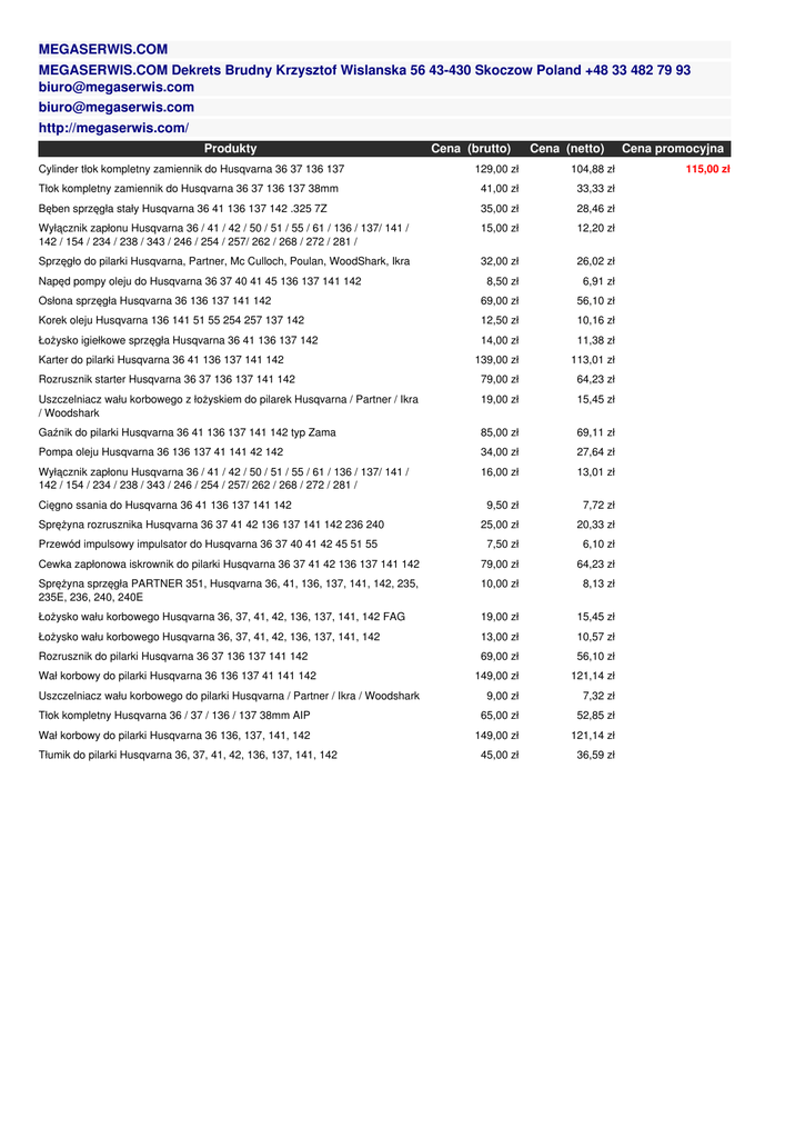MEGASERWIS.COM MEGASERWIS.COM Dekrets Brudny Krzysztof Wislanska 56 43-430 Skoczow Poland +48 33 482 79 93 [email protected] [email protected] http://megaserwis.com/ Produkty Cena (brutto) Cena (netto) Cena promocyjna Cylinder tłok kompletny zamiennik do Husqvarna 36 37 136 137 129,00 zł 104,88 zł 115,00 zł Tłok kompletny zamiennik do Husqvarna 36 37 136 137 38mm 41,00 zł 33,33 zł Bęben sprzęgła stały Husqvarna 36 41 136 137 142 .325 7Z 35,00 zł 28,46 zł Wyłącznik zapłonu Husqvarna 36 / 41 / 42 / 50 / 51 / 55 / 61 / 136 / 137/ 141 / 142 / 154 / 234 / 238 / 343 / 246 / 254 / 257/ 262 / 268 / 272 / 281 / 15,00 zł 12,20 zł Sprzęgło do pilarki Husqvarna, Partner, Mc Culloch, Poulan, WoodShark, Ikra 32,00 zł 26,02 zł 8,50 zł 6,91 zł Osłona sprzęgła Husqvarna 36 136 137 141 142 69,00 zł 56,10 zł Korek oleju Husqvarna 136 141 51 55 254 257 137 142 12,50 zł 10,16 zł Łożysko igiełkowe sprzęgła Husqvarna 36 41 136 137 142 14,00 zł 11,38 zł Napęd pompy oleju do Husqvarna 36 37 40 41 45 136 137 141 142 Karter do pilarki Husqvarna 36 41 136 137 141 142 139,00 zł 113,01 zł Rozrusznik starter Husqvarna 36 37 136 137 141 142 79,00 zł 64,23 zł Uszczelniacz wału korbowego z łożyskiem do pilarek Husqvarna / Partner / Ikra / Woodshark 19,00 zł 15,45 zł Gaźnik do pilarki Husqvarna 36 41 136 137 141 142 typ Zama 85,00 zł 69,11 zł Pompa oleju Husqvarna 36 136 137 41 141 42 142 34,00 zł 27,64 zł Wyłącznik zapłonu Husqvarna 36 / 41 / 42 / 50 / 51 / 55 / 61 / 136 / 137/ 141 / 142 / 154 / 234 / 238 / 343 / 246 / 254 / 257/ 262 / 268 / 272 / 281 / 16,00 zł 13,01 zł Cięgno ssania do Husqvarna 36 41 136 137 141 142 9,50 zł 7,72 zł 25,00 zł 20,33 zł 7,50 zł 6,10 zł Cewka zapłonowa iskrownik do pilarki Husqvarna 36 37 41 42 136 137 141 142 79,00 zł 64,23 zł Sprężyna sprzęgła PARTNER 351, Husqvarna 36, 41, 136, 137, 141, 142, 235, 235E, 236, 240, 240E 10,00 zł 8,13 zł Łożysko wału korbowego Husqvarna 36, 37, 41, 42, 136, 137, 141, 142 FAG 19,00 zł 15,45 zł Łożysko wału korbowego Husqvarna 36, 37, 41, 42, 136, 137, 141, 142 13,00 zł 10,57 zł Sprężyna rozrusznika Husqvarna 36 37 41 42 136 137 141 142 236 240 Przewód impulsowy impulsator do Husqvarna 36 37 40 41 42 45 51 55 Rozrusznik do pilarki Husqvarna 36 37 136 137 141 142 Wał korbowy do pilarki Husqvarna 36 136 137 41 141 142 Uszczelniacz wału korbowego do pilarki Husqvarna / Partner / Ikra / Woodshark 69,00 zł 56,10 zł 149,00 zł 121,14 zł 9,00 zł 7,32 zł Tłok kompletny Husqvarna 36 / 37 / 136 / 137 38mm AIP 65,00 zł 52,85 zł Wał korbowy do pilarki Husqvarna 36 136, 137, 141, 142 149,00 zł 121,14 zł 45,00 zł 36,59 zł Tłumik do pilarki Husqvarna 36, 37, 41, 42, 136, 137, 141, 142