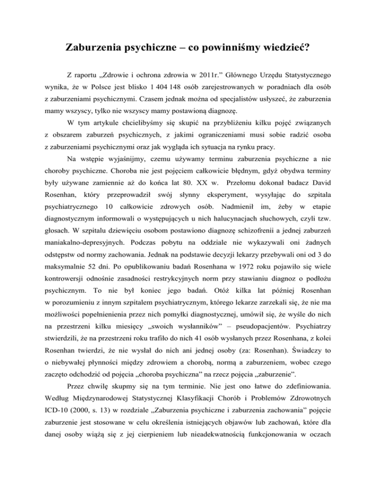 Zaburzenia psychiczne – co powinniśmy wiedzieć? Z raportu „Zdrowie i ochrona zdrowia w 2011r.” Głównego Urzędu Statystycznego wynika, że w Polsce jest blisko 1 404 148 osób zarejestrowanych w poradniach dla osób z zaburzeniami psychicznymi. Czasem jednak można od specjalistów usłyszeć, że zaburzenia mamy wszyscy, tylko nie wszyscy mamy postawioną diagnozę. W tym artykule chcielibyśmy się skupić na przybliżeniu kilku pojęć związanych z obszarem zaburzeń psychicznych, z jakimi ograniczeniami musi sobie radzić osoba z zaburzeniami psychicznymi oraz jak wygląda ich sytuacja na rynku pracy. Na wstępie wyjaśnijmy, czemu używamy terminu zaburzenia psychiczne a nie choroby psychiczne. Choroba nie jest pojęciem całkowicie błędnym, gdyż obydwa terminy były używane zamiennie aż do końca lat 80. XX w. Przełomu dokonał badacz David Rosenhan, który przeprowadził swój słynny eksperyment, wysyłając do szpitala psychiatrycznego 10 całkowicie zdrowych osób. Nadmienił im, żeby w etapie diagnostycznym informowali o występujących u nich halucynacjach słuchowych, czyli tzw. głosach. W szpitalu dziewięciu osobom postawiono diagnozę schizofrenii a jednej zaburzeń maniakalno-depresyjnych. Podczas pobytu na oddziale nie wykazywali oni żadnych odstępstw od normy zachowania. Jednak na podstawie decyzji lekarzy przebywali oni od 3 do maksymalnie 52 dni. Po opublikowaniu badań Rosenhana w 1972 roku pojawiło się wiele kontrowersji odnośnie zasadności restrykcyjnych norm przy stawianiu diagnoz o podłożu psychicznym. To nie był koniec jego badań. Otóż kilka lat później Rosenhan w porozumieniu z innym szpitalem psychiatrycznym, którego lekarze zarzekali się, że nie ma możliwości popełnienienia przez nich pomyłki diagnostycznej, umówił się, że wyśle do nich na przestrzeni kilku miesięcy „swoich wysłanników” – pseudopacjentów. Psychiatrzy stwierdzili, że na przestrzeni roku trafiło do nich 41 osób wysłanych przez Rosenhana, z kolei Rosenhan twierdzi, że nie wysłał do nich ani jednej osoby (za: Rosenhan). Świadczy to o niebywałej płynności między zdrowiem a chorobą, normą a zaburzeniem, wobec czego zaczęto odchodzić od pojęcia „choroba psychiczna” na rzecz pojęcia „zaburzenie”. Przez chwilę skupmy się na tym terminie. Nie jest ono łatwe do zdefiniowania. Według Międzynarodowej Statystycznej Klasyfikacji Chorób i Problemów Zdrowotnych ICD-10 (2000, s. 13) w rozdziale „Zaburzenia psychiczne i zaburzenia zachowania” pojęcie zaburzenie jest stosowane w celu określenia istniejących objawów lub zachowań, które dla danej osoby wiążą się z jej cierpieniem lub nieadekwatnością funkcjonowania w oczach społeczeństwa. Aby być pewnym danej diagnozy warto dodać, czym w takim razie jest norma. Wg Sowy (1984, za: Strelau) normalność jest tożsama z powszechnością, częstością występowania w danej populacji. Ważnym jej aspektem jest zgodność z oczekiwaniami, wzorami zachowań i normami właściwymi dla określonej grupy. Wszystko co „odbiega” od normalności można określić pewną formą zaburzenia. Specyfika zaburzeń psychicznych polega na czasowym występowaniu pogorszenia stanu zdrowia z okresami dobrego funkcjonowania tzw. remisji. Osoby ze schorzeniami o podłożu psychicznymi muszą się mierzyć z różnymi trudnościami. Związane są one z zaburzeniem świadomości do której należą: dezorientacja, utrudnienia w toku myślenia, problemy z pamięcią, przymglenia świadomości, senność, półśpiączka, a także z zaburzeniami spostrzegania jak: złudzenia, omamy (inaczej halucynacje), problemy z określeniem procesu czasu, przestrzeni, schematu ciała. Ponadto cierpią na trudności z koncentracją uwagi czy zaburzenia myślenia, do których należą spowolnienie lub przyspieszenie toku myślenia, perseweracje (czyli uporczywe powtarzanie treści słownych), rozkojarzenie, obsesje oraz szeroko opisane urojenia (Rajewski, Robakowski, 1999). Wiele tych objawów powoduje, że osoby z zaburzeniami psychicznymi mają skłonność do izolowania się, pojawia się u nich lęk przed kontaktami społecznymi, niskie poczucie wartości, problemy w zakresie komunikacji i interpretacji sytuacji społecznych. Wiąże się to z ograniczeniami w postaci trudności adaptacyjnych, spowolnieniem psychoruchowym, wysoką podatnością na stres i upośledzeniem czynności życia codziennego. Nie da się ukryć, że praca jest ważnym elementem życia każdego człowieka. Nie inaczej jest w przypadku osób z zaburzeniami psychicznymi. Dobrze wybrana praca daje poczucie sprawstwa, bycia potrzebnym i wartościowym Podnosi satysfakcję życiową poprzez samorealizację. Ponadto jest ważna z punktu czysto ekonomicznego – zarówno finansowego, jak i ochrony przed pustką czy biernością. Dzięki pracy realizowana jest także potrzeba samodzielności, niezależności oraz potrzeba kontaktów społecznych. Wg. Kaszyńskiego (2006) istnieją cztery podstawowe przyczyny wykluczenia osób z zaburzeniami psychicznymi na rynku pracy: niedostateczna liczba miejsc pracy; zjawisko stygmatyzacji i dyskryminacji; długotrwała zależność od pasywnych form pomocy społecznej oraz zależność od własnych rodziców. Od czego zatem zależy podjęcie pracy przez osobę z zaburzeniami psychicznymi? Na pewno zależy od odpowiedniego poziomu wykształcenia (zdobyty w szkole, czy na różnych kursach kwalifikacyjnych), umiejętności, zainteresowań, ale przede wszystkim od obecnego stanu zdrowia. Nie wskazane jest, żeby osoby z zaburzeniami wykonywały prace stresujące, obciążające fizycznie lub zaburzające rytm dnia. W ciągu ostatnich kilku lat, żeby ułatwić osobom chorym psychicznie powrót na rynek pracy zaczęto tworzyć różnorodne programy lub projekty opierające się na podstawowym pojęciu „ochrona zdrowia psychicznego”. Wg Ustawy z dnia 19 sierpnia 1994 r. o ochronie zdrowia p