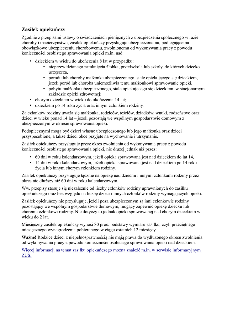 Zasiłek opiekuńczy Zgodnie z przepisami ustawy o świadczeniach pieniężnych z ubezpieczenia społecznego w razie choroby i macierzyństwa, zasiłek opiekuńczy przysługuje ubezpieczonemu, podlegającemu obowiązkowo ubezpieczeniu chorobowemu, zwolnionemu od wykonywania pracy z powodu konieczności osobistego sprawowania opieki m.in. nad: • dzieckiem w wieku do ukończenia 8 lat w przypadku: • nieprzewidzianego zamknięcia żłobka, przedszkola lub szkoły, do których dziecko uczęszcza, • porodu lub choroby małżonka ubezpieczonego, stale opiekującego się dzieckiem, jeżeli poród lub choroba uniemożliwia temu małżonkowi sprawowanie opieki, • pobytu małżonka ubezpieczonego, stale opiekującego się dzieckiem, w stacjonarnym zakładzie opieki zdrowotnej; • chorym dzieckiem w wieku do ukończenia 14 lat; • dzieckiem po 14 roku życia oraz innym członkiem rodziny. Za członków rodziny uważa się małżonka, rodziców, teściów, dziadków, wnuki, rodzeństwo oraz dzieci w wieku ponad 14 lat – jeżeli pozostają we wspólnym gospodarstwie domowym z ubezpieczonym w okresie sprawowania opieki. Podopiecznymi mogą być dzieci własne ubezpieczonego lub jego małżonka oraz dzieci przysposobione, a także dzieci obce przyjęte na wychowanie i utrzymanie. Zasiłek opiekuńczy przysługuje przez okres zwolnienia od wykonywania pracy z powodu konieczności osobistego sprawowania opieki, nie dłużej jednak niż przez: • 60 dni w roku kalendarzowym, jeżeli opieka sprawowana jest nad dzieckiem do lat 14, • 14 dni w roku kalendarzowym, jeżeli opieka sprawowana jest nad dzieckiem po 14 roku życia lub innym chorym członkiem rodziny. Zasiłek opiekuńczy przysługuje łącznie na opiekę nad dziećmi i innymi członkami rodziny przez okres nie dłuższy niż 60 dni w roku kalendarzowym. Ww. przepisy stosuje się niezależnie od liczby członków rodziny uprawnionych do zasiłku opiekuńczego oraz bez względu na liczbę dzieci i innych członków rodziny wymagających opieki. Zasiłek opiekuńczy nie przysługuje, jeżeli poza ubezpieczonym są inni członkowie rodziny pozostający we wspólnym gospodarstwie domowym, mogący zapewnić opiekę dziecku lub choremu członkowi rodziny. Nie dotyczy to jednak opieki sprawowanej nad chorym dzieckiem w wieku do 2 lat. Miesięczny zasiłek opiekuńczy wynosi 80 proc. podstawy wymiaru zasiłku, czyli przeciętnego miesięcznego wynagrodzenia pobieranego w ciągu ostatnich 12 miesięcy. Ważne! Rodzice dzieci z niepełnosprawnością nie mają prawa do wydłużonego okresu zwolnienia od wykonywania pracy z powodu konieczności osobistego sprawowania opieki nad dzieckiem. Więcej informacji na temat zasiłku opiekuńczego można znaleźć m.in. w serwisie informacyjnym ZUS.