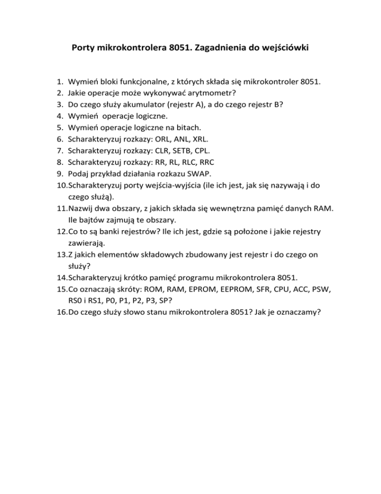 Porty mikrokontrolera 8051. Zagadnienia do wejściówki