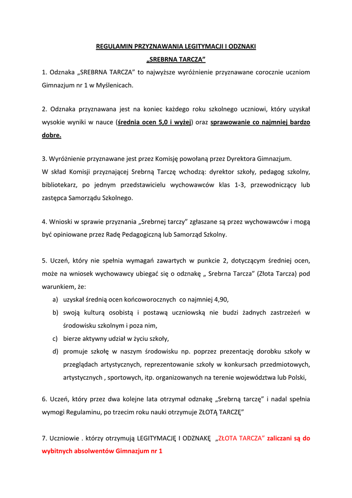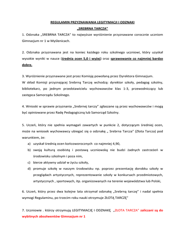 REGULAMIN PRZYZNAWANIA LEGITYMACJI I ODZNAKI „SREBRNA TARCZA” 1. Odznaka „SREBRNA TARCZA” to najwyższe wyróżnienie przyznawane corocznie uczniom Gimnazjum nr 1 w Myślenicach. 2. Odznaka przyznawana jest na koniec każdego roku szkolnego uczniowi, który uzyskał wysokie wyniki w nauce (średnia ocen 5,0 i wyżej) oraz sprawowanie co najmniej bardzo dobre. 3. Wyróżnienie przyznawane jest przez Komisję powołaną przez Dyrektora Gimnazjum. W skład Komisji przyznającej Srebrną Tarczę wchodzą: dyrektor szkoły, pedagog szkolny, bibliotekarz, po jednym przedstawicielu wychowawców klas 1-3, przewodniczący lub zastępca Samorządu Szkolnego. 4. Wnioski w sprawie przyznania „Srebrnej tarczy” zgłaszane są przez wychowawców i mogą być opiniowane przez Radę Pedagogiczną lub Samorząd Szkolny. 5. Uczeń, który nie spełnia wymagań zawartych w punkcie 2, dotyczącym średniej ocen, może na wniosek wychowawcy ubiegać się o odznakę „ Srebrna Tarcza” (Złota Tarcza) pod warunkiem, że: a) uzyskał średnią ocen końcoworocznych co najmniej 4,90, b) swoją kulturą osobistą i postawą uczniowską nie budzi żadnych zastrzeżeń w środowisku szkolnym i poza nim, c) bierze aktywny udział w życiu szkoły, d) promuje szkołę w naszym środowisku np. poprzez prezentację dorobku szkoły w przeglądach artystycznych, reprezentowanie szkoły w konkursach przedmiotowych, artystycznych , sportowych, itp. organizowanych na terenie województwa lub Polski, 6. Uczeń, który przez dwa kolejne lata otrzymał odznakę „Srebrną tarczę” i nadal spełnia wymogi Regulaminu, po trzecim roku nauki otrzymuje ZŁOTĄ TARCZĘ” 7. Uczniowie . którzy otrzymują LEGITYMACJĘ I ODZNAKĘ „ZŁOTA TARCZA” zaliczani są do wybitnych absolwentów Gimnazjum nr 1