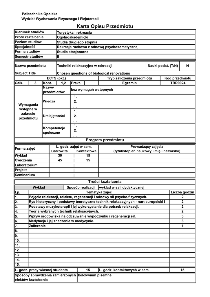 Politechnika Opolska Wydział Wychowania Fizycznego i Fizjoterapii Karta Opisu Przedmiotu Kierunek studiów Profil kształcenia Poziom studiów Specjalność Forma studiów Semestr studiów Turystyka i rekreacja Ogólnoakademicki Studia drugiego stopnia Rekracja ruchowa z odnową psychosomatyczną Studia stacjonarne II Nazwa przedmiotu Techniki relaksacyjne w rekreacji Subject Title Całk. 3 Wymagania wstępne w zakresie przedmiotu Nauki podst. (T/N) Chosen questions of biological renovations ECTS (pkt.) Tryb zaliczenia przedmiotu Kont. 1,2 Prakt. Egzamin Nazwy bez wymagań wstępnych przedmiotów 1. Wiedza 2. … 1. Umiejętności 2. … 1. Kompetencje 2. społeczne … N Kod przedmiotu TRR0024 Program przedmiotu Forma zajęć Wykład Ćwiczenia Laboratorium Projekt Seminarium L. godz. zajęć w sem. Całkowita Kontaktowa 30 15 | 45 15 | | | | Prowadzący zajęcia (tytuł/stopień naukowy, imię i nazwisko) Treści kształcenia Wykład Lp. 1. 2. 3. 4. 5. 6. 7. 8. 9. 10. 11. 12. 13. 14. 15. Sposób realizacji wykład w sali dydaktycznej Tematyka zajęć Pojęcie relaksacji, relaksu, regeneracji i odnowy sił psycho-fizycznych. Rys historyczny i podstawy teoretyczne technik relaksacyjnych - nurt europeiski i Podstawy muzykoterapii i jej wykorzystanie dla potrzeb relaksacji. Teoria wybranych technik relaksacyjnych. Wpływ środowiska na odczuwanie wypoczynku i regeneracji sił. Medytacja i jej znaczenie w medycynie. Zaliczenie L. godz. pracy własnej studenta 15 L. godz. kontaktowych w sem. Sposoby sprawdzenia zamierzonych kolokwium pisemne efektów kształcenia Liczba godzin 2 2 2 2 3 3 1 15 Ćwiczenia Lp. 1. 2. 3. 4. 5. 6. 7. 8. 9. 10. 11. 12. 13. 14. 15. Sposób realizacji ćwiczenia w sali dydaktycznej Tematyka zajęć Etapy odczuwania relaksu. Obszar oddziaływania ćwiczeń i technik relaksacyjnych. Ćwiczenia oddechowe jako forma ćwiczeń relaksacyjnych. Ćwiczenia w środowisku wodnym. Podstawy metodyki ćwiczeń relaksacyjnych. Dobór środków wspomagających ćwiczenia relaksacyjne (muzykoterapia, Podstawy teoretyczne i metodyka ćwiczeń jogi. Zaliczenie Liczba godzin 2 2 2 2 2 2 2 1 L. godz. pracy własnej studenta 30 L. godz. kontaktowych w sem. 15 Sposoby sprawdzenia zamierzonych kolokwium pisemne efektów kształcenia 1. Stosuje terminologię z zakresu odnowy biologicznej K_W03 Klasyfikuje wybrane rodzaje zabiegów fizykalnych 2. stosowanych w odnowie biologicznej K_W06 Organizuje modele odnowy biologicznej oparte na dowodach 3. naukowych K_W03 Wiedza Opisuje sposoby spędzania czasu wolnego w celach zdrowotnych. Programuje i organizuje działalność turystyczną 4. w obiektach odnowy biologicznej. Klasyfikuje podstawowe środki, metody i formy stosowane w odnowie biologicznej K_W03, K_W06, K_W08 Potrafi ukazać rolę odnowy biologicznej w kształtowaniu 1. postaw prozdrowotnych K_U06 Efekty kształcenia dla przedmiotu - po zakończonym cyklu kształcenia Umiejętności Klasyfikuje wybrane rodzaje zabiegów fizykalnych 2. stosowanych w odnowie biologicznej - K_U02 Posiada umiejętność doboru odpowiedznich metod 3. profilaktycznych w zakresie odnowy biologicznej. Zachęca do dbałości o zdrowie i dobre samopoczucie K_U02, K_U03 4. 1. Kompetencje społeczne 2. 3. … Metody dydaktyczne: wykład, prezentacja multimedialna, pokaz, pogadanka, "burza mózgów". Forma i warunki zaliczenia przedmiotu: kolokwium pisemne, aktywny udzuał w zajęciach. Literatura podstawowa: [1] Gieremek K., Dec L., Zmęczenie i regeneracja sił: odnowa biologiczna. Has-Med, Katowice 2000. Krzystyniak K. L., Kalota A., Odnowa biologiczna w sporcie i profilaktyce zdrowotnej. Podhalańska [2] Państwowa Wyższa Szkoła Zawodowa w Nowym Targu 2009. Kasperczyk T., Fenczyn J., Podręcznik odnowy psychosomatycznej. Wydawnictwo Lekarskie PZWL, [3] Warszawa 1996. Magiera L., Relaksacyjny masaż leczniczy : aromaterapeutyczny, energetyzujący, rytmiczny, [4] synchroniczny. Bio-Styl, Kraków 2003. [5] Magiera L., Historia masażu w zarysie: Bio-Styl, Kraków 2007. Kavanagh W., Podstawy masażu : sposób na odprężenie i dobre zdrowie, tł. Anna Marcinkowska. [6] Hachette Livre Polska - Sp., Warszawa 2005. Literatura uzupełniająca: [1] Magiera L., Masaż orientalny : chiński, hawajski, japoński, tybetański. Bio-Styl, Kraków 2007. [2] Magiera L., Walaszek R., Masaż sportowy z elementami odnowy biologicznej. Biosport, Kraków 2007. Kulmatycki L., Ćwiczenia relaksacyjne : praktyczne techniki antystresowe dla dzieci i młodzieży. Promo[3] Lider, Warszawa 1995. ______________ * niewłaściwe przekreślić ………………………………………………….. ………………………………………………………. (kierownik jednostki organizacyjnej/bezpośredni przełożony: pieczęć/podpis (Dziekan Wydziału pieczęć/podpis)