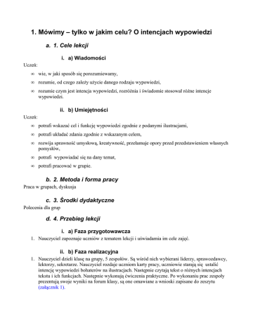 1. Mówimy – tylko w jakim celu? O intencjach wypowiedzi a. 1. Cele lekcji i. a) Wiadomości Uczeń: • wie, w jaki sposób się porozumiewamy, • rozumie, od czego zależy użycie danego rodzaju wypowiedzi, • rozumie czym jest intencja wypowiedzi, rozróżnia i świadomie stosował różne intencje wypowiedzi. ii. b) Umiejętności Uczeń: • potrafi wskazać cel i funkcję wypowiedzi zgodnie z podanymi ilustracjami, • potrafi układać zdania zgodnie z wskazanym celem, • rozwija sprawność umysłową, kreatywność, przełamuje opory przed przedstawieniem własnych pomysłów, • potrafi wypowiadać się na dany temat, • potrafi pracować w grupie. b. 2. Metoda i forma pracy Praca w grupach, dyskusja c. 3. Środki dydaktyczne Polecenia dla grup d. 4. Przebieg lekcji i. a) Faza przygotowawcza 1. Nauczyciel zapoznaje uczniów z tematem lekcji i uświadamia im cele zajęć. ii. b) Faza realizacyjna 1. Nauczyciel dzieli klasę na grupy, 5 zespołów. Są wśród nich wybierani liderzy, sprawozdawcy, lektorzy, sekretarze. Nauczyciel rozdaje uczniom karty pracy, uczniowie starają się ustalić intencję wypowiedzi bohaterów na ilustracjach. Następnie czytają tekst o różnych intencjach tekstu i ich funkcjach. Następnie wykonują ćwiczenia praktyczne. Po wykonaniu prac zespoły prezentują swoje wyniki na forum klasy, są one omawiane a wnioski zapisane do zeszytu (załącznik 1). iii. c) Faza podsumowująca Uczniowie w swobodnych wypowiedziach dyskutują nad problemem: „Jak myślicie, gdzie najczęściej można znaleźć teksty o funkcji informatycznej i impresywnej”? e. 5. Bibliografia 1. Chlebowska Zawisza T., Co to jest intencja wypowiedzi? ,w: Język ojczysty podręcznik do kształcenia językowego w klasie pierwszej gimnazjum, WSiP, Warszawa 2000. 2. Kliparty w: www.gifownik.pl f. 6. Załączniki g. a) Karta pracy ucznia załącznik 1. 1. Grzesiu, no proszę cię. Chodźmy tam razem i. Uważaj córeczko, ten kotek ma ostre pazurki! Do widzenia przyjaciele. Wkrótce wrócę! I wczoraj nie wcale nie płakała, była taka grzeczniutka… Jestem super! ii. 2. Podczas komunikowania się nadawcy tekstu z jego odbiorcą na pierwszym planie mogą znaleźć się różne elementy: - rzeczywistość, o której mówi, czyli funkcja informacyjna, polega na powiadomieniu o różnych stanach rzeczy świata zewnętrznego lub sfery psychicznej. Skupia się na samym komunikacie i jego wartości informacyjnej. -sam nadawca tekstu, czyli funkcja ekspresywna, polega na wyrażaniu poprzez wypowiedź emocji i stanów wewnętrznych osoby mówiącej. Wykorzystuje środki językowe zdradzające uczucia, emocje mówiącego, wobec tematu wypowiedzi lub odbiorcy. Aby wzmocnić wypowiedź stosuje się wiele wyrazów nacechowanych ekspresywnie. -odbiorca tekstu, czyli funkcja impresywna, polega na wpływaniu na odbiorcę, nakłonienia go do podjęcia pewnych działań, wywołaniu u niego określonych reakcji w postaci zachowań, postaw, przekonań. -kontakt pomiędzy nadawcą a odbiorcą, czyli funkcja fatyczna, polega na przyciąganiu i utrzymywaniu uwagi rozmówcy, a także na zerwaniu z nim kontaktu; tym celom służą przede wszystkim różnego typu formy inicjalne i końcowe, zwroty do adresata, powitania, pożegnania itp. 3. Na podstawie przeczytanego tekstu określicie funkcję komunikatów na podanych ilustracjach. 4. Ułóż zdania tak, aby każdorazowo wyeksponować wskazany cel -wydać polecenie:……………………………………………………………………………………..... funkcja……………………………………………………………………………………………………. -zawiadomić o czymś:…………………………………………………………………………………….. funkcja…………………………………………………………………………………………………….. -pokazać swoją radość:…………………………………………………………………………………… Funkcja…………………………………………………………………………………………………… 5. Rozpoznaj intencję wypowiedzi: Musisz koniecznie obejrzeć ten film. Nie dotykaj tego, to jest gorące! Moim zdaniem ten film jest wart obejrzenia. Jestem zachwycony tym filmem, a co za cudowna muzyka! 6. Rozpoznaj intencję nadawcy: Wiesz, ta Zośka jest strasznie głupia. Widziałam ją wczoraj tak wymalowaną. Wysztafirowała się jak nieboskie stworzenie. Chyba nie będziesz się z nią spotykać? Proszę pani, Zosia jest bardzo mądrą i odpowiedzialną osobą. Na pewno nie zrobi nic złego i zachowa się rozsądnie. Proszę jej pozwolić pójść z nami do dyskoteki. 7. Jak myślicie, gdzie najczęściej można znaleźć teksty o funkcji informatycznej i impresywnej? iii. c) Zadanie domowe Zaznaczę fragmenty opisujące sylwetkę Marcina Borowicza. h. 7. Czas trwania lekcji 45 minut i. 8. Uwagi do scenariusza brak