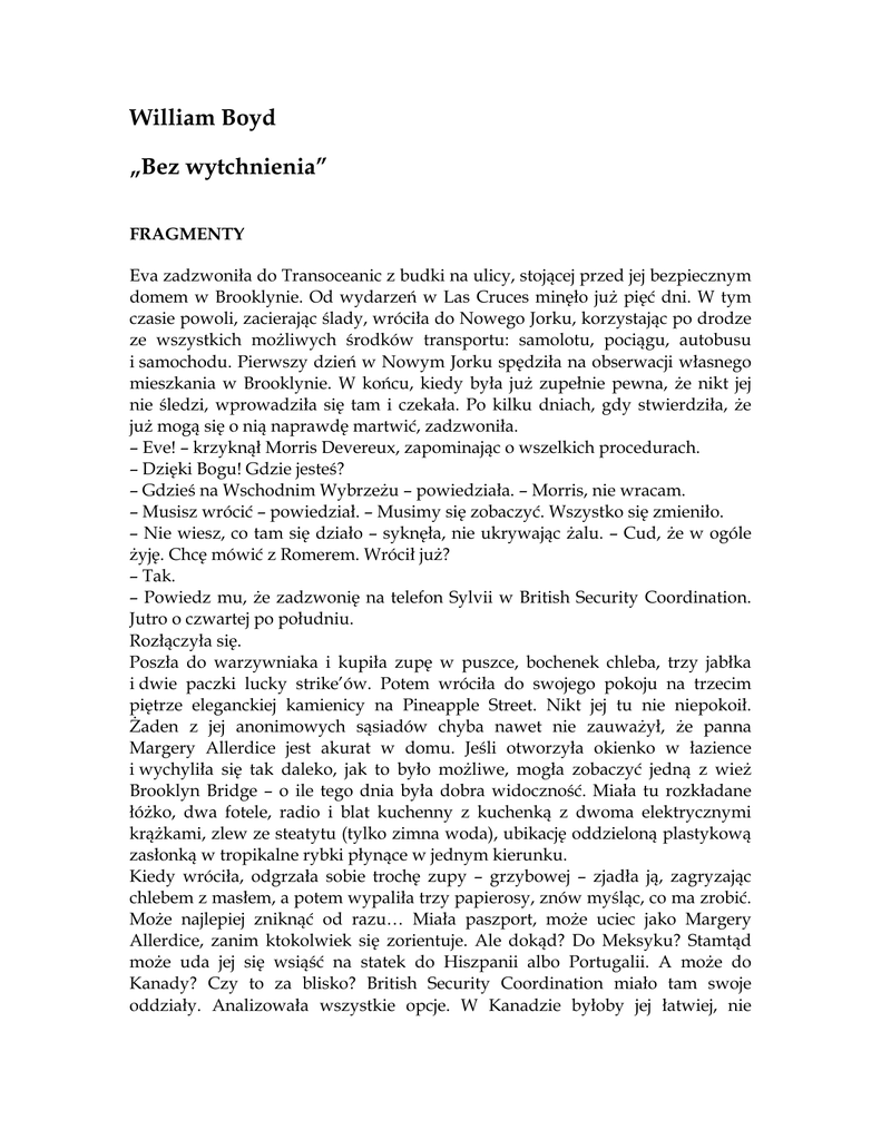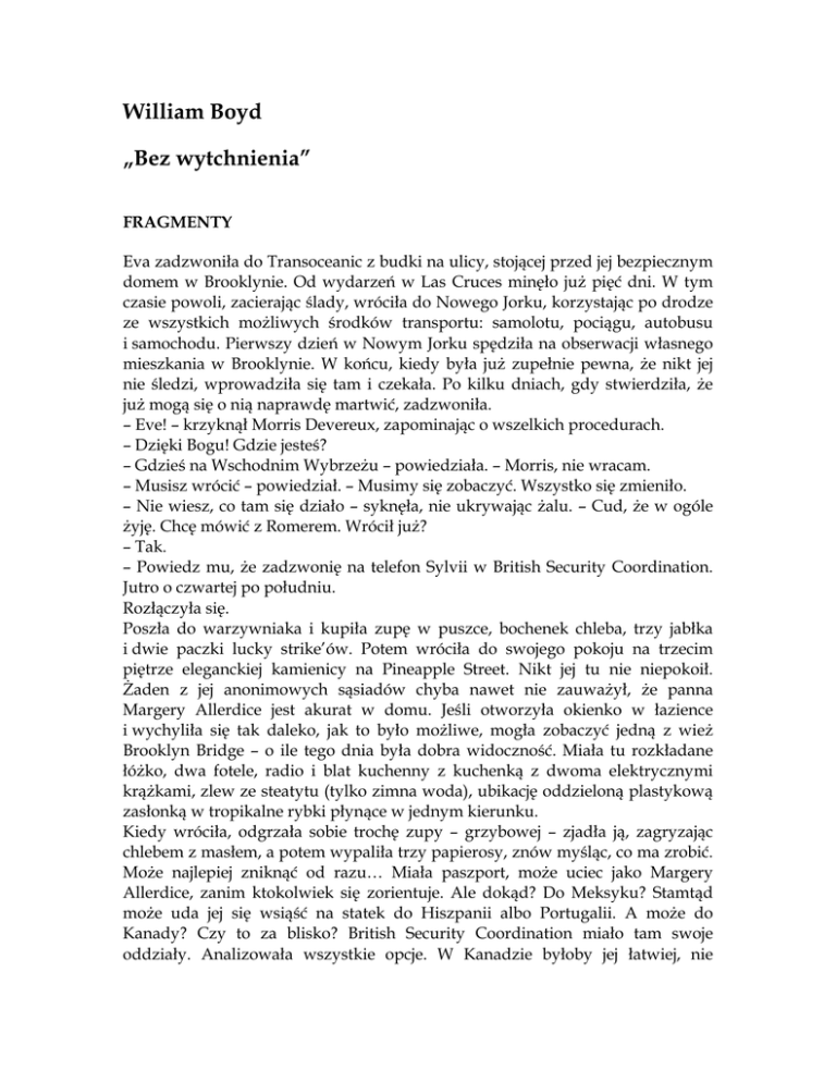 William Boyd „Bez wytchnienia” FRAGMENTY Eva zadzwoniła do Transoceanic z budki na ulicy, stojącej przed jej bezpiecznym domem w Brooklynie. Od wydarzeń w Las Cruces minęło już pięć dni. W tym czasie powoli, zacierając ślady, wróciła do Nowego Jorku, korzystając po drodze ze wszystkich możliwych środków transportu: samolotu, pociągu, autobusu i samochodu. Pierwszy dzień w Nowym Jorku spędziła na obserwacji własnego mieszkania w Brooklynie. W końcu, kiedy była już zupełnie pewna, że nikt jej nie śledzi, wprowadziła się tam i czekała. Po kilku dniach, gdy stwierdziła, że już mogą się o nią naprawdę martwić, zadzwoniła. – Eve! – krzyknął Morris Devereux, zapominając o wszelkich procedurach. – Dzięki Bogu! Gdzie jesteś? – Gdzieś na Wschodnim Wybrzeżu – powiedziała. – Morris, nie wracam. – Musisz wrócić – powiedział. – Musimy się zobaczyć. Wszystko się zmieniło. – Nie wiesz, co tam się działo – syknęła, nie ukrywając żalu. – Cud, że w ogóle żyję. Chcę mówić z Romerem. Wrócił już? – Tak. – Powiedz mu, że zadzwonię na telefon Sylvii w British Security Coordination. Jutro o czwartej po południu. Rozłączyła się. Poszła do warzywniaka i kupiła zupę w puszce, bochenek chleba, trzy jabłka i dwie paczki lucky strike’ów. Potem wróciła do swojego pokoju na trzecim piętrze eleganckiej kamienicy na Pineapple Street. Nikt jej tu nie niepokoił. Żaden z jej anonimowych sąsiadów chyba nawet nie zauważył, że panna Margery Allerdice jest akurat w domu. Jeśli otworzyła okienko w łazience i wychyliła się tak daleko, jak to było możliwe, mogła zobaczyć jedną z wież Brooklyn Bridge – o ile tego dnia była dobra widoczność. Miała tu rozkładane łóżko, dwa fotele, radio i blat kuchenny z kuchenką z dwoma elektrycznymi krążkami, zlew ze steatytu (tylko zimna woda), ubikację oddzieloną plastykową zasłonką w tropikalne rybki płynące w jednym kierunku. Kiedy wróciła, odgrzała sobie trochę zupy – grzybowej – zjadła ją, zagryzając chlebem z masłem, a potem wypaliła trzy papierosy, znów myśląc, co ma zrobić. Może najlepiej zniknąć od razu… Miała paszport, może uciec jako Margery Allerdice, zanim ktokolwiek się zorientuje. Ale dokąd? Do Meksyku? Stamtąd może uda jej się wsiąść na statek do Hiszpanii albo Portugalii. A może do Kanady? Czy to za blisko? British Security Coordination miało tam swoje oddziały. Analizowała wszystkie opcje. W Kanadzie byłoby jej łatwiej, nie wzbudzałaby takich podejrzeń; w Meksyku rzucałaby się w oczy – młoda Angielka – ale z kolei stamtąd mogłaby się dostać do Brazylii, albo nawet lepiej: do Argentyny. Tam mieszkała pokaźna angielska emigracja, mogłaby znaleźć pracę, może jako tłumaczka, wymyślić sobie jakąś przeszłość, rozpłynąć się w powietrzu, zakopać się pod ziemią. Bo tego właśnie chciała – zniknąć. Jednak wszystkie te plany i spekulacje, choć ważne, nie mogły zostać wprowadzone w życie, póki nie spotka się i nie porozmawia z Romerem – musi mu powiedzieć, co się stało. Może on zdoła jej wyjaśnić te wszystkie tajemnice. Dopiero wtedy będzie mogła podjąć decyzję. Zmierzchało, a ona słuchała muzyki z radia i jeszcze raz myślała o wydarzeniach z Las Cruces. „Wydarzenia z Las Cruces” – pocieszający eufemizm. Jakby miała problem z podwójną rezerwacją w hotelu albo zepsuł jej się samochód na autostradzie numer 80. Nie czuła wyrzutów sumienia, nie żałowała tego, co zrobiła.