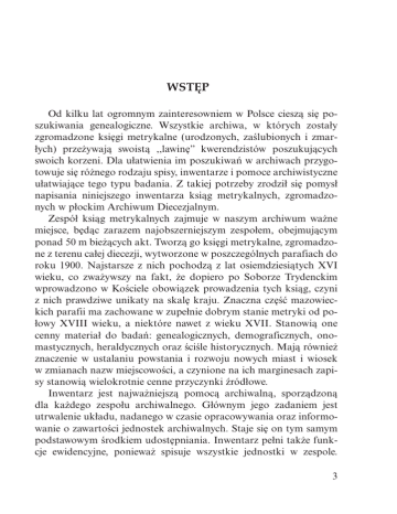 WSTĘP Od kilku lat ogromnym zainteresowniem w Polsce cieszą się poszukiwania genealogiczne. Wszystkie archiwa, w których zostały zgromadzone księgi metrykalne (urodzonych, zaślubionych i zmarłych) przeżywają swoistą ,,lawinę” kwerendzistów poszukujących swoich korzeni. Dla ułatwienia im poszukiwań w archiwach przygotowuje się różnego rodzaju spisy, inwentarze i pomoce archiwistyczne ułatwiające tego typu badania. Z takiej potrzeby zrodził się pomysł napisania niniejszego inwentarza ksiąg metrykalnych, zgromadzonych w płockim Archiwum Diecezjalnym. Zespół ksiąg metrykalnych zajmuje w naszym archiwum ważne miejsce, będąc zarazem najobszerniejszym zespołem, obejmującym ponad 50 m bieżących akt. Tworzą go księgi metrykalne, zgromadzone z terenu całej diecezji, wytworzone w poszczególnych parafiach do roku 1900. Najstarsze z nich pochodzą z lat osiemdziesiątych XVI wieku, co zważywszy na fakt, że dopiero po Soborze Trydenckim wprowadzono w Kościele obowiązek prowadzenia tych ksiąg, czyni z nich prawdziwe unikaty na skalę kraju. Znaczna część mazowieckich parafii ma zachowane w zupełnie dobrym stanie metryki od połowy XVIII wieku, a niektóre nawet z wieku XVII. Stanowią one cenny materiał do badań: genealogicznych, demograficznych, onomastycznych, heraldycznych oraz ściśle historycznych. Mają również znaczenie w ustalaniu powstania i rozwoju nowych miast i wiosek w zmianach nazw miejscowości, a czynione na ich marginesach zapisy stanowią wielokrotnie cenne przyczynki źródłowe. Inwentarz jest najważniejszą pomocą archiwalną, sporządzoną dla każdego zespołu archiwalnego. Głównym jego zadaniem jest utrwalenie układu, nadanego w czasie opracowywania oraz informowanie o zawartości jednostek archiwalnych. Staje się on tym samym podstawowym środkiem udostępniania. Inwentarz pełni także funkcje ewidencyjne, ponieważ spisuje wszystkie jednostki w zespole. 3 (Zob. H. Robutka, Wprowadzenie do archiwistyki, Toruń 2002 r., s. 75). Opracowując niniejszy inwentarz, posłużono się najprostszym systemem alfabetycznego układu parafii, z których pochodzą księgi naszego zasobu. Oprócz parafii, aktualnie tworzących diecezję Płocką, znajdziemy tam również parafie, które w wyniku podziałów administracyjnych Kościoła w Polsce, zostały włączone do innych diecezji. Spotkamy również parafie dziś już nieistniejące, z których jednak zachowały się księgi metrykalne. W takich wypadkach, umieszczono również informacje, do jakich aktualnie parafii, należą te tereny. Inwentarz otwiera lista parafii z których zachowały się księgi przedrozbiorowe z podaniem ich numerów sygnaturowych. Księgi zostały spisane według układu: Księgi urodzonych, zaślubionych i zmarłych. Podano je według dat ich wytworzenia. Luki w datacji oznaczają, że księgi z danego czasu nie znajdują się w naszym zasobie. Po spisie ksiąg podano również zachowane summariusze, czyli alfabetyczne rejestry: urodzonych, zaślubionych i zmarłych parafii za okres kilkudziesięciu lat, co stanowi wielką pomoc przy poszukiwaniach genealogicznych. Jako ostatnią informację, podano numery mikrofilmów, które zawierają treść ksiąg metrykalnych z danej parafii. Księgi metrykalne naszego Archiwum zostały w całości zmikrofilmowane, co daje również możliwość korzystania z tej formy ich przekazu. Mam nadzieję, że inwentarz ten będzie pomocą, wykorzystywaną w kancelariach parafialnych, bibliotekach i archiwach do szybkiego zorientowania się w zasobie ksiąg metrykalnych naszego Archiwum W tym miejscu pragnę gorąco podziękować Księdzu Profesorowi Tadeuszowi Żebrowskiemu wieloletniemu dyrektorowi Archiwum Diecezjalnego w Płocku, który włożył wiele wysiłku w scentralizowanie ksiąg metrykalnych w Archiwum Diecezjalnym oraz stworzenia z nich jednolitego zespołu. Słowa podziękowania kieruję także w stronę Pani Elżbiety Makowskiej, która zmikrofilmowała ten zespół a także dokonała pierwszego spisu tych ksiąg, co ułatwiło powstanie tego inwentarza. Ks. Dariusz Majewski Dyrektor Archiwum 4