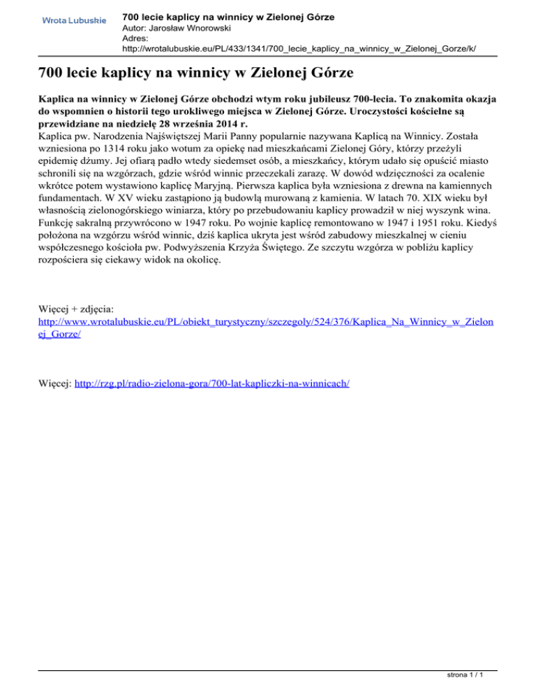 700 lecie kaplicy na winnicy w Zielonej Górze Autor: Jarosław Wnorowski Adres: http://wrotalubuskie.eu/PL/433/1341/700_lecie_kaplicy_na_winnicy_w_Zielonej_Gorze/k/ 700 lecie kaplicy na winnicy w Zielonej Górze Kaplica na winnicy w Zielonej Górze obchodzi wtym roku jubileusz 700-lecia. To znakomita okazja do wspomnien o historii tego urokliwego miejsca w Zielonej Górze. Uroczystości kościelne są przewidziane na niedzielę 28 września 2014 r. Kaplica pw. Narodzenia Najświętszej Marii Panny popularnie nazywana Kaplicą na Winnicy. Została wzniesiona po 1314 roku jako wotum za opiekę nad mieszkańcami Zielonej Góry, którzy przeżyli epidemię dżumy. Jej ofiarą padło wtedy siedemset osób, a mieszkańcy, którym udało się opuścić miasto schronili się na wzgórzach, gdzie wśród winnic przeczekali zarazę. W dowód wdzięczności za ocalenie wkrótce potem wystawiono kaplicę Maryjną. Pierwsza kaplica była wzniesiona z drewna na kamiennych fundamentach. W XV wieku zastąpiono ją budowlą murowaną z kamienia. W latach 70. XIX wieku był własnością zielonogórskiego winiarza, który po przebudowaniu kaplicy prowadził w niej wyszynk wina. Funkcję sakralną przywrócono w 1947 roku. Po wojnie kaplicę remontowano w 1947 i 1951 roku. Kiedyś położona na wzgórzu wśród winnic, dziś kaplica ukryta jest wśród zabudowy mieszkalnej w cieniu współczesnego kościoła pw. Podwyższenia Krzyża Świętego. Ze szczytu wzgórza w pobliżu kaplicy rozpościera się ciekawy widok na okolicę. Więcej + zdjęcia: http://www.wrotalubuskie.eu/PL/obiekt_turystyczny/szczegoly/524/376/Kaplica_Na_Winnicy_w_Zielon ej_Gorze/ Więcej: http://rzg.pl/radio-zielona-gora/700-lat-kapliczki-na-winnicach/ strona 1 / 1 Powered by TCPDF (www.tcpdf.org)