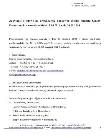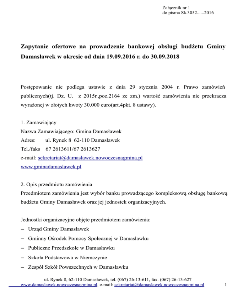 Załącznik nr 1 do pisma Sk.3052......2016 Zapytanie ofertowe na prowadzenie bankowej obsługi budżetu Gminy Damasławek w okresie od dnia 19.09.2016 r. do 30.09.2018 Postępowanie nie podlega ustawie z dnia 29 stycznia 2004 r. Prawo zamówień publicznych(tj. Dz. U. z 2015r.,poz.2164 ze zm.) wartość zamówienia nie przekracza wyrażonej w złotych kwoty 30.000 euro(art.4pkt. 8 ustawy). 1. Zamawiający Nazwa Zamawiającego: Gmina Damasławek Adres: ul. Rynek 8 62-110 Damasławek Tel./faks 67 2613611/67 2613627 e-mail: [email protected] www.gminadamaslawek.pl 2. Opis przedmiotu zamówienia Przedmiotem zamówienia jest wybór banku prowadzącego kompleksową obsługę bankową budżetu Gminy Damasławek oraz jej jednostek organizacyjnych. Jednostki organizacyjne objęte przedmiotem zamówienia: – Urząd Gminy Damasławek – Gminny Ośrodek Pomocy Społecznej w Damasławku – Publiczne Przedszkole w Damasławku – Szkoła Podstawowa w Niemczynie – Zespół Szkół Powszechnych w Damasławku ul. Rynek 8, 62-110 Damasławek, tel. (067) 26-13-611, fax. (067) 26-13-627 www.damaslawek.nowoczesnagmina.pl, e-mail: [email protected] 1 W zakres usługi wchodzi obsługa bankowa polegająca na: 1. otwarcie i prowadzenie w rozumieniu ustawy z dnia 29 sierpnia 1997 r. Prawo bankowe(tj.Dz.U.z 2012 r. poz.1376 z późn. zm):rachunków bieżących,rachunków lokat terminowych,rachunków środków pomocowych i innych rachunków pozabudżetowych (rachunków funduszy celowych i specjalnych) w tym rachunkówzwiązanych z rozliczeniem środków otrzymanych z funduszy Unii Europejskiej, 2. obsługa operacji finansowych budżetu Gminy na poziomie Urzędu Gminy i jednostek organizacyjnych z zastosowaniem jednolitych procedur, 3. przyjmowanie wpłat gotówkowych, 4. dokonywanie wpłat gotówkowych, 5. generowanie i dostarczanie codziennie wyciągów bankowych wraz z dokumentami źródłowymi oraz potwierdzeniem sald, 6. wydawanie blankietów czeków gotówkowych (książeczki czekowej), 7. możliwość otwarcia dodatkowych rachunków bieżących i pomocniczych w trakcie obowiązywania umowy w zależności od potrzeb, 8. potwierdzenie otwarcia i zamknięcia rachunków bankowych, 9. realizację zleceń płatniczych -przelewów na rachunki prowadzone w innych bankach oraz banku prowadzącym obsługę rachunku przekazywanych w formie elektronicznej oraz papierowej. Zlecenia płatnicze złożone do godziny 14-tej realizowanie powinny być w tym samym dniu. Przelewy złożone po tej godzinie zostaną przekazane do realizacji najpóźniej w następnym dniu roboczym, 10. dokonywanie zestawienia operacji na rachunkach na zakończenie dnia i udostępnienie tego zestawienia w formie wyciągu bankowego w dniu następnym do godz.11-tej, 11. możliwość deponowania środków na lokatach terminowych lub produktach depozytowych, 12. zerwanie rachunków bieżących i pomocniczych jednostek budżetowych Gminy, zgodnie z dyspozycjami, polegające na przekazaniu z dniem 31 grudnia kwot pozostałych na w/w rachunkach na rachunek bieżący Gminy, 13. przeksięgowanie w dniu 31 grudnia skapitalizowanych odsetek bankowych z określonych rachunków bankowych jednostek budżetowych Gminy na dzień 31 grudnia na rachunek bieżący Gminy, 14. możliwości zaciągania kredytów krótkoterminowych w rachunku bieżącym Gminy Damasławek na pokrycie niedoboru budżetu do wysokości określonej upoważnieniem w Uchwale budżetowej Gminy Damasławek, 15. udzielenie poręczeń i gwarancji bankowych, 16. wydawanie oświadczeń, zaświadczeń i opinii na żądanie Zamawiającego, ul. Rynek 8, 62-110 Damasławek, tel. (067) 26-13-611, fax. (067) 26-13-627 www.damaslawek.nowoczesnagmina.pl, e-mail: [email protected] 2 17. inne usługi bankowe np. zmiana karty wzorów podpisów, wydawanie duplikatów zrealizowanych transakcji, przyjęcie i przechowywanie depozytów itp.. W trakcie realizacji zamówienia liczba rachunków, innych czynności bankowych, usług i produktów będzie zależała od określonych potrzeb Zamawiającego. Wykonawca zapewni spełnienie wymagań Zamawiającego, który żąda , aby: 1.Zamawiający zastrzega sobie prawo lokowania środków w innych bankach. 2.Zamawiający zastrzega sobie prawo do negocjacji oprocentowania lokat terminowych. 3.Zamawiający wymaga, aby Wykonawca zawarł umowy na obsługę bankową z Gminą Damasławek i oddzielnie z każdą jednostką organizacyjną. W przypadku łączenia, przekształcenia jednostek organizacyjnych Zamawiającego lub powołania nowych jednostek organizacyjnych Zamawiającego, Wykonawca zobowiązany jest do realizacji przedmiotowej usługi na warunkach zdeklarowanych w ofercie. Nazwa i kody określone we wspólnym Słowniku Zamówień (CPV) 66 11 00 00-4-usługi bankowe. Dane dotyczące Zamawiającego znajdują się na stronie:www.gminadamaslawek.pl 3.Terminy wykonania zamówienia: Wymagany termin wykonania umowy od dnia 19 wrzesień 2016r. do 30 września 2018r. 4.Warunki udziału w postępowaniu oraz opis sposobu dokonywania oceny spełnienia tych warunków. O udzielenie zamówienia mogą ubiegać się Wykonawcy potwierdzający spełnienie warunków: 1.posiadający uprawnienia do wykonywania określonej działalności lub czynności, jeżeli ustawy nakładają obowiązek posiadania takich uprawnień 2.posiadają siedzibę oddziału, placówki, filii lub punkt kasowy na terenie Gminy Damasławek lub którzy utworzą filie lub punkt kasowy na jej terenie. ul. Rynek 8, 62-110 Damasławek, tel. (067) 26-13-611, fax. (067) 26-13-627 www.damaslawek.nowoczesnagmina.pl, e-mail: [email protected] 3 5.Wykaz oświadczeń i dokumentów, jakie mają dostarczyć wykonawcy w celu potwierdzenia spełnienia warunków udziału w postępowaniu. Na ofertę składają się następujące dokumenty i załączniki: 1.formularz ofertowy -wypełniony i podpisany przez wykonawcę(załącznik nr 1) 2.aktualny odpis z właściwego rejestru lub centralnej ewidencji o działalności gospodarczej,jeżeli