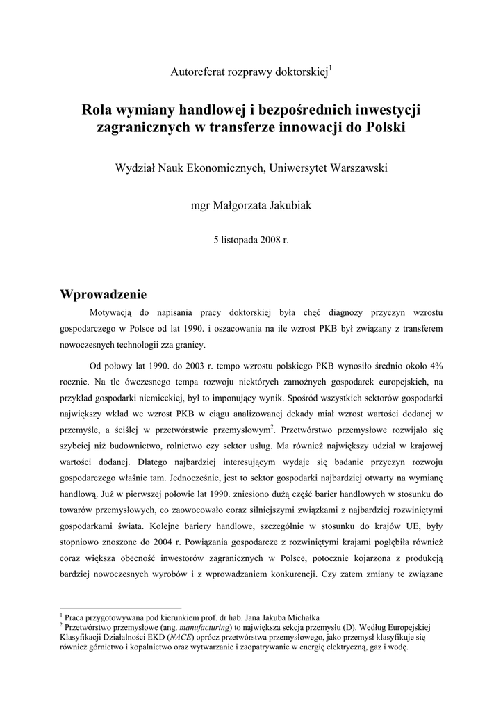 Autoreferat rozprawy doktorskiej1 Rola wymiany handlowej i bezpośrednich inwestycji zagranicznych w transferze innowacji do Polski Wydział Nauk Ekonomicznych, Uniwersytet Warszawski mgr Małgorzata Jakubiak 5 listopada 2008 r. Wprowadzenie Motywacją do napisania pracy doktorskiej była chęć diagnozy przyczyn wzrostu gospodarczego w Polsce od lat 1990. i oszacowania na ile wzrost PKB był związany z transferem nowoczesnych technologii zza granicy. Od połowy lat 1990. do 2003 r. tempo wzrostu polskiego PKB wynosiło średnio około 4% rocznie. Na tle ówczesnego tempa rozwoju niektórych zamożnych gospodarek europejskich, na przykład gospodarki niemieckiej, był to imponujący wynik. Spośród wszystkich sektorów gospodarki największy wkład we wzrost PKB w ciągu analizowanej dekady miał wzrost wartości dodanej w przemyśle, a ściślej w przetwórstwie przemysłowym2. Przetwórstwo przemysłowe rozwijało się szybciej niż budownictwo, rolnictwo czy sektor usług. Ma również największy udział w krajowej wartości dodanej. Dlatego najbardziej interesującym wydaje się badanie przyczyn rozwoju gospodarczego właśnie tam. Jednocześnie, jest to sektor gospodarki najbardziej otwarty na wymianę handlową. Już w pierwszej połowie lat 1990. zniesiono dużą część barier handlowych w stosunku do towarów przemysłowych, co zaowocowało coraz silniejszymi związkami z najbardziej rozwiniętymi gospodarkami świata. Kolejne bariery handlowe, szczególnie w stosunku do krajów UE, były stopniowo znoszone do 2004 r. Powiązania gospodarcze z rozwiniętymi krajami pogłębiła również coraz większa obecność inwestorów zagranicznych w Polsce, potocznie kojarzona z produkcją bardziej nowoczesnych wyrobów i z wprowadzaniem konkurencji. Czy zatem zmiany te związane 1 Praca przygotowywana pod kierunkiem prof. dr hab. Jana Jakuba Michałka Przetwórstwo przemysłowe (ang. manufacturing) to największa sekcja przemysłu (D). Według Europejskiej Klasyfikacji Działalności EKD (NACE) oprócz przetwórstwa przemysłowego, jako przemysł klasyfikuje się również górnictwo i kopalnictwo oraz wytwarzanie i zaopatrywanie w energię elektryczną, gaz i wodę. 2 Rola wymiany handlowej i BIZ w transferze innowacji do Polski Małgorzata Jakubiak były z technologicznymi efektami zewnętrznymi, mającymi wpływ na poprawę produktywności przedsiębiorstw? Hipotezy badawcze Autorka ma nadzieję, iż referowana praca dostarcza odpowiedzi na dwa podstawowe pytania: 1. czy mamy do czynienia z napływem innowacji do Polski, przede wszystkim w postaci importu technologicznie zaawansowanych dóbr pośrednich, używanych w produkcji dóbr finalnych oraz poprzez efekty zewnętrzne związane z pro-innowacyjną działalnością inwestorów zagranicznych oraz 2. czy technologiczne efekty zewnętrzne związane z transferem innowacji zza granicy zwiększają produktywność krajowego przemysłu. Modele wzrostu opartego na innowacjach Użytecznych ram do analizy dostarcza neoklasyczna teoria endogenicznego wzrostu. Zgodnie z nią, rozwój gospodarczy zależy w długim okresie od wielkości zatrudnienia, inwestycji, a także od wzrostu produktywności. Na tę ostatnią mogą mieć wpływ takie czynniki jak wyższe kwalifikacje pracowników czy postęp technologiczny. Z kolei sam postęp technologiczny może dokonywać się szybciej na skutek otwierania się gospodarki. Prosty model Solowa (1956) nie dostarcza odpowiedzi na pytanie o źródła długookresowego wzrostu gospodarczego. Jednakże od czasu Solowa powstała cała grupa modeli, gdzie zmiana technologiczna determinowana jest wewnętrznie. Jest ona skutkiem akumulacji kapitału ludzkiego (Lucas 1988, Aghion i Howitt 1992) bądź inwestycji w wiedzę (Romer 1986, 1990). Inwestycje w wiedzę lub kapitał ludzki stają się opłacalne dzięki wprowadzeniu do modeli założenia o wyższej użyteczności z powodu większej różnorodności dóbr (Romer 1986, 1990), ewentualnie osiągnięcia monopolistycznych zysków po wprowadzeniu na rynek dobra o wyższej jakości (Aghion i Howitt 1992). W rezultacie otrzymywany jest wynik, iż gospodarka rozwija się szybciej kiedy zwiększa się skłonność do oszczędzania, kiedy ogólny poziom technologii rośnie oraz przy niższych kosztach działalności badawczo-rozwojowej. Jednym z wyników tej grupy modeli jest również szybszy rozwój krajów o większej liczbie ludności. Z punktu widzenia referowanej pracy szczególnie interesujący jest wynik o szybszym wzroście gospodarczym w warunkach szerszej dostępności nowych technologii oraz przy niższych kosztach działalności B+R. Natomiast rezultat mówiący o szybszym rozwoju dużych gospodarek jest jednocześnie argumentem na rzecz otwierania się krajów relatywnie małych. Integracja z krajami przodującymi obniża bowiem koszt nowych rozwiązań technicznych. 2 Rola wymiany handlowej i BIZ w transferze innowacji do Polski Małgorzata Jakubiak Można pokazać, iż na skutek wymiany handlowej i dyfuzji innowacji zamknięte dotychczas gospodarki będą rozwijać się szybciej. W szczególności, można uzasadnić w jaki sposób wymiana towarów z zagranicą wspiera wzrost kraju relatywnie biedniejszego (Barro i Sala-i-Marin 1995, Grossman i Helpman 1991). Dzieje się to w dużym stopniu na skutek imitacji bądź adaptacji nowych rozwiązań technologicznych dokonanych w krajach przodujących. Poprzez wymianę handlową kraje biedne uzyskują dostęp do tych rozwiązań, zawartych w produktach końcowych. Następnie, gromadząc wiedzę technologiczną, mogą je imitować, a nawet – po pewnym okresie – zacząć wprowadzać innowacje. Za każdym razem wprowadzanie innowacji jest w tego rodzaju modelach związane z osiąganiem przez pewien czas monopolistycznych zysków. Neoklasyczne modele wzrostu dostarczają również teoretycznego wyjaśnienia konwergencji w krajach biedniejszych, wspieranej przez inwestycje zagraniczne z krajów bogatszy