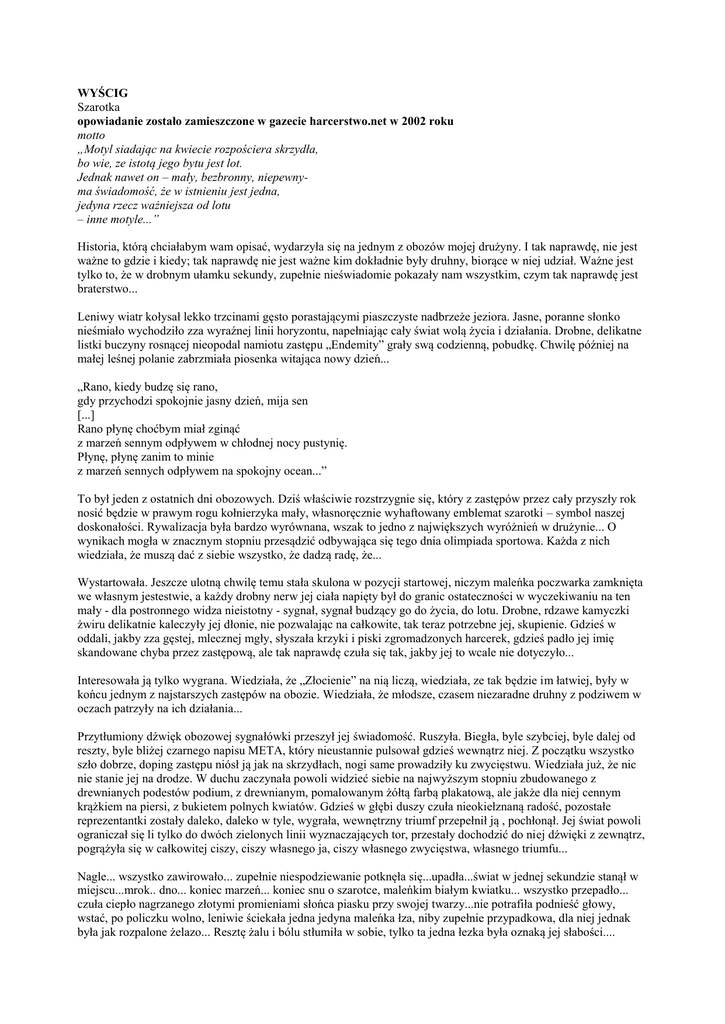 WYŚCIG Szarotka opowiadanie zostało zamieszczone w gazecie harcerstwo.net w 2002 roku motto „Motyl siadając na kwiecie rozpościera skrzydła, bo wie, ze istotą jego bytu jest lot. Jednak nawet on – mały, bezbronny, niepewnyma świadomość, że w istnieniu jest jedna, jedyna rzecz ważniejsza od lotu – inne motyle...” Historia, którą chciałabym wam opisać, wydarzyła się na jednym z obozów mojej drużyny. I tak naprawdę, nie jest ważne to gdzie i kiedy; tak naprawdę nie jest ważne kim dokładnie były druhny, biorące w niej udział. Ważne jest tylko to, że w drobnym ułamku sekundy, zupełnie nieświadomie pokazały nam wszystkim, czym tak naprawdę jest braterstwo... Leniwy wiatr kołysał lekko trzcinami gęsto porastającymi piaszczyste nadbrzeże jeziora. Jasne, poranne słonko nieśmiało wychodziło zza wyraźnej linii horyzontu, napełniając cały świat wolą życia i działania. Drobne, delikatne listki buczyny rosnącej nieopodal namiotu zastępu „Endemity” grały swą codzienną, pobudkę. Chwilę później na małej leśnej polanie zabrzmiała piosenka witająca nowy dzień... „Rano, kiedy budzę się rano, gdy przychodzi spokojnie jasny dzień, mija sen [...] Rano płynę choćbym miał zginąć z marzeń sennym odpływem w chłodnej nocy pustynię. Płynę, płynę zanim to minie z marzeń sennych odpływem na spokojny ocean...” To był jeden z ostatnich dni obozowych. Dziś właściwie rozstrzygnie się, który z zastępów przez cały przyszły rok nosić będzie w prawym rogu kołnierzyka mały, własnoręcznie wyhaftowany emblemat szarotki – symbol naszej doskonałości. Rywalizacja była bardzo wyrównana, wszak to jedno z największych wyróżnień w drużynie... O wynikach mogła w znacznym stopniu przesądzić odbywająca się tego dnia olimpiada sportowa. Każda z nich wiedziała, że muszą dać z siebie wszystko, że dadzą radę, że... Wystartowała. Jeszcze ulotną chwilę temu stała skulona w pozycji startowej, niczym maleńka poczwarka zamknięta we własnym jestestwie, a każdy drobny nerw jej ciała napięty był do granic ostateczności w wyczekiwaniu na ten mały - dla postronnego widza nieistotny - sygnał, sygnał budzący go do życia, do lotu. Drobne, rdzawe kamyczki żwiru delikatnie kaleczyły jej dłonie, nie pozwalając na całkowite, tak teraz potrzebne jej, skupienie. Gdzieś w oddali, jakby zza gęstej, mlecznej mgły, słyszała krzyki i piski zgromadzonych harcerek, gdzieś padło jej imię skandowane chyba przez zastępową, ale tak naprawdę czuła się tak, jakby jej to wcale nie dotyczyło... Interesowała ją tylko wygrana. Wiedziała, że „Złocienie” na nią liczą, wiedziała, ze tak będzie im łatwiej, były w końcu jednym z najstarszych zastępów na obozie. Wiedziała, że młodsze, czasem niezaradne druhny z podziwem w oczach patrzyły na ich działania... Przytłumiony dźwięk obozowej sygnałówki przeszył jej świadomość. Ruszyła. Biegła, byle szybciej, byle dalej od reszty, byle bliżej czarnego napisu META, który nieustannie pulsował gdzieś wewnątrz niej. Z początku wszystko szło dobrze, doping zastępu niósł ją jak na skrzydłach, nogi same prowadziły ku zwycięstwu. Wiedziała już, że nic nie stanie jej na drodze. W duchu zaczynała powoli widzieć siebie na najwyższym stopniu zbudowanego z drewnianych podestów podium, z drewnianym, pomalowanym żółtą farbą plakatową, ale jakże dla niej cennym krążkiem na piersi, z bukietem polnych kwiatów. Gdzieś w głębi duszy czuła nieokiełznaną radość, pozostałe reprezentantki zostały daleko, daleko w tyle, wygrała, wewnętrzny triumf przepełnił ją , pochłonął. Jej świat powoli ograniczał się li tylko do dwóch zielonych linii wyznaczających tor, przestały dochodzić do niej dźwięki z zewnątrz, pogrążyła się w całkowitej ciszy, ciszy własnego ja, ciszy własnego zwycięstwa, własnego triumfu... Nagle... wszystko zawirowało... zupełnie niespodziewanie potknęła się...upadła...świat w jednej sekundzie stanął w miejscu...mrok.. dno... koniec marzeń... koniec snu o szarotce, maleńkim białym kwiatku... wszystko przepadło... czuła ciepło nagrzanego złotymi promieniami słońca piasku przy swojej twarzy...nie potrafiła podnieść głowy, wstać, po policzku wolno, leniwie ściekała jedna jedyna maleńka łza, niby zupełnie przypadkowa, dla niej jednak była jak rozpalone żelazo... Resztę żalu i bólu stłumiła w sobie, tylko ta jedna łezka była oznaką jej słabości.... Reszta dziewcząt z pozoru nie zwróciła uwagi na jej upadek. Ich celem również była wygrana. Klęska rywalki zwiększała ich szansę, szansę na laury, medal, kwiaty i wiwaty tłumu, szansę na poczucie się choć przez chwilę kimś ważnym, jedynym, wybranym, szansę na bycie zwycięzcą, szansę na szarotkę... I wtedy stało się coś, co sprawiło, ze rozentuzjazmowany, rozszalały, wiwatujący tłum harcerek w jednej chwili zamilkł. Sylwia, zupełnie niepozorna, nie rzucająca się w oczy proporcowa „Siklawy”, przystanęła przy leżącej na bieżni koleżance. Przerwała bieg, uklękła i podała dłoń. Wiedziała, że to oznacza przegraną w tak ważnym biegu, ale mimo wszystko nie zastanawiając się ani chwili wyciągnęła małą, mizerną, lekko drżącą rękę. Rękę, która tak naprawdę tonęła w dużej, silnej dłoni leżącej, ale która z całym dostojeństwem niosła to, co w tym momencie było jej tak bardzo potrzebne: czyste, proste braterstwo... Jesteśmy harcerkami. Nie w piątek na zbiórce, nie na biwaku, nie na obozie, nie wtedy, gdy zakładamy mundur. Jesteśmy harcerkami tu i teraz; jesteśmy harcerkami wszędzie tam, gdzie jesteśmy; jesteśmy harcerkami każdego dnia, w każdej godzinie. Mamy Prawo, które mówi nam jak żyć. Większość z nas gdzieś w środku sosnowego czy bukowego boru wymówiła kiedyś rotę Przyrzeczenia. Pamiętasz ten moment? Pa