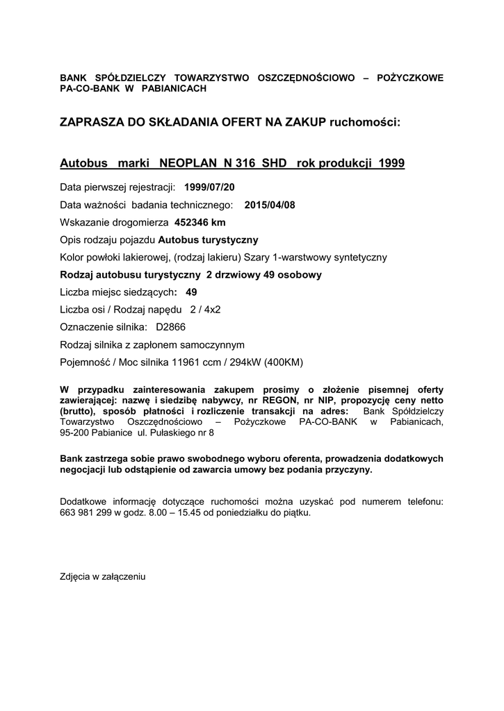 BANK SPÓŁDZIELCZY TOWARZYSTWO OSZCZĘDNOŚCIOWO – POŻYCZKOWE PA-CO-BANK W PABIANICACH ZAPRASZA DO SKŁADANIA OFERT NA ZAKUP ruchomości: Autobus marki NEOPLAN N 316 SHD rok produkcji 1999 Data pierwszej rejestracji: 1999/07/20 Data ważności badania technicznego: 2015/04/08 Wskazanie drogomierza 452346 km Opis rodzaju pojazdu Autobus turystyczny Kolor powłoki lakierowej, (rodzaj lakieru) Szary 1-warstwowy syntetyczny Rodzaj autobusu turystyczny 2 drzwiowy 49 osobowy Liczba miejsc siedzących: 49 Liczba osi / Rodzaj napędu 2 / 4x2 Oznaczenie silnika: D2866 Rodzaj silnika z zapłonem samoczynnym Pojemność / Moc silnika 11961 ccm / 294kW (400KM) W przypadku zainteresowania zakupem prosimy o złożenie pisemnej oferty zawierającej: nazwę i siedzibę nabywcy, nr REGON, nr NIP, propozycję ceny netto (brutto), sposób płatności i rozliczenie transakcji na adres: Bank Spółdzielczy Towarzystwo Oszczędnościowo – Pożyczkowe PA-CO-BANK w Pabianicach, 95-200 Pabianice ul. Pułaskiego nr 8 Bank zastrzega sobie prawo swobodnego wyboru oferenta, prowadzenia dodatkowych negocjacji lub odstąpienie od zawarcia umowy bez podania przyczyny. Dodatkowe informację dotyczące ruchomości można uzyskać pod numerem telefonu: 663 981 299 w godz. 8.00 – 15.45 od poniedziałku do piątku. Zdjęcia w załączeniu