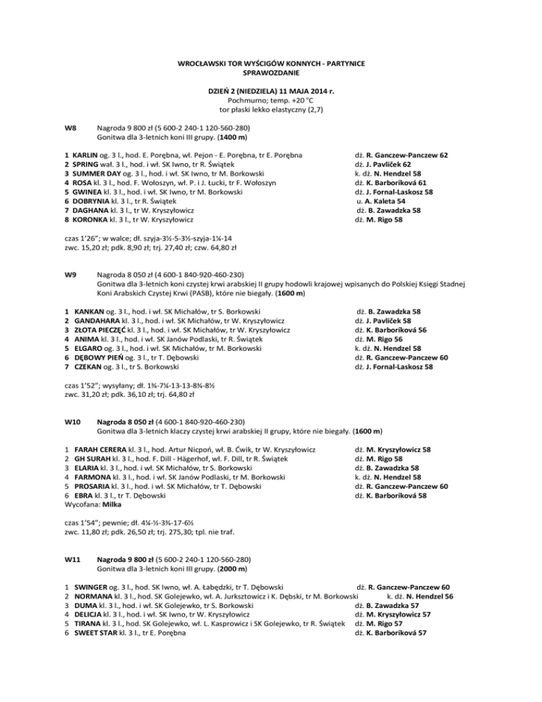 WROCŁAWSKI TOR WYŚCIGÓW KONNYCH - PARTYNICE SPRAWOZDANIE DZIEŃ 2 (NIEDZIELA) 11 MAJA 2014 r. Pochmurno; temp. +20 oC tor płaski lekko elastyczny (2,7) W8 1 2 3 4 5 6 7 8 Nagroda 9 800 zł (5 600-2 240-1 120-560-280) Gonitwa dla 3-letnich koni III grupy. (1400 m) KARLIN og. 3 l., hod. E. Porębna, wł. Pejon - E. Porębna, tr E. Porębna SPRING wał. 3 l., hod. i wł. SK Iwno, tr R. Świątek SUMMER DAY og. 3 l., hod. i wł. SK Iwno, tr M. Borkowski ROSA kl. 3 l., hod. F. Wołoszyn, wł. P. i J. Łucki, tr F. Wołoszyn GWINEA kl. 3 l., hod. i wł. SK Iwno, tr M. Borkowski DOBRYNIA kl. 3 l., tr R. Świątek DAGHANA kl. 3 l., tr W. Kryszyłowicz KORONKA kl. 3 l., tr W. Kryszyłowicz dż. R. Ganczew-Panczew 62 dż. J. Pavliček 62 k. dż. N. Hendzel 58 dż. K. Barboríková 61 dż. J. Fornal-Laskosz 58 u. A. Kaleta 54 dż. B. Zawadzka 58 dż. M. Rigo 58 czas 1’26”; w walce; dł. szyja-3½-5-3½-szyja-1¼-14 zwc. 15,20 zł; pdk. 8,90 zł; trj. 27,40 zł; czw. 64,80 zł W9 1 2 3 4 5 6 7 Nagroda 8 050 zł (4 600-1 840-920-460-230) Gonitwa dla 3-letnich koni czystej krwi arabskiej II grupy hodowli krajowej wpisanych do Polskiej Księgi Stadnej Koni Arabskich Czystej Krwi (PASB), które nie biegały. (1600 m) KANKAN og. 3 l., hod. i wł. SK Michałów, tr S. Borkowski GANDAHARA kl. 3 l., hod. i wł. SK Michałów, tr W. Kryszyłowicz ZŁOTA PIECZĘĆ kl. 3 l., hod. i wł. SK Michałów, tr W. Kryszyłowicz ANIMA kl. 3 l., hod. i wł. SK Janów Podlaski, tr R. Świątek ELGARO og. 3 l., hod. i wł. SK Michałów, tr M. Borkowski DĘBOWY PIEŃ og. 3 l., tr T. Dębowski CZEKAN og. 3 l., tr S. Borkowski dż. B. Zawadzka 58 dż. J. Pavliček 58 dż. K. Barboríková 56 dż. M. Rigo 56 k. dż. N. Hendzel 58 dż. R. Ganczew-Panczew 60 dż. J. Fornal-Laskosz 58 czas 1’52”; wysyłany; dł. 1¾-7¼-13-13-8¾-8½ zwc. 31,20 zł; pdk. 36,10 zł; trj. 64,80 zł W10 Nagroda 8 050 zł (4 600-1 840-920-460-230) Gonitwa dla 3-letnich klaczy czystej krwi arabskiej II grupy, które nie biegały. (1600 m) 1 FARAH CERERA kl. 3 l., hod. Artur Nicpoń, wł. B. Ćwik, tr W. Kryszyłowicz 2 GH SURAH kl. 3 l., hod. F. Dill - Hägerhof, wł. F. Dill, tr R. Świątek 3 ELARIA kl. 3 l., hod. i wł. SK Michałów, tr S. Borkowski 4 FARMONA kl. 3 l., hod. i wł. SK Janów Podlaski, tr M. Borkowski 5 PROSARIA kl. 3 l., hod. i wł. SK Michałów, tr T. Dębowski 6 EBRA kl. 3 l., tr T. Dębowski Wycofana: Milka dż. M. Kryszyłowicz 58 dż. M. Rigo 58 dż. B. Zawadzka 58 k. dż. N. Hendzel 58 dż. R. Ganczew-Panczew 60 dż. K. Barboríková 58 czas 1’54”; pewnie; dł. 4¼-½-3¾-17-6½ zwc. 11,80 zł; pdk. 26,50 zł; trj. 275,30; tpl. nie traf. W11 1 2 3 4 5 6 Nagroda 9 800 zł (5 600-2 240-1 120-560-280) Gonitwa dla 3-letnich koni III grupy. (2000 m) SWINGER og. 3 l., hod. SK Iwno, wł. A. Łabędzki, tr T. Dębowski dż. R. Ganczew-Panczew 60 NORMANA kl. 3 l., hod. SK Golejewko, wł. A. Jurksztowicz i K. Dębski, tr M. Borkowski k. dż. N. Hendzel 56 DUMA kl. 3 l., hod. i wł. SK Golejewko, tr S. Borkowski dż. B. Zawadzka 57 DELICJA kl. 3 l., hod. i wł. SK Iwno, tr W. Kryszyłowicz dż. M. Kryszyłowicz 57 TIRANA kl. 3 l., hod. SK Golejewko, wł. L. Kasprowicz i SK Golejewko, tr R. Świątek dż. M. Rigo 57 SWEET STAR kl. 3 l., tr E. Porębna dż. K. Barboríková 57 7 MAXI kl. 3 l., tr R. Świątek 8 ARI og. 3 l., tr W. Kryszyłowicz 9 GREAT MAGIC kl. 3 l., tr M. Romanowski dż. J. Pavliček 58 dż. J. Fornal-Laskosz 59 dż. C. Fraisl 57 czas 2’03”; w walce; dł. szyja-7½ -7-kr.łeb-1¾-¾-6½ -szyja zwc. 8,60 zł; pdk. 8,30 zł; trj. 65,20 zł; czw. nie traf.; pią. nie traf. W12 Nagroda 9 800 zł (5 600-2 240-1 120-560-280) Gonitwa dla 4-letnich i starszych koni III grupy. (2000 m) 1 JESIENNA ROLA kl. 4 l., hod. SK Golejewko, wł. P. i J. Pirzeccy, tr M. Borkowski 2 SOMALIA kl. 5 l., hod. i wł. SK Golejewko, tr R. Świątek 3 MIRACLE ANGEL kl. 4 l., hod. W. Flood, wł. Z. Górski i K. Mirpuri, tr R. Świątek 4 TWÓJ KSIĄŻĘ og. 4 l., hod. i wł. M. Harms, tr T. Dębowski 5 LUZAK wał. 4 l., hod. S. Polednia, wł. A. i S. Polednia, tr T. Dębowski 6 TEZEA kl. 6 l., tr F. Wołoszyn Wycofana dodatkowo: Inulina (zw.) k. dż. N. Hendzel 57 dż. M. Rigo 58 dż. J. Pavliček 58 dż. R. Ganczew-Panczew 60 u. U. Bundz 56 dż. K. Barboríková 58 czas 2’02”; pewnie; dł. 6-5½-22-6¾-9¼ zwc. 9,20 zł; pdk. 6,70 zł; trj. 13,00 zł W13 Nagroda 8 050 zł (4 600-1 840-920-460-230) Gonitwa dla 3-letnich koni czystej krwi arabskiej II grupy hodowli krajowej wpisanych do Polskiej Księgi Stadnej Koni Arabskich Czystej Krwi (PASB), które nie biegały. (2000 m) 1 2 3 4 OLIMP og. 3 l., hod. M. Gołębiowska GR Surchów, wł. M. Gołębiowska, tr S. Borkowski dż. B. Zawadzka 58 EUGARA kl. 3 l., hod. i wł. SK Janów Podlaski, tr R. Świątek dż. J. Pavliček 58 ENTEGA kl. 3 l., hod. i wł. SK Janów Podlaski, tr M. Kryszyłowicz dż. M. Rigo 56 CASSINI og. 3 l., hod. SK Kurozwęki Sp. z o.o. - J. M. Popiel, wł. M. i W. Kryszyłowicz, tr M. Kryszyłowicz dż. M. Kryszyłowicz 58 5 DRZEWIEC og. 3 l., hod. i wł. SK Michałów, tr M. Borkowski k. dż. N. Hendzel 58 6 DESERT og. 3 l., tr M. Kryszyłowicz dż. K. Barboríková 58 7 EKERT og. 3 l., tr T. Dębowski dż. R. Ganczew-Panczew 60 czas 2’21”; dowolnie; dł. 22-nos-4-18-15-57 zwc. 10,70 zł; pdk. 42,70 zł; trj. nie traf.; kwn. 640,50 zł; tpl. nie traf; W14 Nagroda 8 050 zł (4 600-1 840-920-460-230) Gonitwa dla 3-letnich koni czystej krwi arabskiej II grupy. (1700 m) 1 NEBRASKA kl. 3 l., hod. A. Wójtowicz, wł. PPH Parys Sp. z o.o., tr S. Borkowski 2 FORMAN og. 3 l., hod. i wł. SK Michałów, tr W. Kryszyłowicz 3 EL DORELLA kl. 3 l., hod. i wł. SK Michałów, tr S. Borkowski 4 GALEONA kl. 3 l., hod. i wł. SK Michałów, tr M. Borkowski 5 NERAVIA kl. 3 l., hod. i wł. SK Janów Podlaski, tr W. Kryszyłowicz 6 WARANG og. 3 l., tr T. Dębowski Wycofana: Biga czas 2’02”; wysyłany; dł. 1½-9½-łeb-18-1½ zwc. 6,00 zł; pdk. 11,60 zł; trj. 76