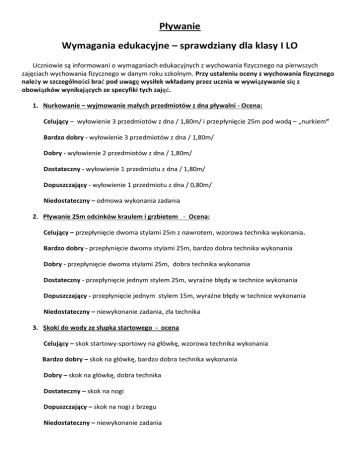 Pływanie Wymagania edukacyjne – sprawdziany dla klasy I LO Uczniowie są informowani o wymaganiach edukacyjnych z wychowania fizycznego na pierwszych zajęciach wychowania fizycznego w danym roku szkolnym. Przy ustaleniu oceny z wychowania fizycznego należy w szczególności brad pod uwagę wysiłek wkładany przez ucznia w wywiązywanie się z obowiązków wynikających ze specyfiki tych zajęd. 1. Nurkowanie – wyjmowanie małych przedmiotów z dna pływalni - Ocena: Celujący – wyłowienie 3 przedmiotów z dna / 1,80m/ i przepłynięcie 25m pod wodą – „nurkiem” Bardzo dobry - wyłowienie 3 przedmiotów z dna / 1,80m/ Dobry - wyłowienie 2 przedmiotów z dna / 1,80m/ Dostateczny - wyłowienie 1 przedmiotu z dna / 1,80m/ Dopuszczający - wyłowienie 1 przedmiotu z dna / 0,80m/ Niedostateczny – odmowa wykonania zadania 2. Pływanie 25m odcinków kraulem i grzbietem - Ocena: Celujący – przepłynięcie dwoma stylami 25m z nawrotem, wzorowa technika wykonania. Bardzo dobry - przepłynięcie dwoma stylami 25m, bardzo dobra technika wykonania Dobry - przepłynięcie dwoma stylami 25m, dobra technika wykonania Dostateczny - przepłynięcie jednym stylem 25m, wyraźne błędy w technice wykonania Dopuszczający - przepłynięcie jednym stylem 15m, wyraźne błędy w technice wykonania Niedostateczny – niewykonanie zadania, zła technika 3. Skoki do wody ze słupka startowego - ocena Celujący – skok startowy-sportowy na główkę, wzorowa technika wykonania Bardzo dobry – skok na główkę, bardzo dobra technika wykonania Dobry – skok na główkę, dobra technika Dostateczny – skok na nogi Dopuszczający – skok na nogi z brzegu Niedostateczny – niewykonanie zadania Pływanie Wymagania edukacyjne – sprawdziany dla klasy I Gimnazjum Uczniowie są informowani o wymaganiach edukacyjnych z wychowania fizycznego na pierwszych zajęciach wychowania fizycznego w danym roku szkolnym. Przy ustaleniu oceny z wychowania fizycznego należy w szczególności brad pod uwagę wysiłek wkładany przez ucznia w wywiązywanie się z obowiązków wynikających ze specyfiki tych zajęd. 1. Nurkowanie – wyjmowanie małych przedmiotów z dna pływalni - Ocena: Celujący – wyłowienie 3 przedmiotów z dna / 1,80m/ i przepłynięcie 25m pod wodą – „nurkiem” Bardzo dobry - wyłowienie 3 przedmiotów z dna / 1,80m/ Dobry - wyłowienie 2 przedmiotów z dna / 1,80m/ Dostateczny - wyłowienie 1 przedmiotu z dna / 1,80m/ Dopuszczający - wyłowienie 1 przedmiotu z dna / 0,80m/ Niedostateczny – odmowa wykonania zadania 2. Pływanie 25m odcinków kraulem i grzbietem - Ocena: Celujący – przepłynięcie dwoma stylami 25m z nawrotem, wzorowa technika wykonania. Bardzo dobry - przepłynięcie dwoma stylami 25m, bardzo dobra technika wykonania Dobry - przepłynięcie dwoma stylami 25m, dobra technika wykonania Dostateczny - przepłynięcie jednym stylem 25m, wyraźne błędy w technice wykonania Dopuszczający - przepłynięcie jednym stylem 15m, wyraźne błędy w technice wykonania Niedostateczny – niewykonanie zadania, zła technika 3. Skoki do wody ze słupka startowego - ocena Celujący – skok startowy-sportowy na główkę, wzorowa technika wykonania Bardzo dobry – skok na główkę, bardzo dobra technika wykonania Dobry – skok na główkę, dobra technika Dostateczny – skok na nogi Dopuszczający – skok na nogi z brzegu Niedostateczny – niewykonanie zadania Pływanie Wymagania edukacyjne – sprawdziany dla klasy II Gimnazjum Uczniowie są informowani o wymaganiach edukacyjnych z wychowania fizycznego na pierwszych zajęciach wychowania fizycznego w danym roku szkolnym. Przy ustaleniu oceny z wychowania fizycznego należy w szczególności brad pod uwagę wysiłek wkładany przez ucznia w wywiązywanie się z obowiązków wynikających ze specyfiki tych zajęd. 1. Pływanie 150m stylem klasycznym, dowolnym i grzbietowym z prawidłowym startem i nawrotami / po 50m / - Ocena: Celujący – przepłynięcie 150m trzema stylami z poprawnie wykonanym startem i nawrotami Bardzo dobry – przepłynięcie 150m dowolnym stylem, bardzo dobra technika Dobry – przepłynięcie 100m dowolnym stylem, dobra technika Dostateczny – przepłynięcie 50m dowolnym stylem, dobra technika Dopuszczający – przepłynięcie dowolnym stylem 15m Niedostateczny – odmowa wykonania zadania 2. Pływanie 25m stylem klasycznym - Ocena: Celujący – przepłynięcie 50m stylem klasycznym z poprawnie wykonanym nawrotem Bardzo dobry - przepłynięcie 25m stylem klasycznym, bardzo dobra technika wykonania Dobry - przepłynięcie 25m stylem klasycznym, dobra technika wykonania Dostateczny - przepłynięcie 15m stylem klasycznym, dobra technika wykonania Dopuszczający - przepłynięcie dowolnym stylem 15m Niedostateczny – niewykonanie zadania 3. Skoki do wody ze słupka startowego - ocena Celujący – skok startowy-sportowy na główkę, wzorowa technika wykonania Bardzo dobry – skok na główkę, bardzo dobra technika wykonania Dobry – skok na główkę, dobra technika Dostateczny – skok na nogi Dopuszczający – skok na nogi z brzegu Niedostateczny – niewykonanie zadania
