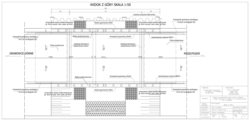 WIDOK Z GÓRY SKALA 1:50 ścianka szczelna G62 dł.6m 143,60 143,60 141,53 143,60 143,60 Krawężnik granitowy zanikający umocnienie skarp kostka betonowa gr. 6cm na pod. cem.-pias. gr10cm 14-2cm na długości 3m umocnienie skarp kostka betonowa gr. 6cm na pod. cem.-pias. gr10cm Deska gzymsowa 55x8 3% 3% Belka podporęczowa Krawężnik granitowy zanikający Krawężnik granitowy 20x20 barieroporęcz sztywna BS3/1 14-2 cm na długości 3m Płyta przejściowa dylatacja bitumicznoelastomerowa 30x10 Płyta przejściowa dylatacja bitumicznoelastomerowa 30x10 2% 2% 2% GRABOWCE GÓRNE PRZESTRZEŃ 143,94 143,97 143,97 144,01 143,94 2% 2% 2% Krawężnik granitowy 20x20 Belka podporęczowa barieroporęcz sztywna BS3/1 3% Krawężnik granitowy zanikający 14-2 cm na długości 3m Deska gzymsowa 55x8 umocnienie skarp kostka betonowa gr. 6cm na pod. cem.-pias. gr10cm narzut z głazów kamiennych o śr min. 40cm przeciw podmyciu dna rzeki i progu betonowego Krawężnik granitowy zanikający umocnienie skarp kostka betonowa gr. 6cm na pod. cem.-pias. gr10cm 14-2 cm na długości 3m
