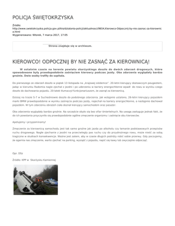 POLICJA ŚWIĘTOKRZYSKA Źródło: http://www.swietokrzyska.policja.gov.pl/kie/dzialania-policji/aktualnosci/9654,Kierowco-Odpocznij-by-nie-zasnac-za-kierownic a.html Wygenerowano: Wtorek, 7 marca 2017, 17:05 Strona znajduje się w archiwum. KIEROWCO! ODPOCZNIJ BY NIE ZASNĄĆ ZA KIEROWNICĄ! W ostatnim czasie na terenie powiatu skarżyskiego doszło do dwóch zdarzeń drogowych, które spowodowane były prawdopodobnie zaśnięciem kierowcy podczas jazdy. Oba zdarzenia wyglądały bardzo groźnie. Dwie osoby trafiły do szpitala. Do pierwszego ze zdarzeń doszło w piątek 13 listopada na „krajowej siódemce”. 20-letni kierujący dostawczym peugeotem, jadąc w kierunku Radomia nagle zjechał z jezdni i po uderzeniu w bariery energochłonne wpadł do rowu w wyniku czego doszło do dachowania pojazdu. 20-latek tłumaczył funkcjonariuszom, że zasnął za kierownicą. Dzisiaj na trasie S-7 w Suchedniowie doszło do podobnego zdarzenia. Jak wstępnie ustalono, 26-letni kierujący pojazdem marki BMW prawdopodobnie w wyniku zaśnięcia podczas jazdy, najechał na bariery energochłonne, a następnie dachował pojazdem. W tym zdarzeniu obrażeń ciała doznał kierujący samochodem oraz pasażer. Oba zdarzenia wyglądały bardzo groźnie. Na szczęście obyło się bez ofiar śmiertelnych. Na uwagę zasługuje jednak fakt, że do ich powstania przyczyniło się prawdopodobnie ogólne zmęczenie organizmu i zaśnięcie obu kierowców. Apelujemy i przypominamy! Zmęczenie za kierownicą samochodu jest tak samo groźne jak jazda po alkoholu czy łamanie podstawowych przepisów ruchu drogowego. Nagłe zjechanie z jezdni na przeciwległy pas ruchu czy do przydrożnego rowu, może nieść za sobą tragiczne w skutkach konsekwencje. Ważne jest zatem, aby w czasie długich podróży robić sobie przerwy. Gdy poczujemy, że ogarnia nas zmęczenie, warto zjechać na parking, wysiąść z pojazdu, napić się kawy lub zwyczajnie odpocząć. Opr. DSz Źródło: KPP w Skarżysku Kamiennej Ocena: 0/5 (0) Tweetnij