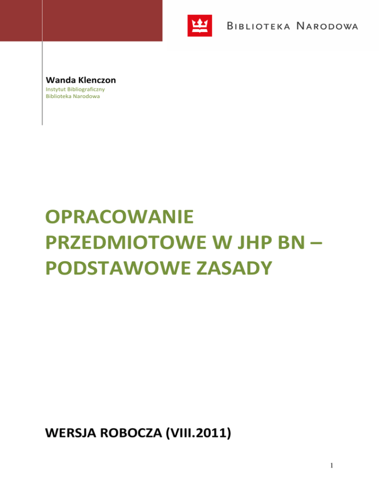 W. Klenczon, Opracowanie przedmiotowe w JHP BN podstawowe