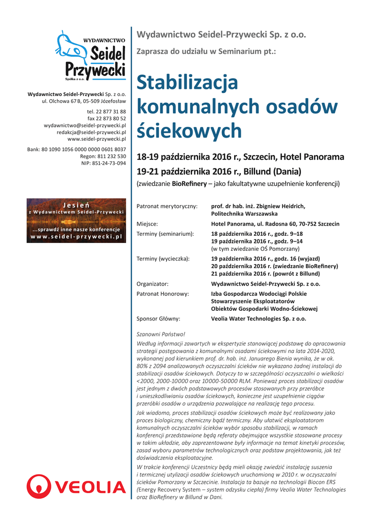 Wydawnictwo Seidel-Przywecki Sp. z o.o. Zaprasza do udziału w Seminarium pt.: Wydawnictwo Seidel-Przywecki Sp. z o.o. ul. Olchowa 67 B, 05-509 Józefosław tel. 22 877 31 88 fax 22 873 80 52 [email protected] [email protected] www.seidel-przywecki.pl Bank: 80 1090 1056 0000 0000 0601 8037 Regon: 811 232 530 NIP: 851-24-73-094 Stabilizacja komunalnych osadów ściekowych 18-19 października 2016 r., Szczecin, Hotel Panorama 19-21 października 2016 r., Billund (Dania) (zwiedzanie BioRefinery – jako fakultatywne uzupełnienie konferencji) Jesień z Wydawnictwem Seidel-Przywecki ...sprawdź inne nasze konferencje w w w.seidel - prz y wecki.pl Patronat merytoryczny: prof. dr hab. inż. Zbigniew Heidrich, Politechnika Warszawska Miejsce: Hotel Panorama, ul. Radosna 60, 70-752 Szczecin Terminy (seminarium): 18 października 2016 r., godz. 9–18 19 października 2016 r., godz. 9–14 (w tym zwiedzanie OŚ Pomorzany) Terminy (wycieczka): 19 października 2016 r., godz. 16 (wyjazd) 20 października 2016 r. (zwiedzanie BioRefinery) 21 października 2016 r. (powrót z Billund) Organizator: Wydawnictwo Seidel-Przywecki Sp. z o.o. Patronat Honorowy: Izba Gospodarcza Wodociągi Polskie Stowarzyszenie Eksploatatorów Obiektów Gospodarki Wodno-Ściekowej Sponsor Główny: Veolia Water Technologies Sp. z o.o. Szanowni Państwo! Według informacji zawartych w ekspertyzie stanowiącej podstawę do opracowania strategii postępowania z komunalnymi osadami ściekowymi na lata 2014-2020, wykonanej pod kierunkiem prof. dr. hab. inż. Januarego Bienia wynika, że w ok. 80% z 2094 analizowanych oczyszczalni ścieków nie wykazano żadnej instalacji do stabilizacji osadów ściekowych. Dotyczy to w szczególności oczyszczalni o wielkości < 2000, 2000-10 0 00 oraz 10 0 00-50 0 00 RLM. Ponieważ proces stabilizacji osadów jest jednym z dwóch podstawowych procesów stosowanych przy przeróbce i unieszkodliwianiu osadów ściekowych, konieczne jest uzupełnienie ciągów przeróbki osadów o urządzenia pozwalające na realizację tego procesu. Jak wiadomo, proces stabilizacji osadów ściekowych może być realizowany jako proces biologiczny, chemiczny bądź termiczny. Aby ułatwić eksploatatorom komunalnych oczyszczalni ścieków wybór sposobu stabilizacji, w ramach konferencji przedstawione będą referaty obejmujące wszystkie stosowane procesy w takim układzie, aby zaprezentowane były informacje na temat kinetyki procesów, zasad wyboru parametrów technologicznych oraz podstaw projektowania, jak też doświadczenia eksploatacyjne. W trakcie konferencji Uczestnicy będą mieli okazję zwiedzić instalację suszenia i termicznej utylizacji osadów ściekowych uruchomioną w 2010 r. w oczyszczalni ścieków Pomorzany w Szczecinie. Instalacja ta bazuje na technologii Biocon ERS (Energy Recovery System – system odzysku ciepła) firmy Veolia Water Technologies oraz BioRefinery w Billund w Dani. Bloki tematyczne prezentowane podczas konferencji I. Aspekty prawne przeróbki osadów ściekowych oraz nowelizacja Ustawy Prawo wodne, OZE. II. Wstępna przeróbka osadu przed spalaniem. III. Przegląd metod przeróbki osadu stosowanych w Polsce, modelowe rozwiązania w gospodarce osadowej z wyszczególnieniem jakie metody najlepiej stosować w aspekcie wielkości oczyszczalni i jakości osadów ściekowych. IV.Przygotowanie specyfikacji przetargowych na projektowanie i dobór urządzeń. V.Odzysk energii z osadu (kogeneracja i inne procesy). Opisy zwiedzanych instalacji Instalacja suszenia i termicznego przekształcania osadów ściekowych w Oczyszczalni Ścieków Pomorzany (19 października 2016 r.) Wybudowana instalacja suszenia i termicznej utylizacji osadów ściekowych przyjmuje osady odwodnione z Oczyszczalni Pomorzany oraz osady wysuszone dowożone z Oczyszczalni Ścieków Zdroje. Instalacja bazuje na technologii Biocon ERS (Energy Recovery System – system odzysku ciepła), prod. Veolia. W Oczyszczalni „Pomorzany” zainstalowano dwie linie do suszenia taśmowego o wydajności 1965 kg/h mokrego osadu o zawartości 25% s.m., co odpowiada 2890 kg odparowanej wody na godzinę. W procesie spalania osadów zastosowano kotły z rusztem mechanicznym w układzie dwóch linii o przepustowości 756 kg/h osadu zawierającego 90% s.m. Energia cieplna z procesu spalania jest wykorzystywana do efektywnego prowadzenia procesu suszenia osadów. Proces jest autotermiczny. Popioły powstałe w procesie spalania osadu są składowane w pojemnikach, a następnie wywożone w kontenerach do dalszego zagospodarowania. System oczyszczania gazów spalinowych metodą suchą obejmuje dawkowanie węgla aktywnego i wodorowęglanu w reaktorze a następnie oczyszczanie na elektrofiltrach. Oczyszczalnia Ścieków Pomorzany została nagrodzona w kategorii obiektów inżynieryjnych (nagroda I stopnia) i tytułem „Budowa Roku 2010”. Billund BioRefinery (20 października 2016 r.) Wspólny projekt – zrealizowany we współpracy pomiędzy firmą Krüger A/S (Veolia), gminą Billund a spółką użyteczności publicznej Billund Vand A/S – jest wzorem zastosowania komplementarnych najnowocześniejszych technologii oczyszczania ścieków i biomasy, które mogą pracować w synergii. Instalacja będzie oczyszczać ścieki w ilości odpowiadającej 70 000 RLM i 4200 ton odpadów organicznych rocznie, pochodzące z gospodarstw domowych i przemysłu w rejonie Billund. Zastosowanie zielonych technologii pozwoliło przekształcić oczyszczalnię ścieków w nowoczesną biorafinerię, która ze ścieków i odpadów produkuje czystą wodę i energię. Na instalacji zastosowano szereg technologii: • Exelys™ – technologia ciągłej hydrolizy termicznej, zmniejszająca ilość osadu poprzez ulepszoną fermentację i odwadnianie, przy jednoczesnym zwiększeniu produkcji biogazu o 20÷40%. • STAR Utility Solutions™ – zaawansowany system sterowania procesem on-line, zapewniający optymalne oczyszczanie przy zminimalizowanym zużyciu