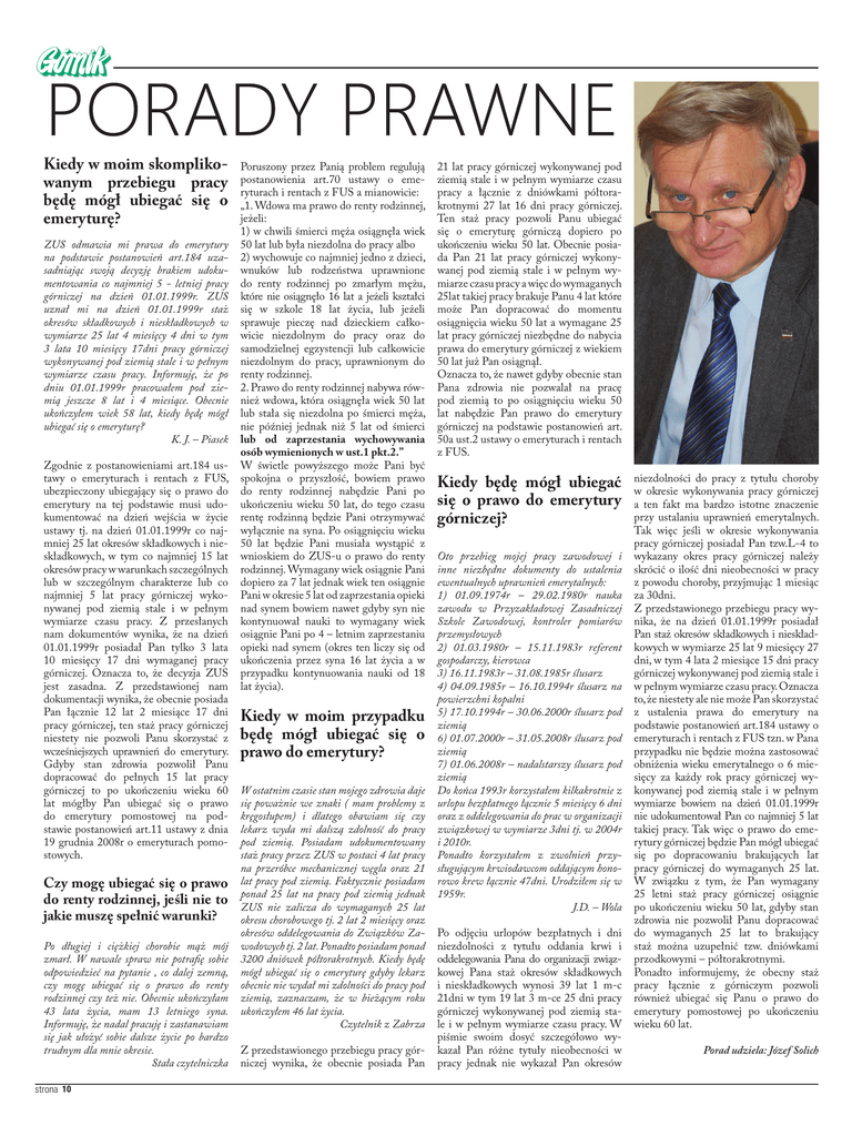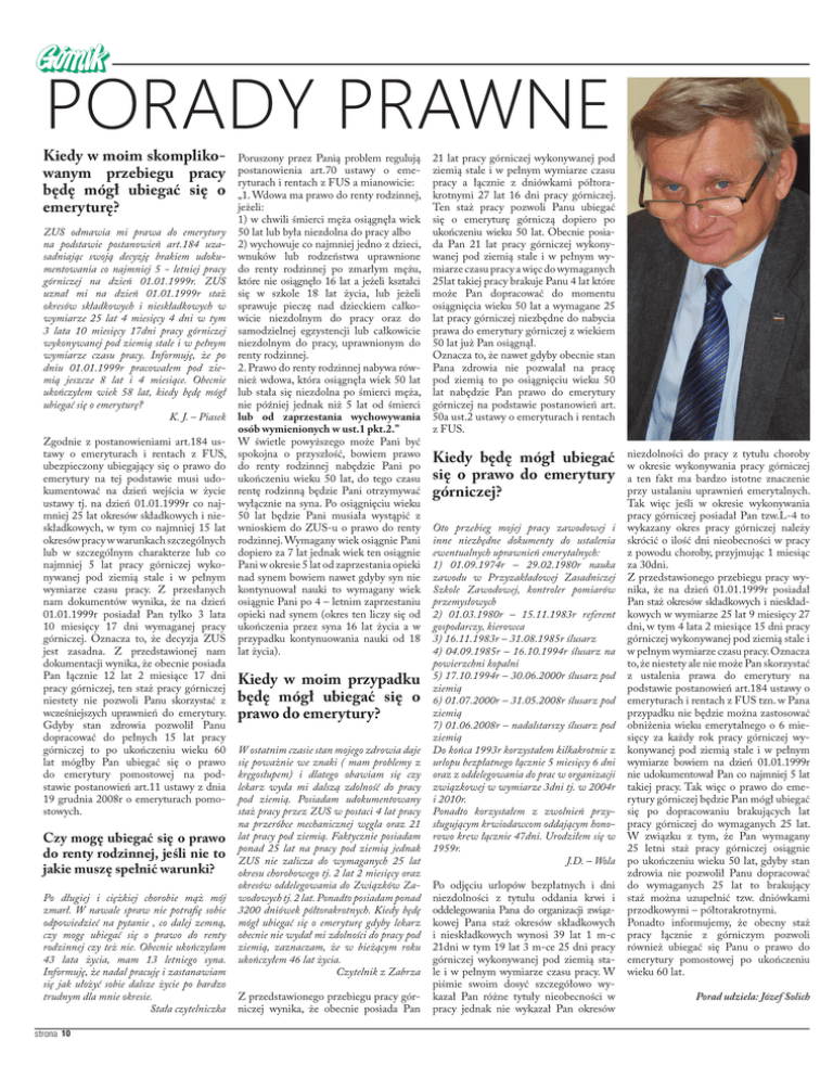 Kiedy w moim skomplikowanym przebiegu pracy będę mógł ubiegać się o emeryturę? ZUS odmawia mi prawa do emerytury na podstawie postanowień art.184 uzasadniając swoją decyzję brakiem udokumentowania co najmniej 5 - letniej pracy górniczej na dzień 01.01.1999r. ZUS uznał mi na dzień 01.01.1999r staż okresów składkowych i nieskładkowych w wymiarze 25 lat 4 miesięcy 4 dni w tym 3 lata 10 miesięcy 17dni pracy górniczej wykonywanej pod ziemią stale i w pełnym wymiarze czasu pracy. Informuję, że po dniu 01.01.1999r pracowałem pod ziemią jeszcze 8 lat i 4 miesiące. Obecnie ukończyłem wiek 58 lat, kiedy będę mógł ubiegać się o emeryturę? K. J. – Piasek Zgodnie z postanowieniami art.184 ustawy o emeryturach i rentach z FUS, ubezpieczony ubiegający się o prawo do emerytury na tej podstawie musi udokumentować na dzień wejścia w życie ustawy tj. na dzień 01.01.1999r co najmniej 25 lat okresów składkowych i nieskładkowych, w tym co najmniej 15 lat okresów pracy w warunkach szczególnych lub w szczególnym charakterze lub co najmniej 5 lat pracy górniczej wykonywanej pod ziemią stale i w pełnym wymiarze czasu pracy. Z przesłanych nam dokumentów wynika, że na dzień 01.01.1999r posiadał Pan tylko 3 lata 10 miesięcy 17 dni wymaganej pracy górniczej. Oznacza to, że decyzja ZUS jest zasadna. Z przedstawionej nam dokumentacji wynika, że obecnie posiada Pan łącznie 12 lat 2 miesiące 17 dni pracy górniczej, ten staż pracy górniczej niestety nie pozwoli Panu skorzystać z wcześniejszych uprawnień do emerytury. Gdyby stan zdrowia pozwolił Panu dopracować do pełnych 15 lat pracy górniczej to po ukończeniu wieku 60 lat mógłby Pan ubiegać się o prawo do emerytury pomostowej na podstawie postanowień art.11 ustawy z dnia 19 grudnia 2008r o emeryturach pomostowych. Czy mogę ubiegać się o prawo do renty rodzinnej, jeśli nie to jakie muszę spełnić warunki? Po długiej i ciężkiej chorobie mąż mój zmarł. W nawale spraw nie potrafię sobie odpowiedzieć na pytanie , co dalej zemną, czy mogę ubiegać się o prawo do renty rodzinnej czy też nie. Obecnie ukończyłam 43 lata życia, mam 13 letniego syna. Informuję, że nadal pracuję i zastanawiam się jak ułożyć sobie dalsze życie po bardzo trudnym dla mnie okresie. Stała czytelniczka strona 10 Poruszony przez Panią problem regulują postanowienia art.70 ustawy o emeryturach i rentach z FUS a mianowicie: „1. Wdowa ma prawo do renty rodzinnej, jeżeli: 1) w chwili śmierci męża osiągnęła wiek 50 lat lub była niezdolna do pracy albo 2) wychowuje co najmniej jedno z dzieci, wnuków lub rodzeństwa uprawnione do renty rodzinnej po zmarłym mężu, które nie osiągnęło 16 lat a jeżeli kształci się w szkole 18 lat życia, lub jeżeli sprawuje pieczę nad dzieckiem całkowicie niezdolnym do pracy oraz do samodzielnej egzystencji lub całkowicie niezdolnym do pracy, uprawnionym do renty rodzinnej. 2. Prawo do renty rodzinnej nabywa również wdowa, która osiągnęła wiek 50 lat lub stała się niezdolna po śmierci męża, nie później jednak niż 5 lat od śmierci lub od zaprzestania wychowywania osób wymienionych w ust.1 pkt.2.” W świetle powyższego może Pani być spokojna o przyszłość, bowiem prawo do renty rodzinnej nabędzie Pani po ukończeniu wieku 50 lat, do tego czasu rentę rodzinną będzie Pani otrzymywać wyłącznie na syna. Po osiągnięciu wieku 50 lat będzie Pani musiała wystąpić z wnioskiem do ZUS-u o prawo do renty rodzinnej. Wymagany wiek osiągnie Pani dopiero za 7 lat jednak wiek ten osiągnie Pani w okresie 5 lat od zaprzestania opieki nad synem bowiem nawet gdyby syn nie kontynuował nauki to wymagany wiek osiągnie Pani po 4 – letnim zaprzestaniu opieki nad synem (okres ten liczy się od ukończenia przez syna 16 lat życia a w przypadku kontynuowania nauki od 18 lat życia). Kiedy w moim przypadku będę mógł ubiegać się o prawo do emerytury? W ostatnim czasie stan mojego zdrowia daje się poważnie we znaki ( mam problemy z kręgosłupem) i dlatego obawiam się czy lekarz wyda mi dalszą zdolność do pracy pod ziemią. Posiadam udokumentowany staż pracy przez ZUS w postaci 4 lat pracy na przeróbce mechanicznej węgla oraz 21 lat pracy pod ziemią. Faktycznie posiadam ponad 25 lat na pracy pod ziemią jednak ZUS nie zalicza do wymaganych 25 lat okresu chorobowego tj. 2 lat 2 miesięcy oraz okresów oddelegowania do Związków Zawodowych tj. 2 lat. Ponadto posiadam ponad 3200 dniówek półtorakrotnych. Kiedy będę mógł ubiegać się o emeryturę gdyby lekarz obecnie nie wydał mi zdolności do pracy pod ziemią, zaznaczam, że w bieżącym roku ukończyłem 46 lat życia. Czytelnik z Zabrza Z przedstawionego przebiegu pracy górniczej wynika, że obecnie posiada Pan 21 lat pracy górniczej wykonywanej pod ziemią stale i w pełnym wymiarze czasu pracy a łącznie z dniówkami półtorakrotnymi 27 lat 16 dni pracy górniczej. Ten staż pracy pozwoli Panu ubiegać się o emeryturę górniczą dopiero po ukończeniu wieku 50 lat. Obecnie posiada Pan 21 lat pracy górniczej wykonywanej pod ziemią stale i w pełnym wymiarze czasu pracy a więc do wymaganych 25lat takiej pracy brakuje Panu 4 lat które może Pan dopracować do momentu osiągnięcia wieku 50 lat a wymagane 25 lat pracy górniczej niezbędne do nabycia prawa do emerytury górniczej z wiekiem 50 lat już Pan osiągnął. Oznacza to, że nawet gdyby obecnie stan Pana zdrowia nie pozwalał na pracę pod ziemią to po osiągnięciu wieku 50 lat nabędzie Pan prawo do emerytury górniczej na podstawie postanowień art. 50a ust.2 ustawy o emeryturach i rentach z FUS. Kiedy będę mógł ubiegać się o prawo do emerytury górniczej? Oto przebieg mojej pracy zawodowej i inne niezbędne dokumenty do ustalenia ewentualnych uprawnień emerytalnych: 1) 01.09.1974r – 29.02.1980r nauka zawodu w Przyzakładowej Zasadniczej Szkole Zawodowej, kontroler pomiarów przemy