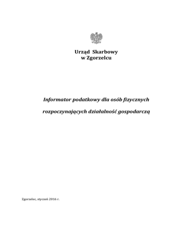 Urząd Skarbowy w Zgorzelcu Informator podatkowy dla osób fizycznych rozpoczynających działalność gospodarczą Zgorzelec, styczeń 2016 r. Urząd Skarbowy w Zgorzelcu Urząd Skarbowy w Zgorzelcu - podstawowe informacje: adres: 59-900 Zgorzelec ul. Bohaterów II Armii Wojska Polskiego 8B telefon: informacja – 75 64 94 888 lub 75 64 94 889 sekretariat – 75 64 94 800 faks: 75 64 94 890 strona internetowa: www.wroclaw.apodatkowa.gov.pl/urzad-skarbowy-w-zgorzelcu Facebook: https://www.facebook.com/uszgorzelec e-mail: [email protected] Godziny funkcjonowania: 7.30 – 18.00 - poniedziałek, 7.30 – 15.30 - od wtorku do piątku. Obsługa podatnika prowadzona jest na parterze urzędu, gdzie m.in. można: pobrać i złożyć stosowne deklaracje, złożyć pisma i podania, odebrać zaświadczenia o przychodach i dochodach oraz o stanie zobowiązań podatkowych (tzw. zaświadczenie o braku zaległości), uzyskać podstawowe informacje. Wybrane komórki organizacyjne: Referat Obsługi Bieżącej – tel. 75 64 94 823; Referat Czynności Sprawdzających - tel. 75 64 94 807; Dział Postępowań Podatkowych – tel. 75 64 94 870; Dział Rachunkowości – tel. 75 64 94 879; Dział Egzekucji Administracyjnej – tel. 75 64 94 851; Referat Kontroli Podatkowej – tel. 75 64 94 860; Referat Spraw Wierzycielskich – tel. 75 64 94 804; Sekretariat – tel. 75 64 94 800. Numery rachunków bankowych: Narodowy Bank Polski Oddział Okręgowy we Wrocławiu: 43 1010 1674 0012 5422 2100 0000 - podatek dochodowy od osób prawnych 90 1010 1674 0012 5422 2200 0000 - podatek od towarów i usług 40 1010 1674 0012 5422 2300 0000 - podatek dochodowy od osób fizycznych, 85 1010 0055 0200 2310 0007 0000 - karta podatkowa, podatek od czynności cywilnoprawnych, podatek od spadków i darowizn, 34 1010 1674 0012 5422 2700 0000 - pozostałe dochody z tytułu dochodów podatkowych i niepodatkowych należności budżetowych. Wpłat należy dokonywać w bankach lub w placówkach pocztowych. Informator dla osób fizycznych rozpoczynających działalność gospodarczą – 2016 r. 2 Urząd Skarbowy w Zgorzelcu Rejestracja działalności gospodarczej Numer Identyfikacji Podatkowej Przedsiębiorcą - w rozumieniu ustawy z dnia 2 lipca 2004 r. o swobodzie działalności gospodarczej - jest osoba fizyczna, osoba prawna i jednostka organizacyjna niebędąca osobą prawną, której odrębna ustawa przyznaje zdolność prawną - wykonująca we własnym imieniu działalność gospodarczą. Za przedsiębiorców uznaje się także wspólników spółki cywilnej w zakresie wykonywanej przez nich działalności gospodarczej. Rejestracja działalności gospodarczej przez osoby fizyczne na zasadach uregulowanych w powołanej ustawie dokonywana jest w Centralnej Ewidencji i Informacji o Działalności Gospodarczej (CEIDG). Rozpoczynając działalność gospodarczą należy m.in. dokonać rejestracji w urzędzie gminy (właściwy urząd miasta, urząd gminy lub urząd miasta i gminy) składając formularz rejestracyjny o symbolu CEIDG-1 wraz ze stosownymi załącznikami. Podstawowe przepisy Ustawa z dnia 13 października 1995 r. o zasadach ewidencji i identyfikacji podatników i płatników (Dz. U. z 2012 r. poz. 1314 z późn. zm.) Ustawa z dnia 2 lipca 2004 r. o swobodzie działalności gospodarczej (Dz. U. z 2015 poz. 584 z późn. zm.) Ustawa z dnia 2 lipca 2004 r. Przepisy wprowadzające ustawę o swobodzie działalności gospodarczej (Dz. U. Nr 173, poz. 1808 z późn. zm.) Rozporządzenie Ministra Finansów z dnia 25 listopada 2014 r. w sprawie wzorów formularzy zgłoszeń identyfikacyjnych i zgłoszeń aktualizacyjnych oraz zgłoszeń w zakresie danych uzupełniających (Dz. U. poz. 1665 z późn. zm.) Ustawa z dnia 11 marca 2004 r. o podatku od towarów i usług (Dz. U. z 2011 r. Nr 177, poz. 1054 z późn. zm.) Formularz CEIDG-1, jest jednocześnie: wnioskiem o wpis do CEIDG; wnioskiem o wpis do rejestru REGON; zgłoszeniem identyfikacyjnym lub aktualizacyjnym dla potrzeb podatkowych; zgłoszeniem do ZUS. Wniosek CEIDG - 1 składa się: elektronicznie – bezpośrednio do CEIDG (przedsiębiorca podpisuje wniosek profilem zaufanym bądź bezpiecznym podpisem elektronicznym z ważnym certyfikatem) w formie papierowej – w dowolnej gminie w Polsce – osobiście. Wniosek może zostać przesłany pocztą jednakże w takim wypadku podpis przedsiębiorcy musi zostać poświadczony notarialnie. Zgłoszenie do CEIDG oraz aktualizacja danych są nieodpłatne. W związku z uproszczeniem procedur związanych z rejestracją działalności gospodarczej składany wniosek o wpis do Centralnej Ewidencji i Informacji o Działalności Gospodarczej (CEIDG) będzie jednocześnie wnioskiem o wpis do krajowego rejestru urzędowego podmiotów gospodarki narodowej (REGON), zgłoszeniem identyfikacyjnym, bądź aktualizacyjnym, kierowanym do naczelnika właściwego urzędu skarbowego oraz zgłoszeniem płatnika składek albo jego zmiany do ZUS/KRUS. W związku z tym CEIDG będzie zobowiązana do przekazania danych z wniosku pozostałym instytucjom. 3 Informator dla osób fizycznych rozpoczynających działalność gospodarczą – 2016 r. Urząd Skarbowy w Zgorzelcu W przypadku prowadzenia działalności gospodarczej w formie spółki cywilnej, każdy wspólnik rejestruje się osobno – w urzędzie gminy/miasta. Składając takie zgłoszenie przedsiębiorca powinien pamiętać o wskazaniu naczelnika urzędu skarbowego, który jest właściwy do obsługi wniosku. Właściwość organów w tym wypadku ocenia się w sposób następujący: jeśli przedsiębiorca jest podatnikiem podatku od towarów i usług – dla potrzeb ewidencji właściwy jest organ właściwy ze względu na podatek od towarów i usług, jeśli przedsiębiorca nie jest podatnikiem podatku od towarów i usług – organem właściwym dla potrzeb ewidencji jest naczelnik urzędu skarbowego właściwy wg ustawy o podatku dochodowym od osób fizycznych. Numer Identyfikacji Podatkowe