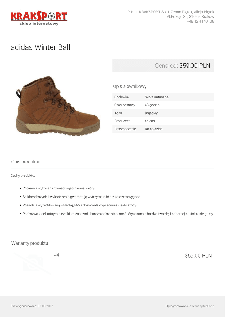 P.H.U. KRAKSPORT Sp.J. Zenon Piętak, Alicja Piętak Al.Pokoju 32, 31-564 Kraków +48 12 4140108 adidas Winter Ball Cena od: 359,00 PLN Opis słownikowy Cholewka Skóra naturalna Czas dostawy 48 godzin Kolor Brązowy Producent adidas Przeznaczenie Na co dzień Opis produktu Cechy produktu: Cholewka wykonana z wysokogatunkowej skóry. Solidne obszycia i wykończenia gwarantują wytrzymałość a z zarazem wygodę. Posiadają wyprofilowaną wkładkę, która doskonale dopasowuje się do stopy. Podeszwa z delikatnym bieżnikiem zapewnia bardzo dobrą stabilność. Wykonana z bardzo twardej i odpornej na ścieranie gumy. Warianty produktu 44 Plik wygenerowano: 07-03-2017 359,00 PLN Oprogramowanie sklepu: AptusShop P.H.U. KRAKSPORT Sp.J. Zenon Piętak, Alicja Piętak Al.Pokoju 32, 31-564 Kraków +48 12 4140108 Galeria Plik wygenerowano: 07-03-2017 Powered by TCPDF (www.tcpdf.org) Oprogramowanie sklepu: AptusShop