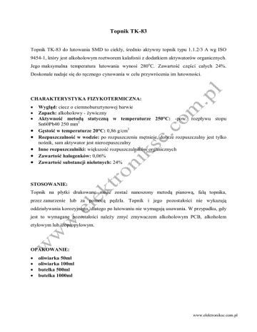 Topnik TK-83 Topnik TK-83 do lutowania SMD to ciekły, średnio aktywny topnik typu 1.1.2/3 A wg ISO 9454-1, który jest alkoholowym roztworem kalafonii z dodatkiem aktywatorów organicznych. Jego maksymalna temperatura lutowania wynosi 280oC. Zawartość części całych 24%. Doskonale nadaje się do ręcznego cynowania w celu przywrócenia im lutowności. CHARAKTERYSTYKA FIZYKOTERMICZNA: Wygląd: ciecz o ciemnobursztynowej barwie Zapach: alkoholowy - żywiczny Aktywność metodą statyczną w temperaturze 250°C: -pow. rozpływu stopu Sn60Pb40 250 mm2 Gęstość w temperaturze 20°C: 0,86 g/cm3 Rozpuszczalność w wodzie: po rozpuszczeniu mętnieje, dobrze rozpuszczalny jest tylko nośnik, sam aktywator jest nierozpuszczalny Inne rozpuszczalniki: większość rozpuszczalników organicznych Zawartość halogenków: 0,06% Zawartość substancji nielotnych: 24% STOSOWANIE: Topnik na płytki drukowane może zostać nanoszony metodą pianową, falą topnika, przez zanurzenie lub za pomocą pędzla. Topnik i jego pozostałości nie wykazują oddziaływania korozyjnego, dlatego po lutowaniu nie wymagają usuwania. W przypadku, gdy jest to wymagane pozostałości należy zmyć zmywaczem alkoholowym PCB, alkoholem etylowym lub izopropylowym. OPAKOWANIE: oliwiarka 50ml oliwiarka 100ml butelka 500ml butelka 1000ml www.elektroniksc.com.pl