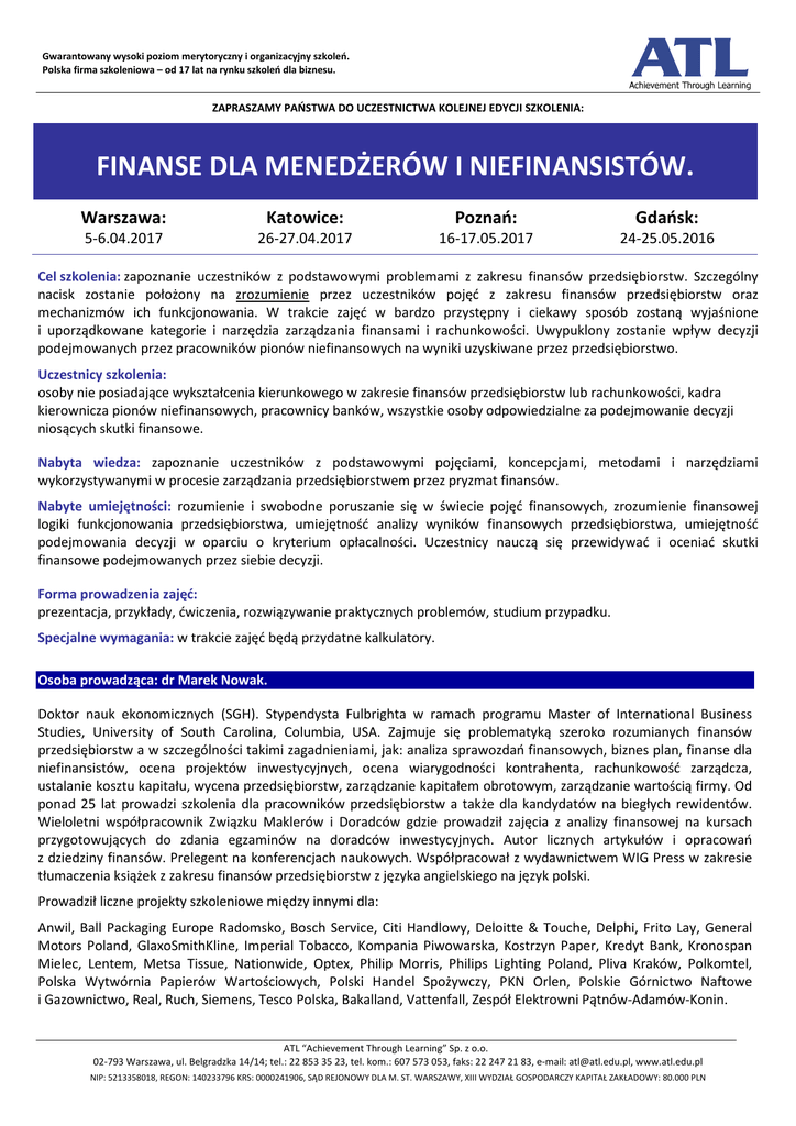 Gwarantowany wysoki poziom merytoryczny i organizacyjny szkoleń. Polska firma szkoleniowa – od 17 lat na rynku szkoleń dla biznesu. ZAPRASZAMY PAŃSTWA DO UCZESTNICTWA KOLEJNEJ EDYCJI SZKOLENIA: FINANSE DLA MENEDŻERÓW I NIEFINANSISTÓW. Warszawa: Katowice: Poznań: Gdańsk: 5-6.04.2017 26-27.04.2017 16-17.05.2017 24-25.05.2016 Cel szkolenia: zapoznanie uczestników z podstawowymi problemami z zakresu finansów przedsiębiorstw. Szczególny nacisk zostanie położony na zrozumienie przez uczestników pojęć z zakresu finansów przedsiębiorstw oraz mechanizmów ich funkcjonowania. W trakcie zajęć w bardzo przystępny i ciekawy sposób zostaną wyjaśnione i uporządkowane kategorie i narzędzia zarządzania finansami i rachunkowości. Uwypuklony zostanie wpływ decyzji podejmowanych przez pracowników pionów niefinansowych na wyniki uzyskiwane przez przedsiębiorstwo. Uczestnicy szkolenia: osoby nie posiadające wykształcenia kierunkowego w zakresie finansów przedsiębiorstw lub rachunkowości, kadra kierownicza pionów niefinansowych, pracownicy banków, wszystkie osoby odpowiedzialne za podejmowanie decyzji niosących skutki finansowe. Nabyta wiedza: zapoznanie uczestników z podstawowymi pojęciami, koncepcjami, metodami i narzędziami wykorzystywanymi w procesie zarządzania przedsiębiorstwem przez pryzmat finansów. Nabyte umiejętności: rozumienie i swobodne poruszanie się w świecie pojęć finansowych, zrozumienie finansowej logiki funkcjonowania przedsiębiorstwa, umiejętność analizy wyników finansowych przedsiębiorstwa, umiejętność podejmowania decyzji w oparciu o kryterium opłacalności. Uczestnicy nauczą się przewidywać i oceniać skutki finansowe podejmowanych przez siebie decyzji. Forma prowadzenia zajęć: prezentacja, przykłady, ćwiczenia, rozwiązywanie praktycznych problemów, studium przypadku. Specjalne wymagania: w trakcie zajęć będą przydatne kalkulatory. Osoba prowadząca: dr Marek Nowak. Doktor nauk ekonomicznych (SGH). Stypendysta Fulbrighta w ramach programu Master of International Business Studies, University of South Carolina, Columbia, USA. Zajmuje się problematyką szeroko rozumianych finansów przedsiębiorstw a w szczególności takimi zagadnieniami, jak: analiza sprawozdań finansowych, biznes plan, finanse dla niefinansistów, ocena projektów inwestycyjnych, ocena wiarygodności kontrahenta, rachunkowość zarządcza, ustalanie kosztu kapitału, wycena przedsiębiorstw, zarządzanie kapitałem obrotowym, zarządzanie wartością firmy. Od ponad 25 lat prowadzi szkolenia dla pracowników przedsiębiorstw a także dla kandydatów na biegłych rewidentów. Wieloletni współpracownik Związku Maklerów i Doradców gdzie prowadził zajęcia z analizy finansowej na kursach przygotowujących do zdania egzaminów na doradców inwestycyjnych. Autor licznych artykułów i opracowań z dziedziny finansów. Prelegent na konferencjach naukowych. Współpracował z wydawnictwem WIG Press w zakresie tłumaczenia książek z zakresu finansów przedsiębiorstw z języka angielskiego na język polski. Prowadził liczne projekty szkoleniowe między innymi dla: Anwil, Ball Packaging Europe Radomsko, Bosch Service, Citi Handlowy, Deloitte & Touche, Delphi, Frito Lay, General Motors Poland, GlaxoSmithKline, Imperial Tobacco, Kompania Piwowarska, Kostrzyn Paper, Kredyt Bank, Kronospan Mielec, Lentem, Metsa Tissue, Nationwide, Optex, Philip Morris, Philips Lighting Poland, Pliva Kraków, Polkomtel, Polska Wytwórnia Papierów Wartościowych, Polski Handel Spożywczy, PKN Orlen, Polskie Górnictwo Naftowe i Gazownictwo, Real, Ruch, Siemens, Tesco Polska, Bakalland, Vattenfall, Zespół Elektrowni Pątnów-Adamów-Konin. ATL “Achievement Through Learning” Sp. z o.o. 02-793 Warszawa, ul. Belgradzka 14/14; tel.: 22 853 35 23, tel. kom.: 607 573 053, faks: 22 247 21 83, e-mail: [email protected], www.atl.edu.pl NIP: 5213358018, REGON: 140233796 KRS: 0000241906, SĄD REJONOWY DLA M. ST. WARSZAWY, XIII WYDZIAŁ GOSPODARCZY KAPITAŁ ZAKŁADOWY: 80.000 PLN Gwarantowany wysoki poziom merytoryczny i organizacyjny szkoleń. Polska firma szkoleniowa – od 17 lat na rynku szkoleń dla biznesu. PROGRAM SZKOLENIA: 1. PODSTAWOWE POJĘCIA FINANSÓW. • • • • • • • • Cele działalności przedsiębiorstwa. Podstawowe pojęcia rachunkowości i finansów. Metody i zasady rachunkowości. Bilans – szczegółowe omówienie. Rachunek zysków i strat – szczegółowe omówienie. Rachunek przepływów pieniężnych (Cash flow) – szczegółowe omówienie. Amortyzacja – pojęcie i zasady obliczania, wpływ na wyniki finansowe przedsiębiorstwa. Mechanizm korzyści podatkowej – efekt podatkowy kosztów. 2. OCENA WIARYGODNOŚCI PRZEDSIĘBIORSTWA – PODSTAWY. • • • • • • Ocena przedsiębiorstwa na podstawie analizy wskaźnikowej. Wskaźniki rentowności. Wskaźniki płynności. Wskaźniki efektywności. Wskaźniki zadłużenia. Analiza metodą Du Ponta. 3. JAK POWSTAJE ZYSK? • • • • • • • • • Klasyfikacja kosztów w przedsiębiorstwie. Próg rentowności. Pojęcie jednostkowej marży brutto. Zastosowanie progu rentowności do podejmowania decyzji. Podejmowanie decyzji w oparciu o jednostkową marżę brutto. Znaczenie struktury asortymentowej sprzedaży. Wrażliwość przedsiębiorstwa na wahania koniunktury na rynku – dźwignia operacyjna. Wrażliwość przedsiębiorstwa na zaciąganie zobowiązań – dźwignia finansowa. Finansowanie kapitałem własnym a obcym. 4. PODEJMOWANIE DECYZJI KRÓTKOTERMINOWYCH W PRZEDSIĘBIORSTWIE. • • • • • • • Kapitał obrotowy i cykl operacyjny. System zarządzania należnościami. Obliczanie kosztu należności. Rodzaje polityki kredytowania odbiorców. Zarządzanie zobowiązaniami. Obliczanie kosztu kredytu kupieckiego. Utrzymywanie płynności finansowej. 5. PROCES TWORZENIA WARTOŚCI W PRZEDSIĘBIORSTWIE. • • • • Ekonomiczna wartość dodana (EVA). Koszt k